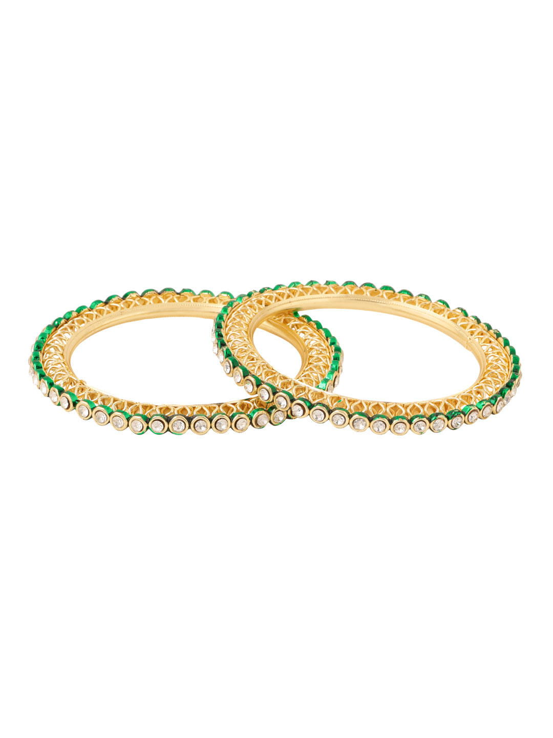 Style Note: Add A Royal Touch To Your Festive Ensemble With The Nvr Women’S Set Of 2 Gold Plated Green Kundan Studded Bangles. Embellished With Rich Green Kundan Stones And Finished In A Radiant Gold Tone, These Bangles Exude Classic Elegance And Regal Charm. Ideal For Weddings, Festivals, And Special Occasions, They Beautifully Complement Traditional Attire Like Sarees, Lehengas, And Salwar Suits. Wear Them As A Refined Pair Or Layer Them With Other Bangles For A Luxurious, Statement-Making Look.
