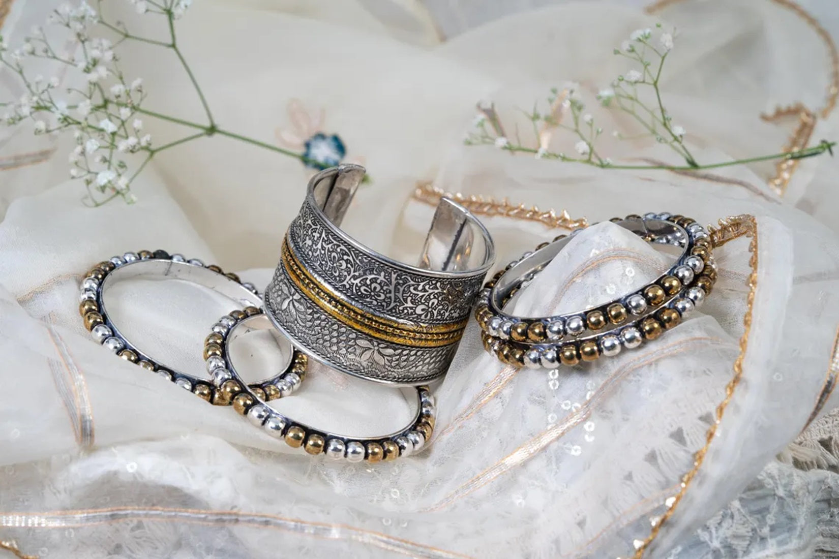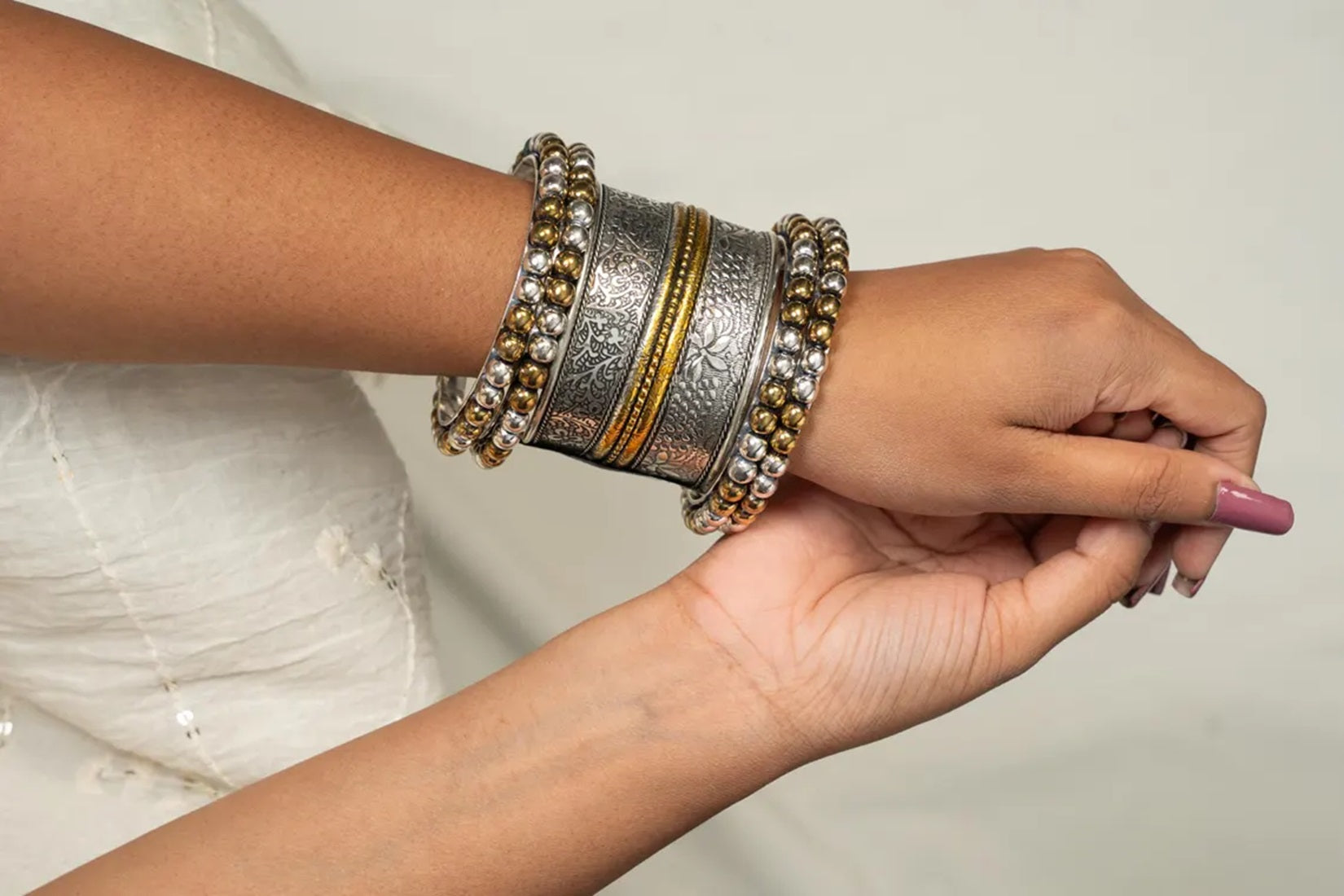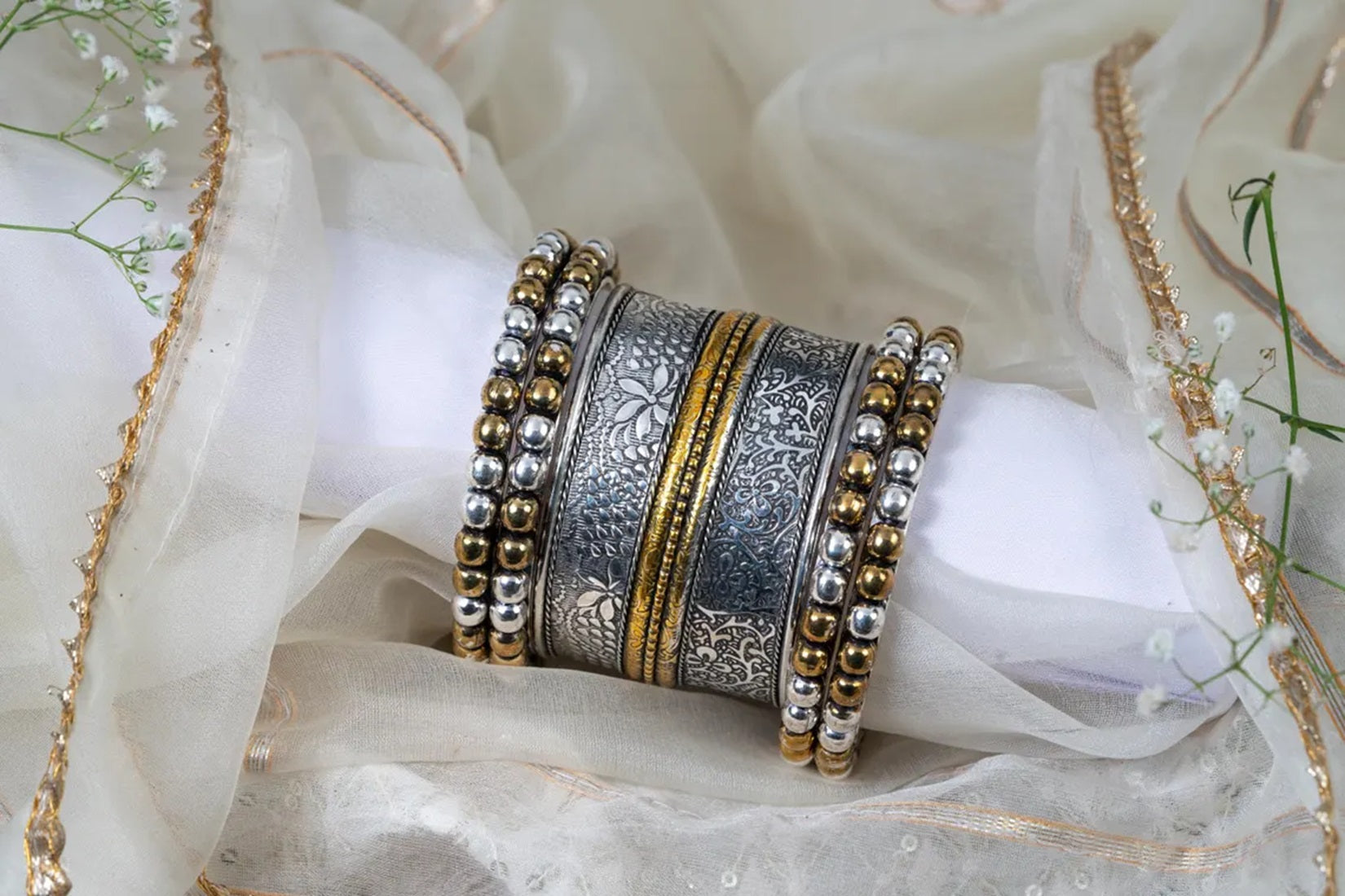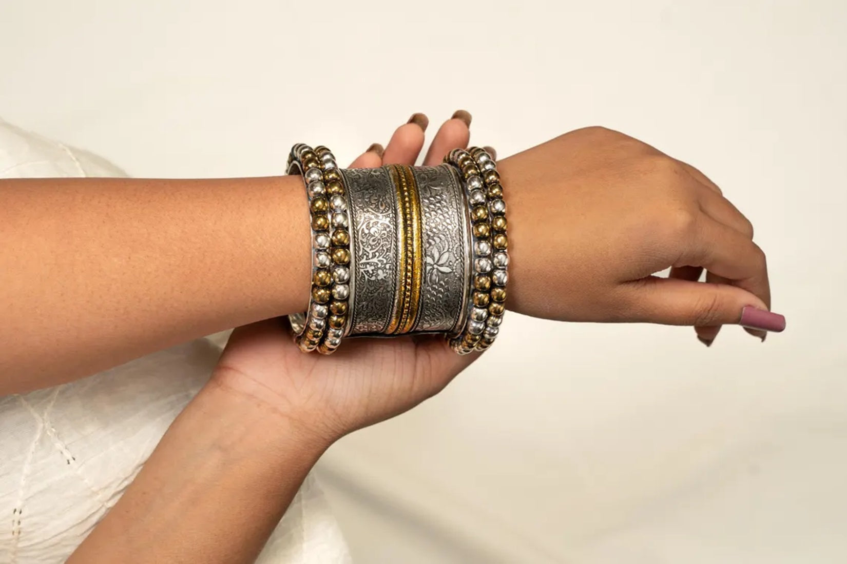 Adorn Your Wrists With This Stylish Cuff Bracelet, That Boasts Of Intricate Embossing Work And Impeccable Details. The Cuff Bracelet Is An Extremely Wearable Piece Of Jewellery You’D Want To Dress Your Wrists With On Daily Basis. The Neutral And Cherished Tones Of Silver And Golden Coating Make It An Easy To Style Piece That Looks Wonderful By Itself And Also Makes For An Interesting Stacking Element.
