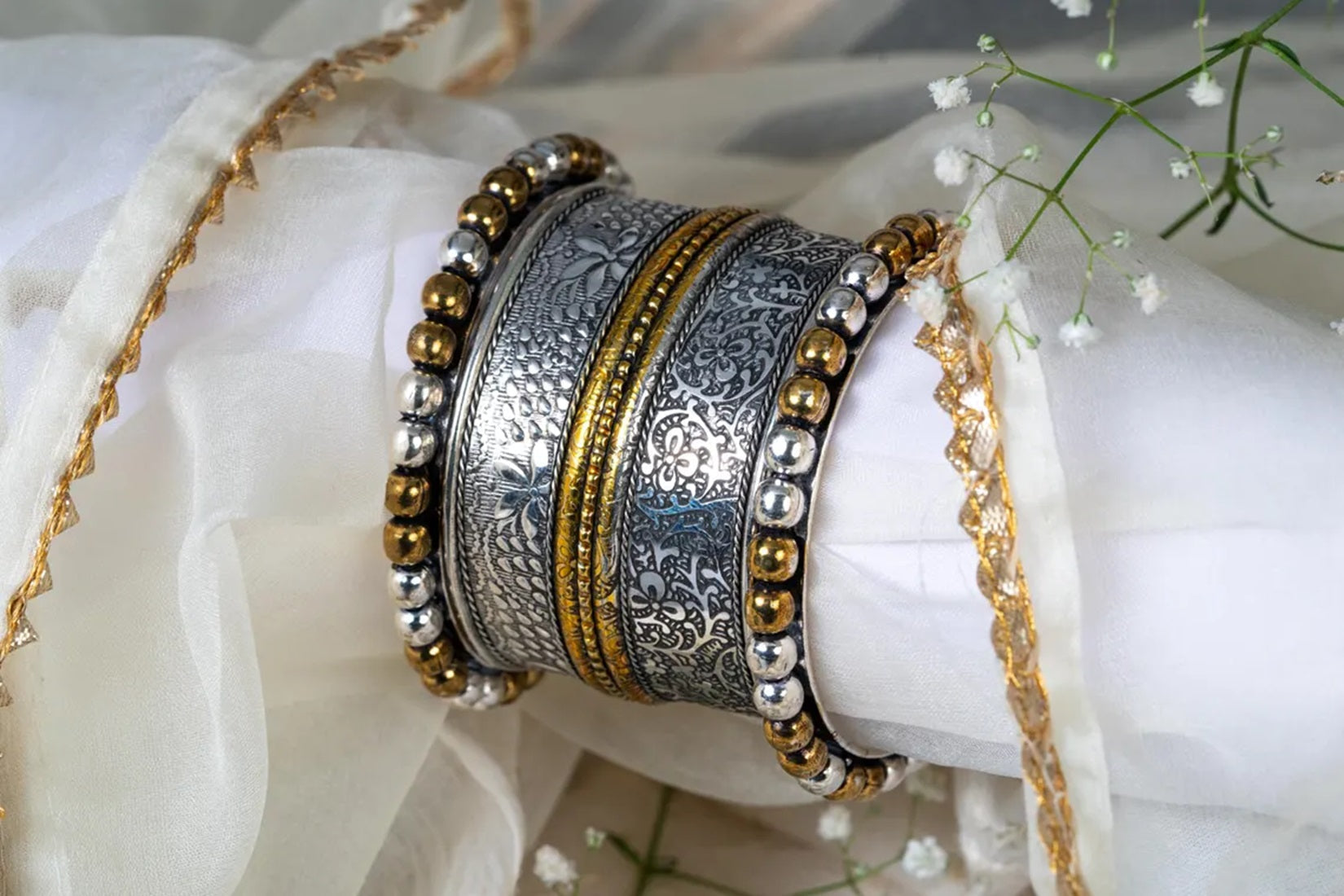 This Piece Has A Adjustable Dual Tone Hand Cuff With Dual Tone Bangdi On Both Side.
