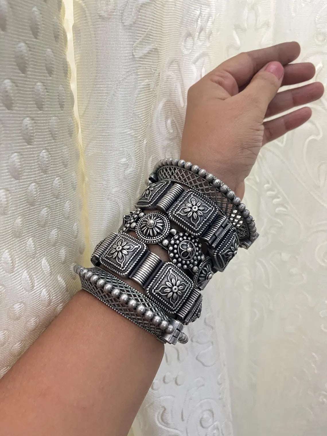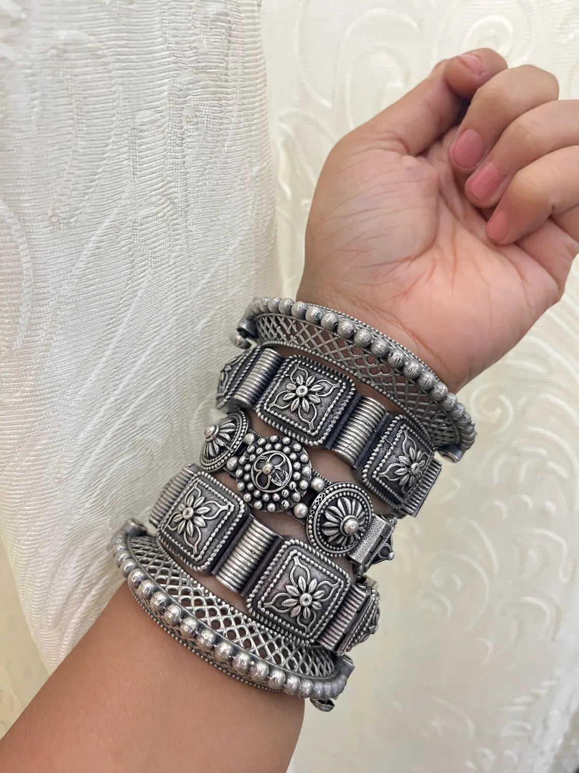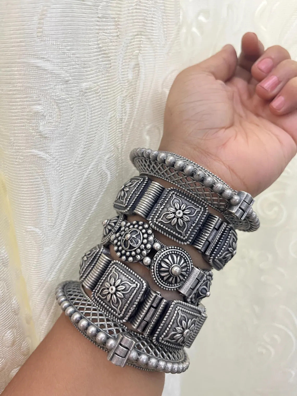 Kada Set Of 5 Antique Bangle Indian Hand Jewellery Silver Plated Hand Kada Bracelet Silver Look Openable Kada Broad Bracelet Ghunghroo Gift