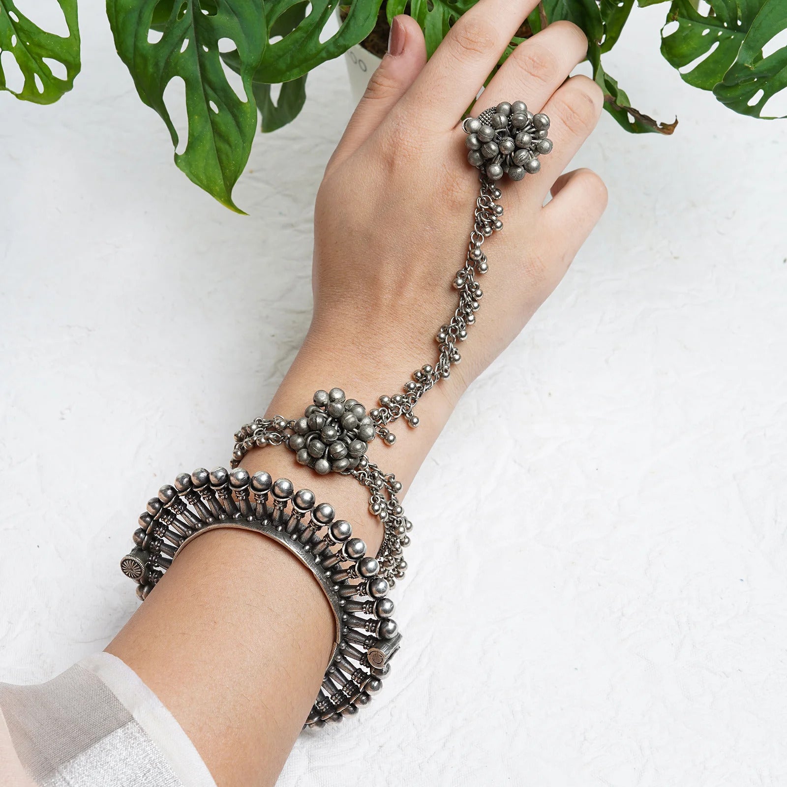 Women's Elegant Silver Oxidised Stacked Bracelet Set With Bangle, Haathphool, And Lock Clasp