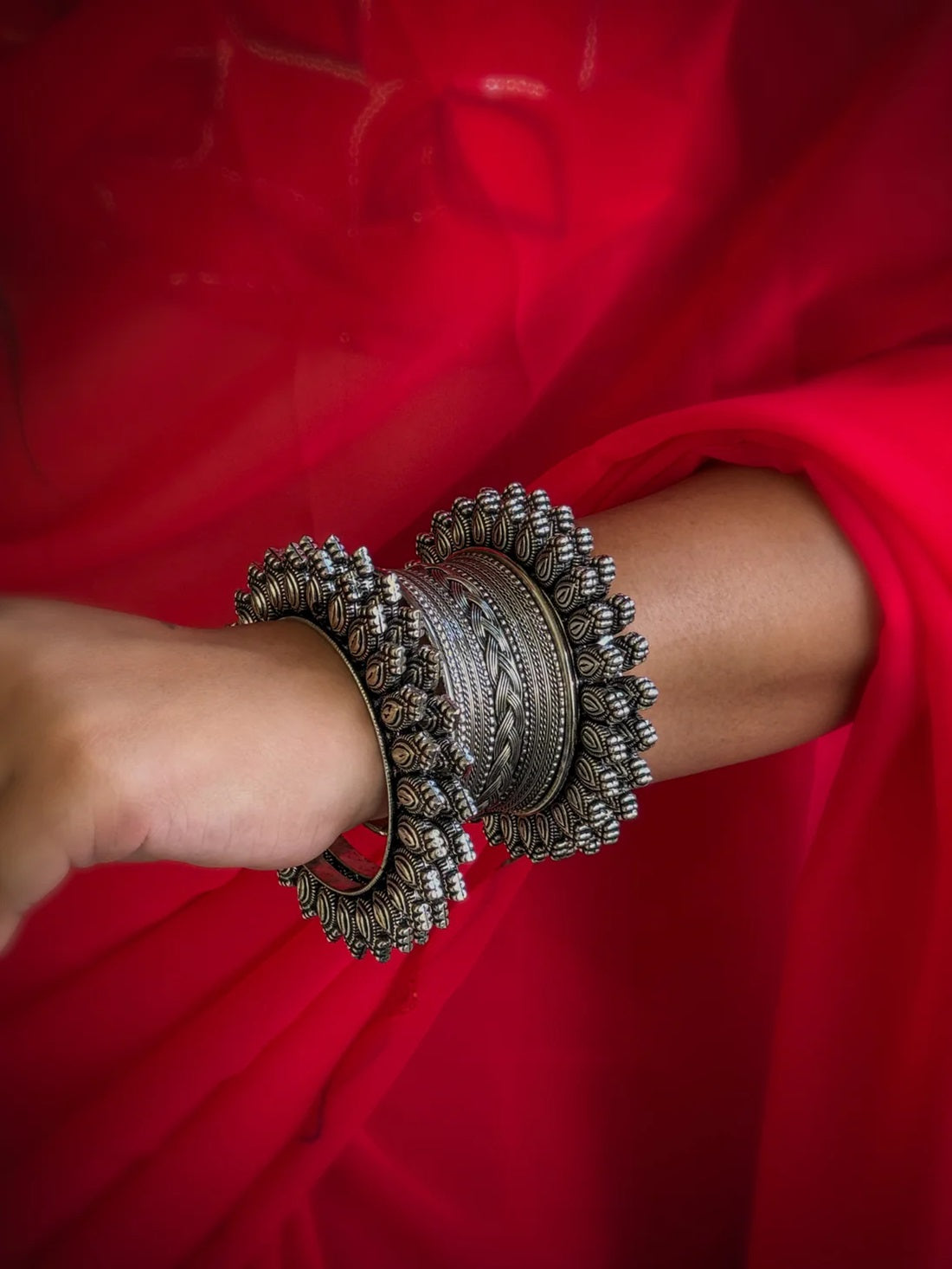 A Curated Combo Of Oxidised Silver Bangles With Varying Designs And Widths.