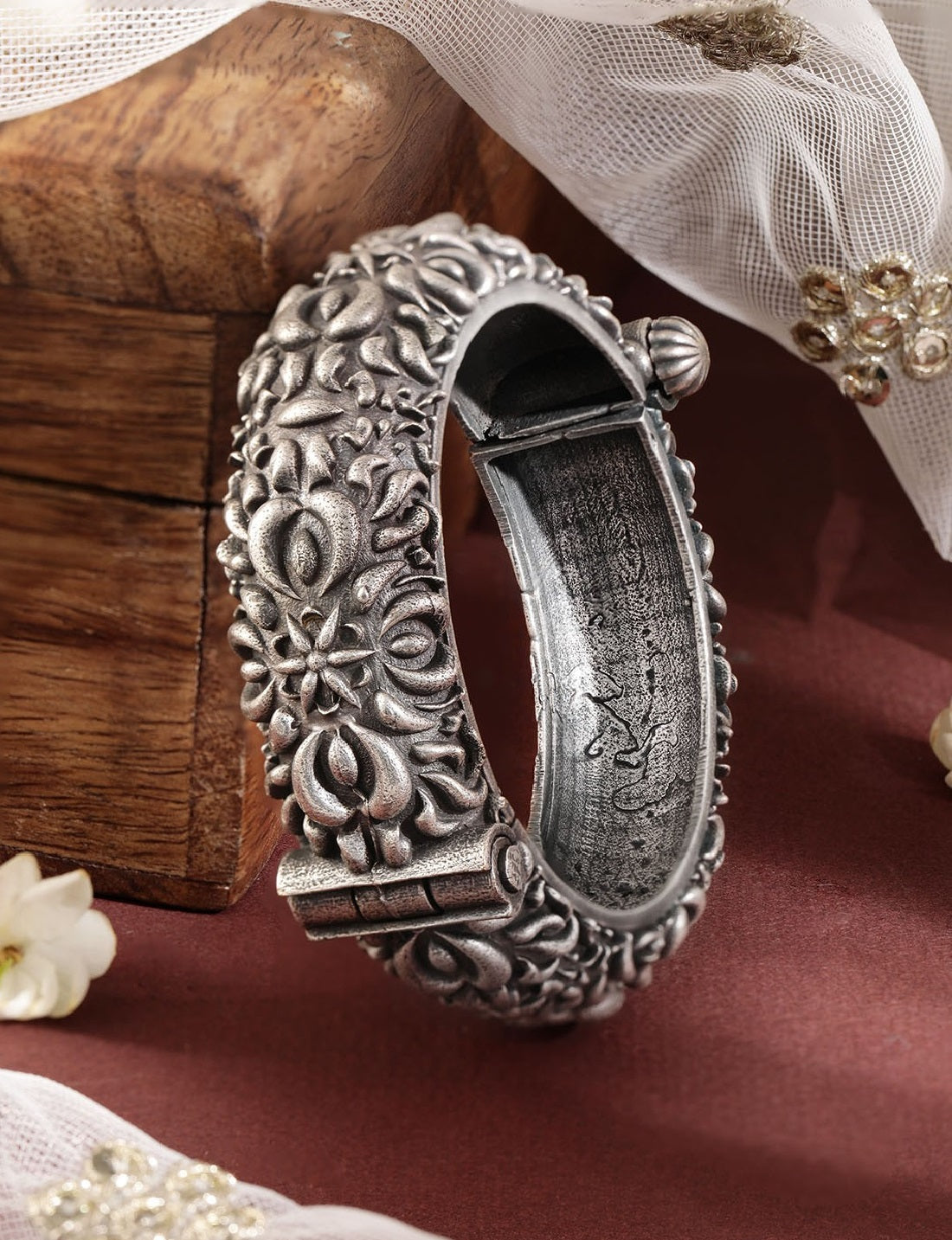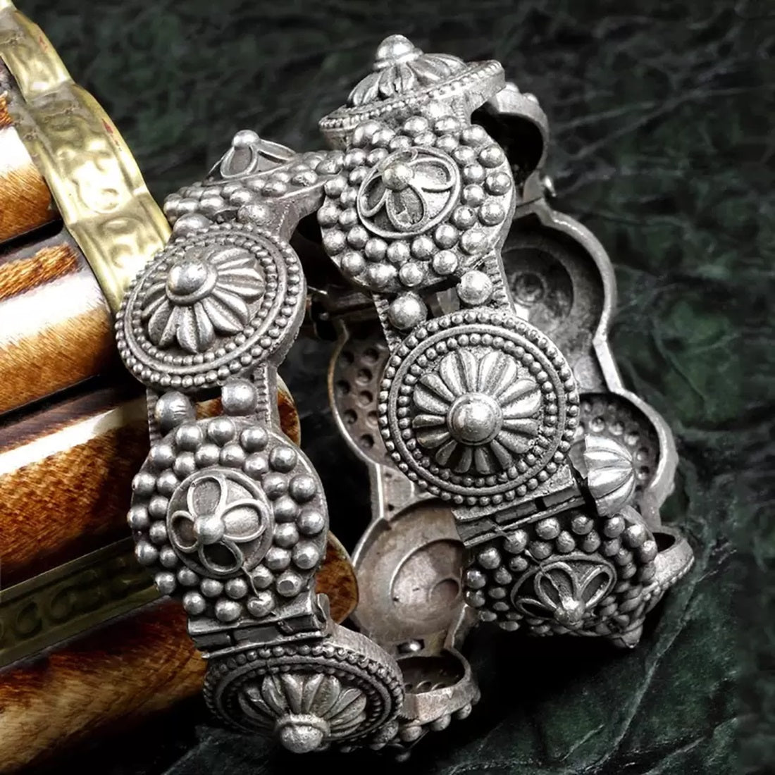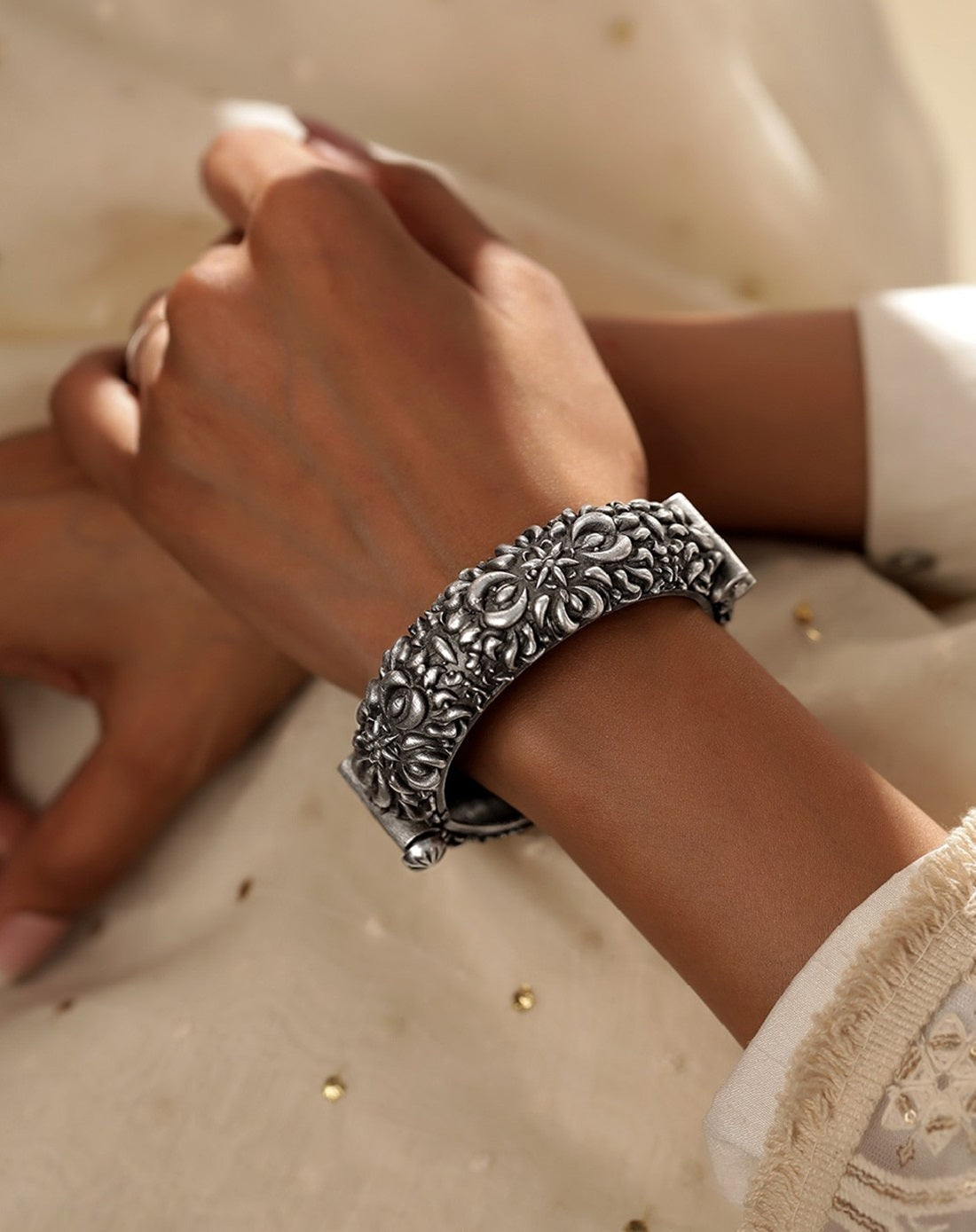 Dive Into Elegance With Our Unique Kada. Each Piece Radiates Beauty And Tradition, Handcrafted With Silver Oxidized Finishes. Complete Your Festive Look With These Stunning Accessories!