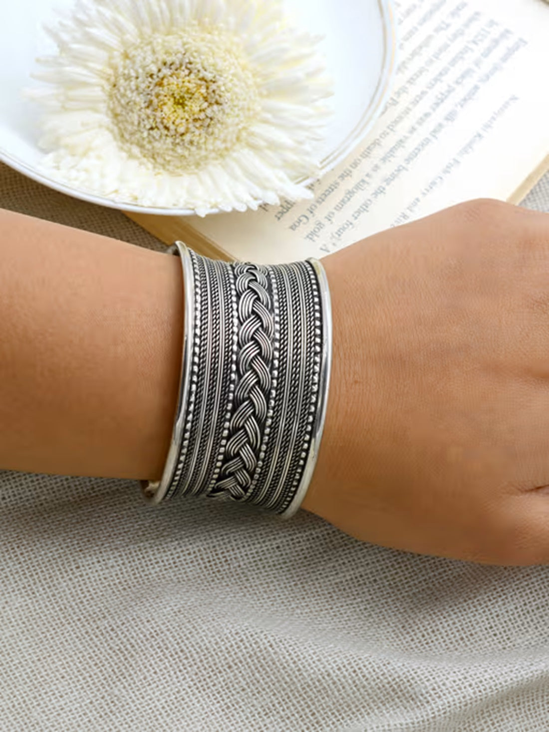 Add A Touch Of Bold Elegance To Your Ensemble With This Oxidised Silver Cuff Bangle Kada Bracelet By Vastrabhushan. This Versatile Piece Combines Traditional Charm With Modern Aesthetics, Featuring Intricate Detailing And A Polished Oxidised Silver Finish. Its Open Cuff Design Ensures A Comfortable Fit, Making It A Perfect Accessory For Both Ethnic And Contemporary Outfits. Ideal For Festive Occasions, Weddings, Or Everyday Wear, This Bracelet Adds Sophistication To Your Jewelry Collection.