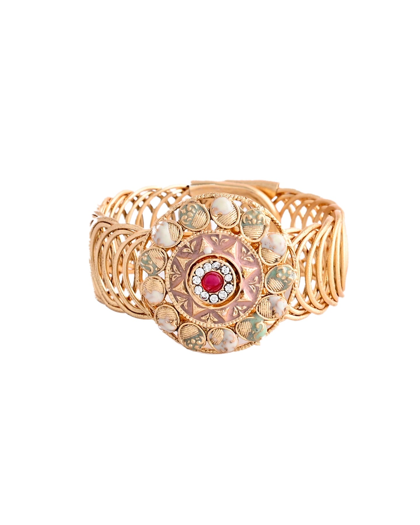 This Kundan Studded Circular Women'S Bracelet Combines Traditional Craftsmanship With Contemporary Elegance. Featuring Intricate Kundan Stones Arranged In A Circular Design, It Offers A Radiant And Timeless Appeal. Perfect For Festive Occasions, Weddings, Or Casual Wear, This Bracelet Adds A Touch Of Grace And Sophistication To Any Outfit, Making It An Essential Piece For Every Woman’S Jewelry Collection.
