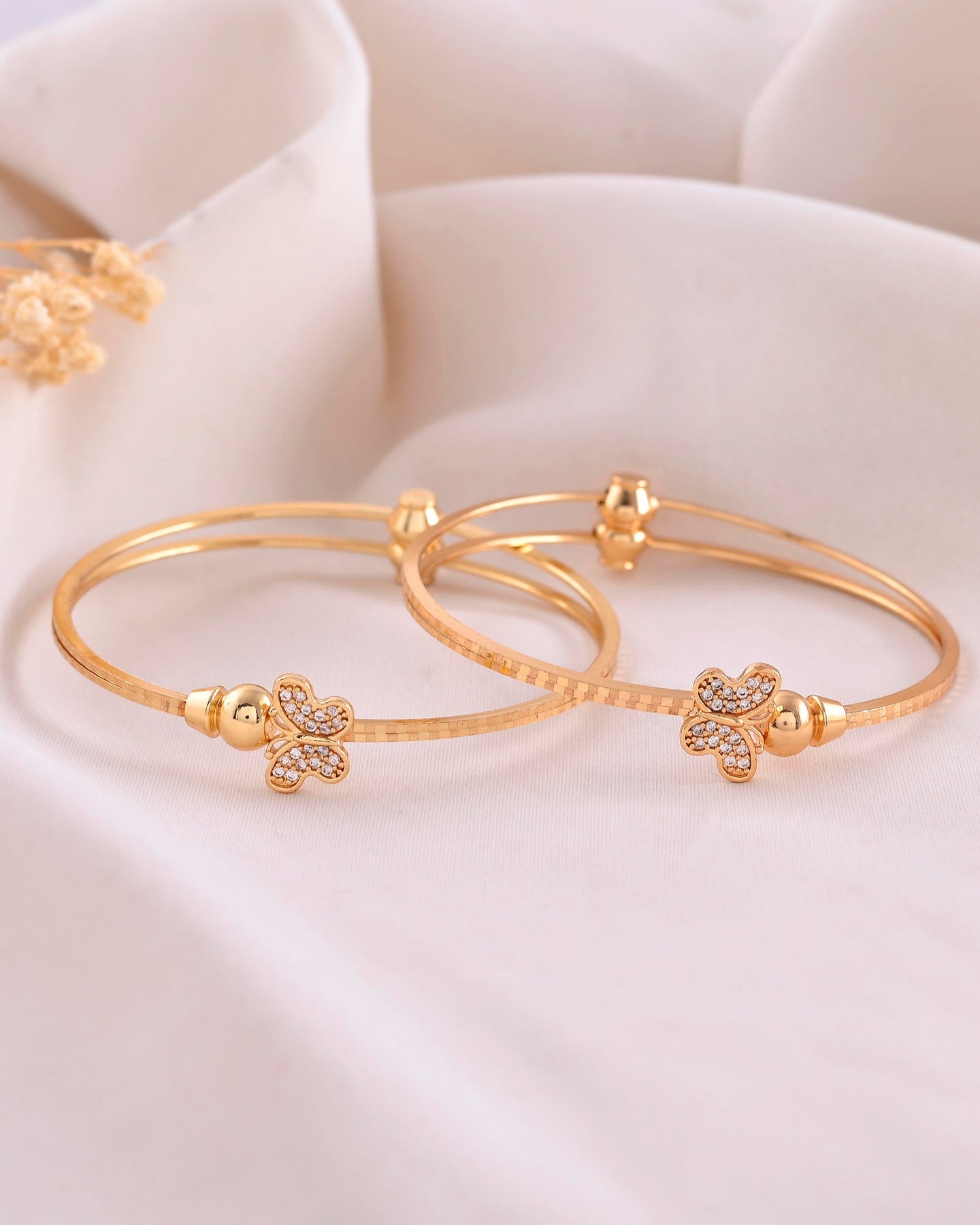 Add Delicate Charm With This Set Of 2 Gold Plated Ad Stones Butterfly Shaped Bangles. Featuring Intricate Butterfly Designs Studded With Sparkling American Diamonds, These Bangles Bring Elegance And Grace To Any Outfit. Perfect For Weddings, Festivals, And Special Occasions, They Add A Timeless And Feminine Touch To Your Jewelry Collection.