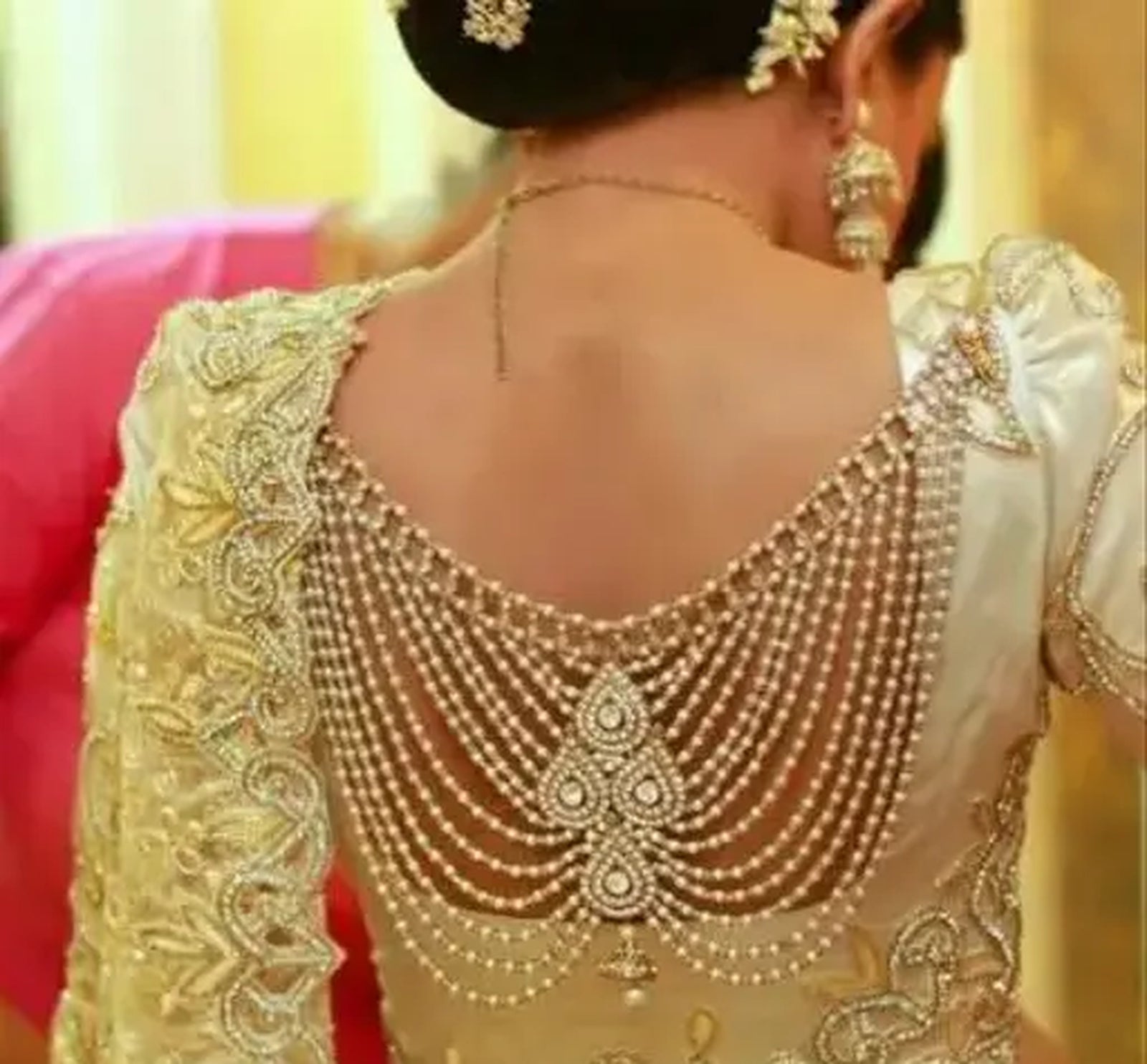 Elevate Your Bridal Ensemble With This Stunning Back Necklace And Intricately Designed Saree Blouse Combination. This Luxurious Set Features: