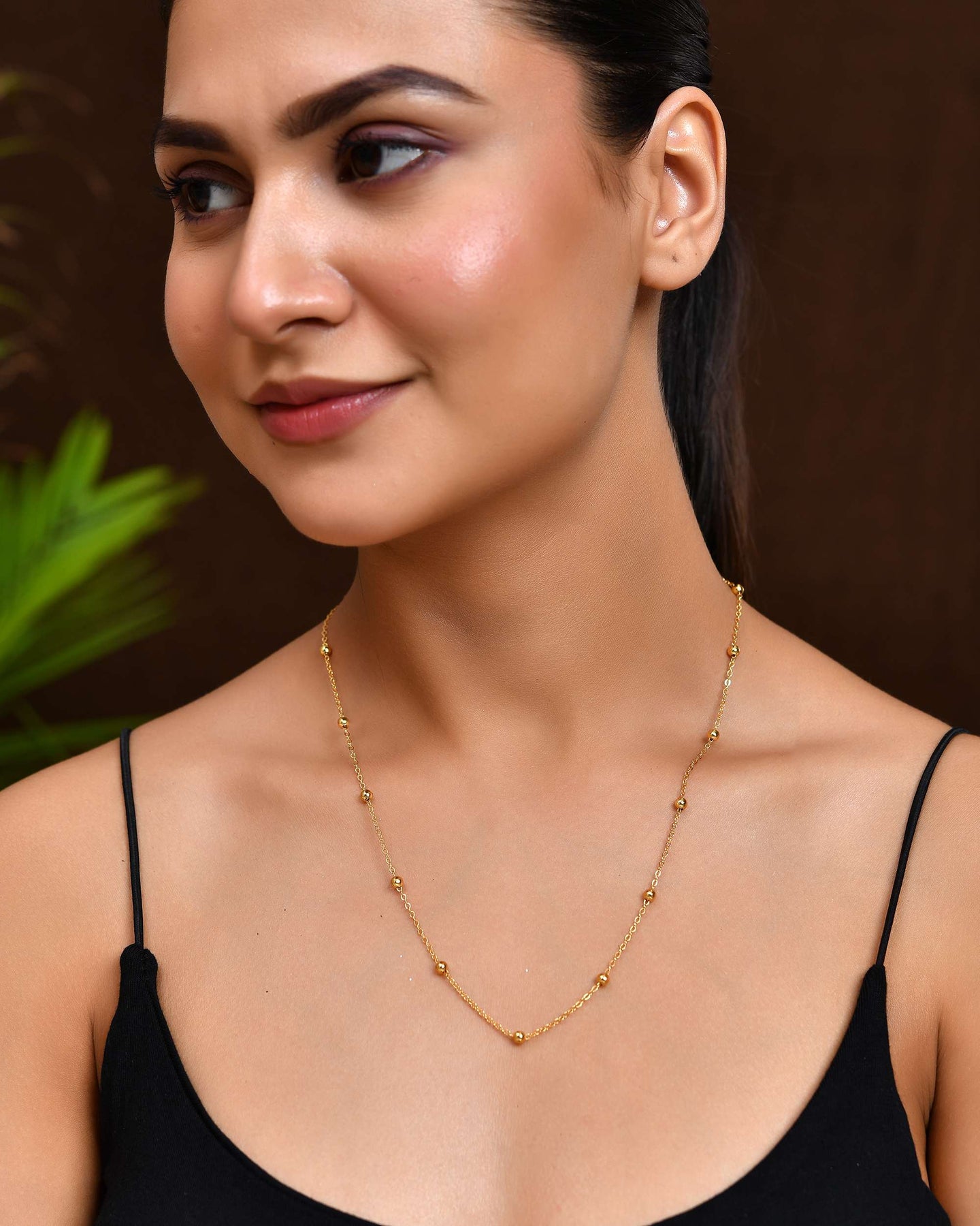 Step Into Everyday Elegance With This Lightweight Gold-Polished Beaded Chain. Crafted With Simplicity And Grace, This Necklace Features Tiny Spherical Bead Accents Evenly Spaced Along A Delicate Gold Chain. Its Understated Charm Makes It Perfect For Daily Wear While Still Adding A Touch Of Shine To Your Ensemble.