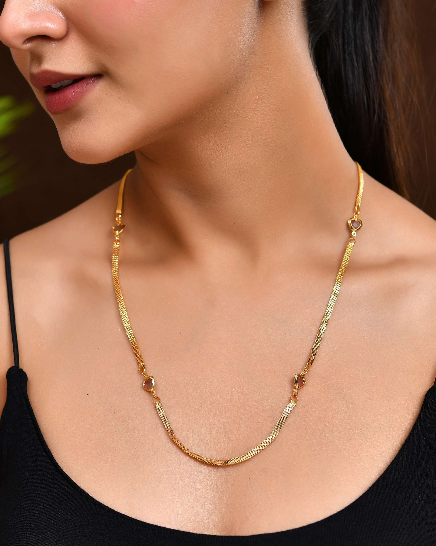Step Into Elegance With This Charming Dual-Strand Gold Chain, Adorned With Tiny Purple Heart Charms That Exude Romance And Grace. The Chain Is Designed With A Delicate Mesh-Like Texture, Giving It A Sleek, Modern Finish While The Mini Heart Motifs Add A Playful And Romantic Touch.