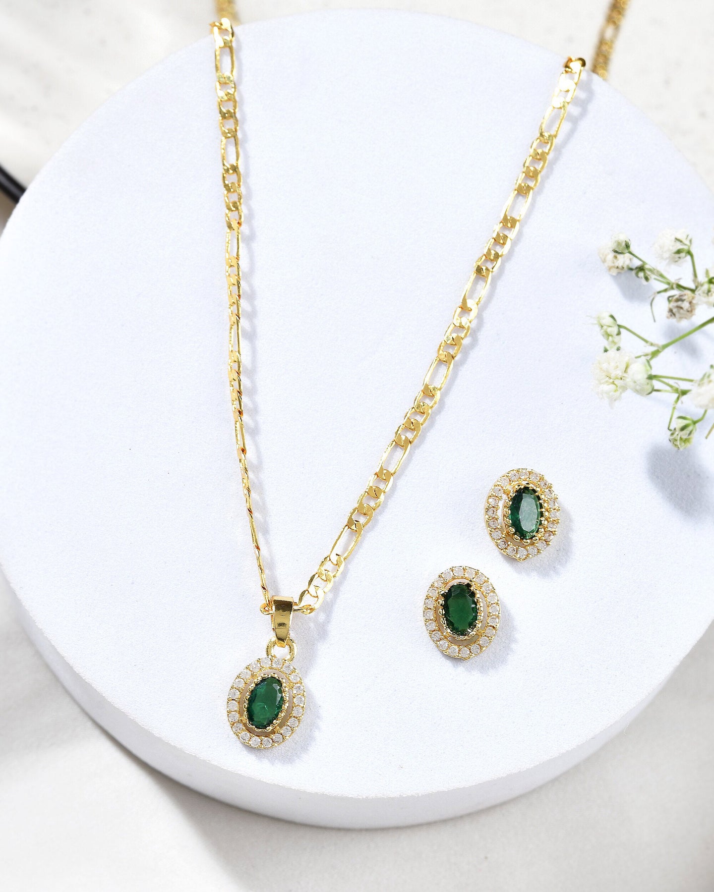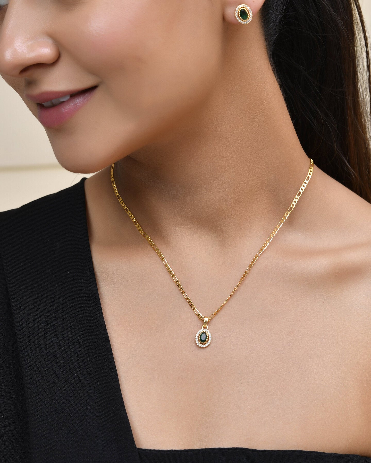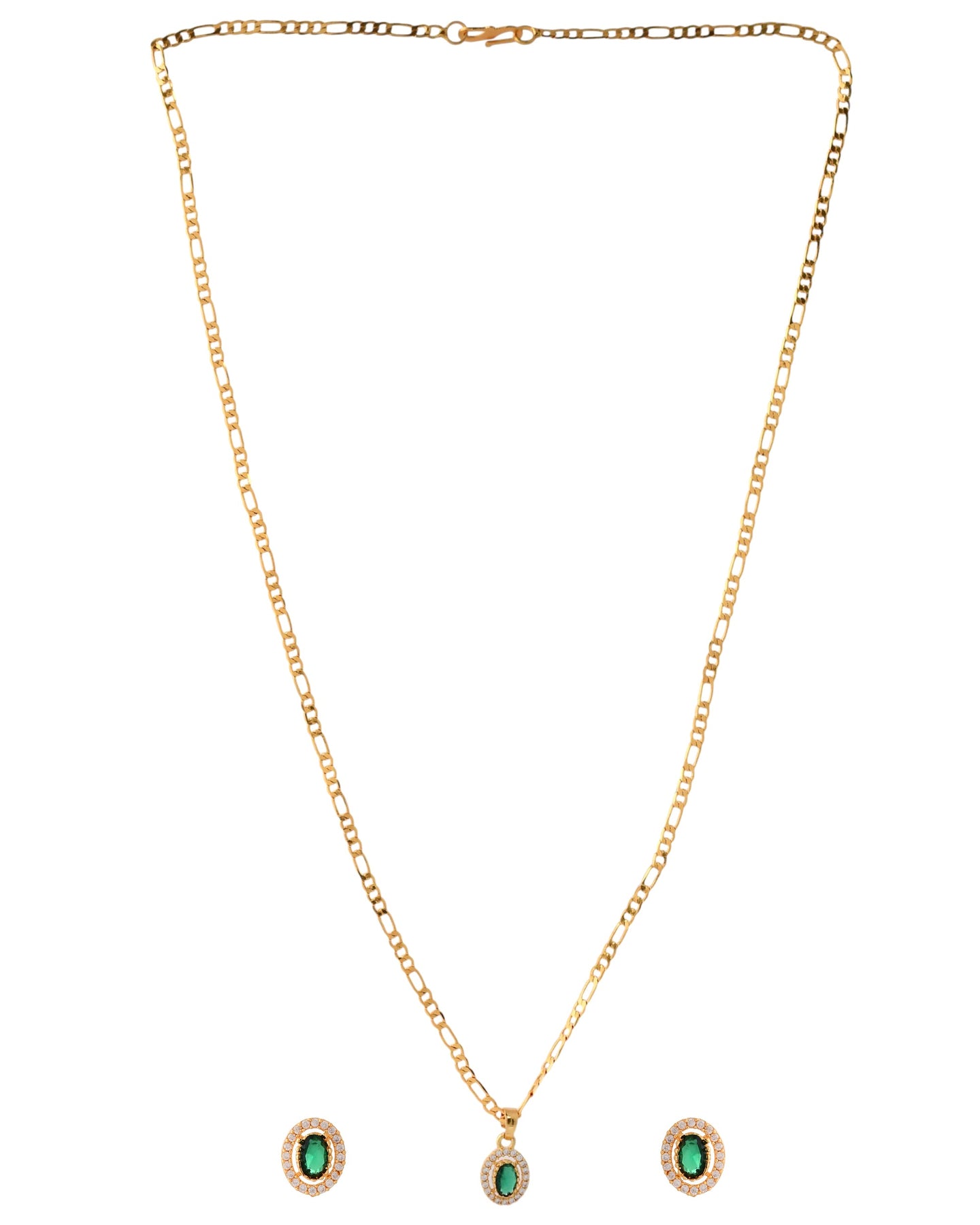Make A Statement With This Exquisite Gold-Plated Earring And Pendant Set, Featuring A Stunning Green Stone Surrounded By Shimmering Cubic Zirconia. Designed For Those Who Love Luxurious And Timeless Jewelry, This Lightweight Yet Premium-Quality Set Adds A Touch Of Elegance To Any Outfit. Perfect For Weddings, Parties, Festive Occasions, And Daily Wear, This Set Is Crafted With Precision To Ensure Long-Lasting Shine And Durability. Whether You Are Dressing Up For A Special Event Or Looking For A Unique Gift For A Loved One, This Classic Yet Trendy Jewelry Set Is An Ideal Choice For Women Who Appreciate Grace And Sophistication.