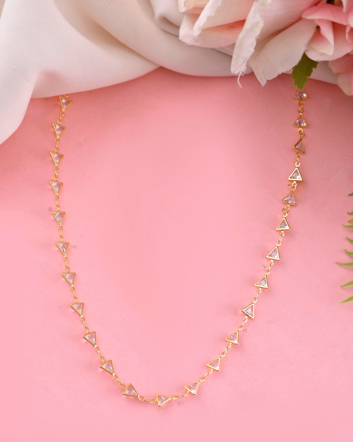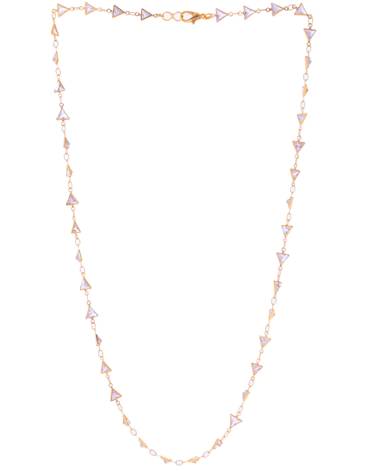 Add Geometric Elegance With This Women’S Gold-Plated Triangular Stone Studded Chain. Featuring Sparkling Stones Set In Chic Triangular Designs, It Offers A Modern And Stylish Look. The Gold Plating Ensures Lasting Shine And Durability, While The Lightweight Design Provides Comfortable Wear. Perfect For Making A Subtle Yet Sophisticated Statement With Any Outfit.