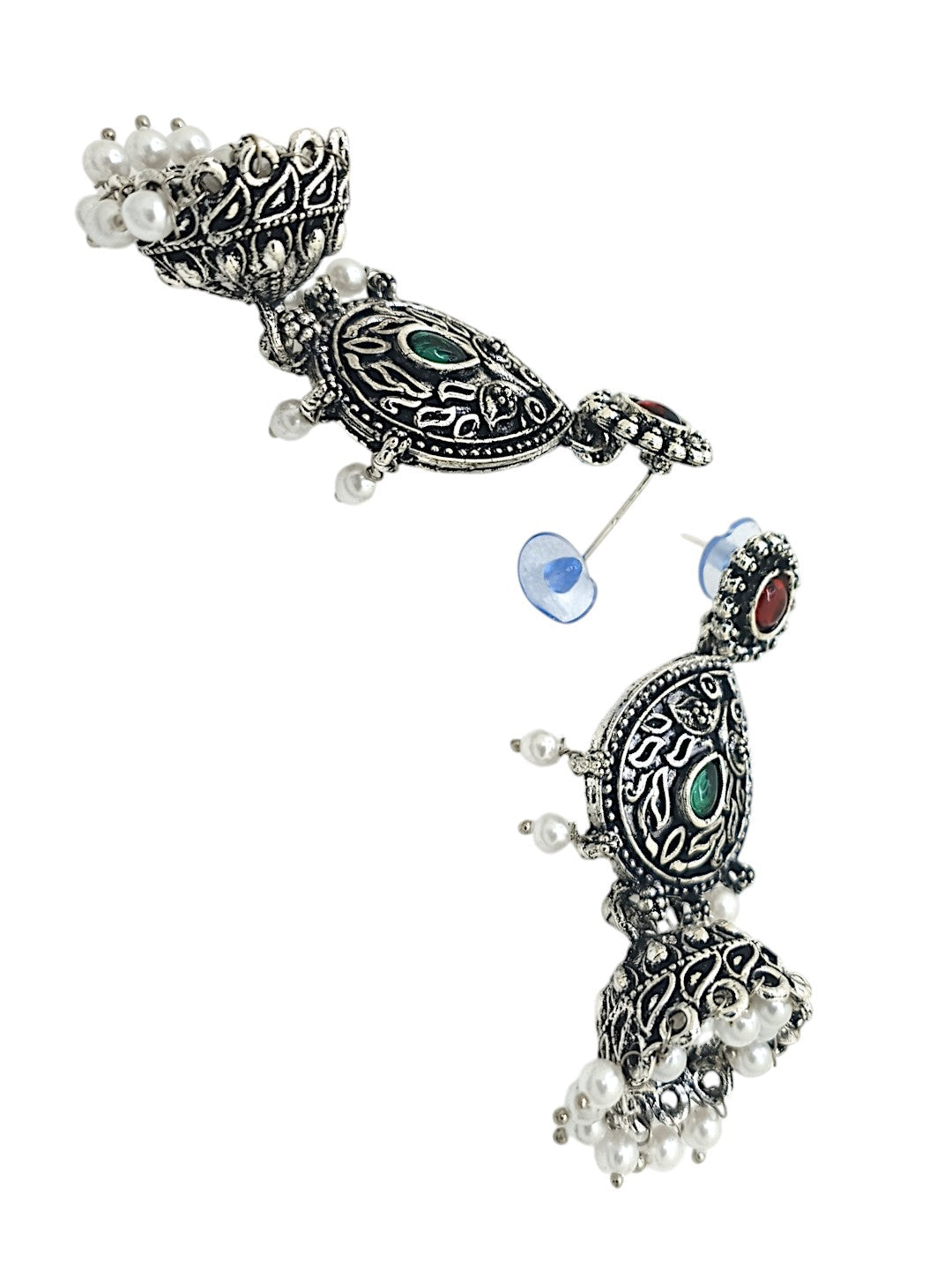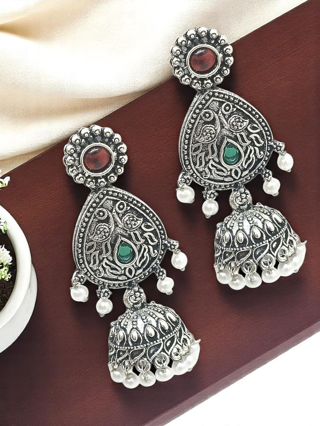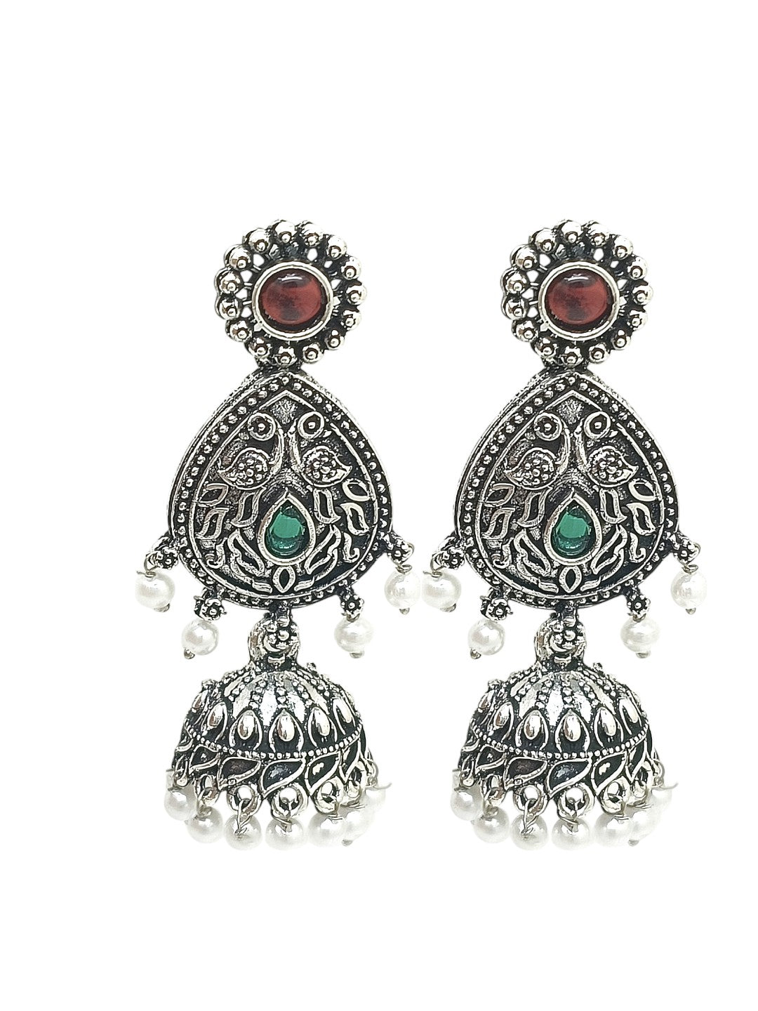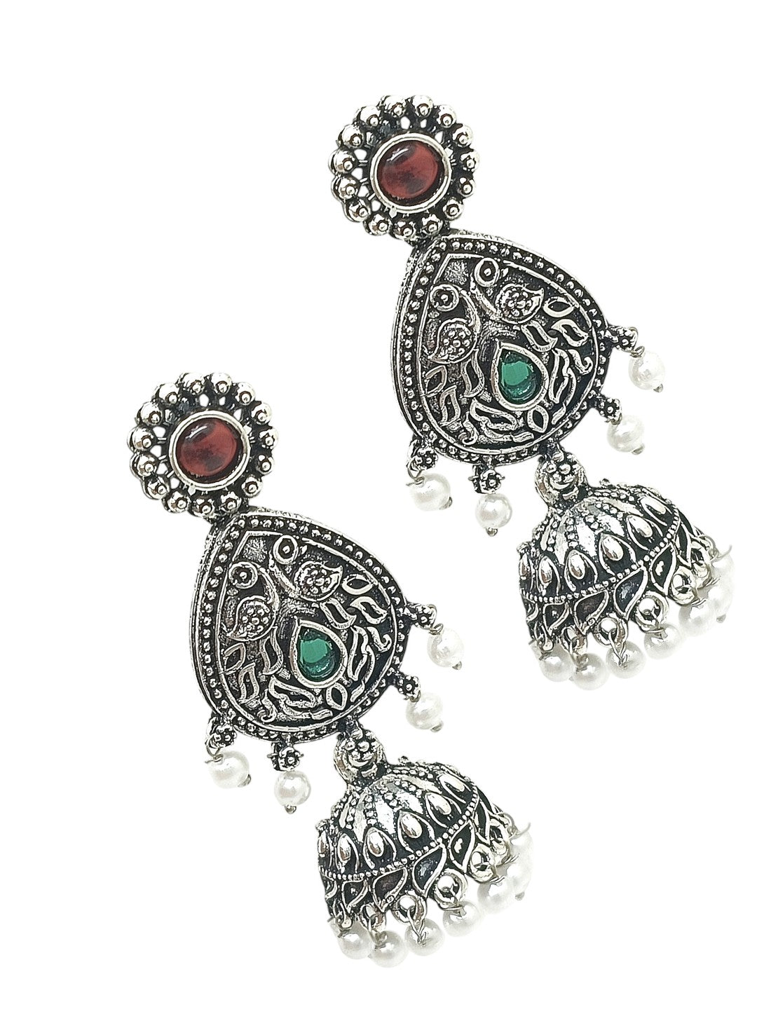 Silver Oxidised Drop Jhumka Earrings Studded With Green, Maroon Stones And White Beads. Secured With Post And Back Closure