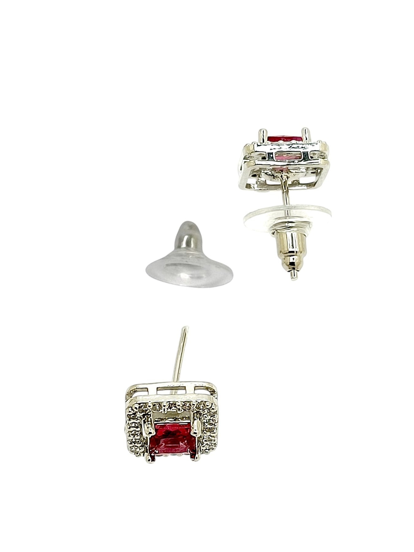 Silver Plated Ad Studded White And Ruby Square Stud Earrings. Secured With A Post And Back Closure
