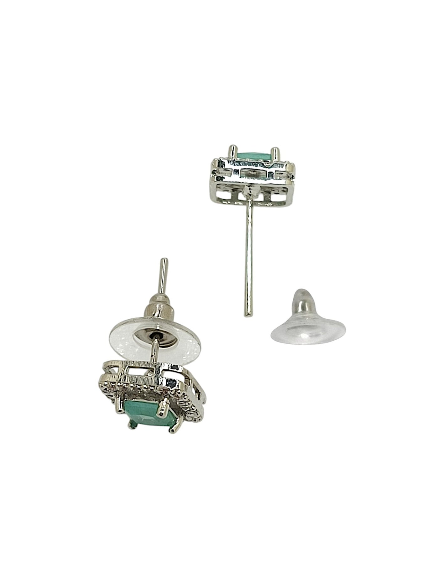 Silver Plated Ad Studded White And Mint Green Square Stud Earrings. Secured With A Post And Back Closure