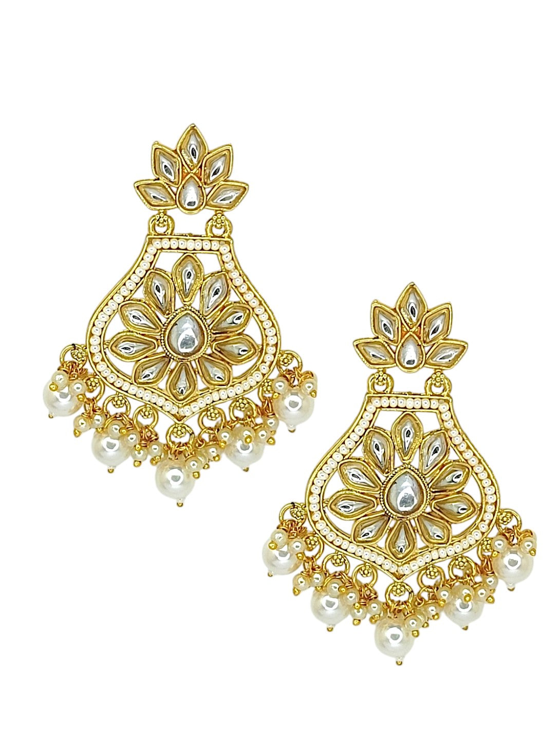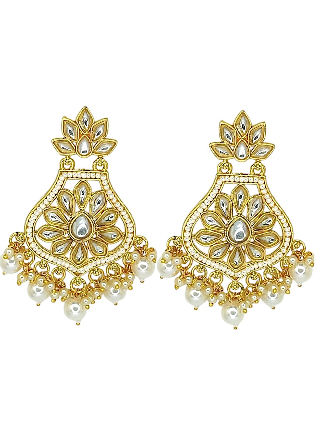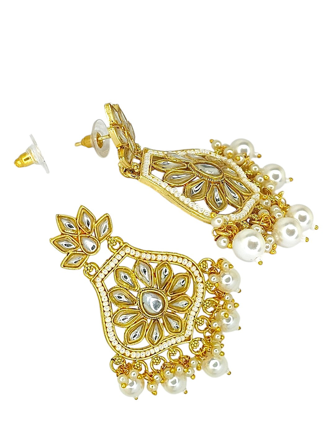 Gold-Toned Chandbali Earrings Studded With White Kundan And Artificial Beads. Secured With Post And Back Closure
