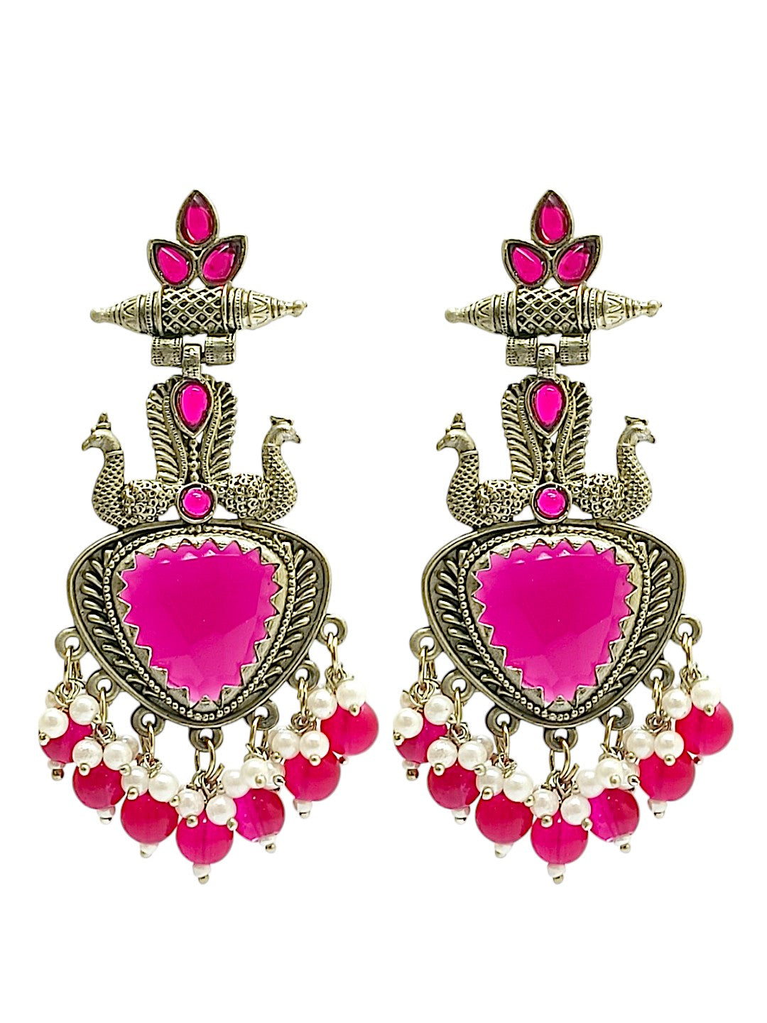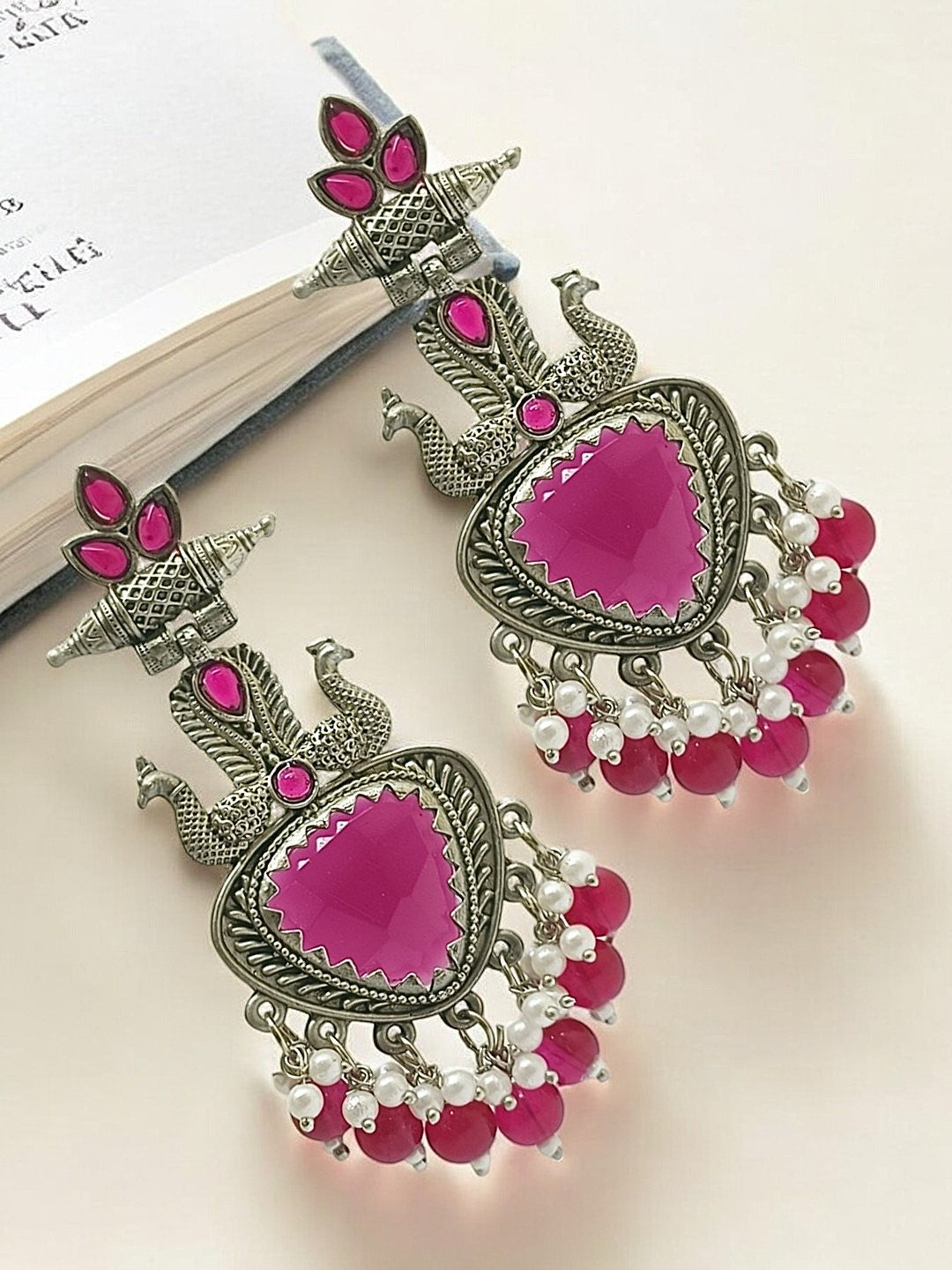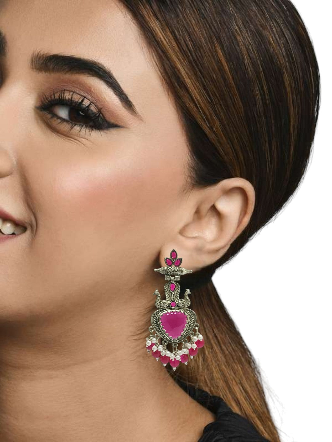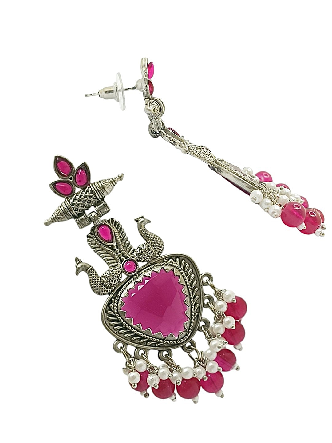 Silver-Toned & Magenta Peacock Shape Drop Earring, Silver-Plated, Has Artificial Stone & Beaded. Secured With Post And Back Closure