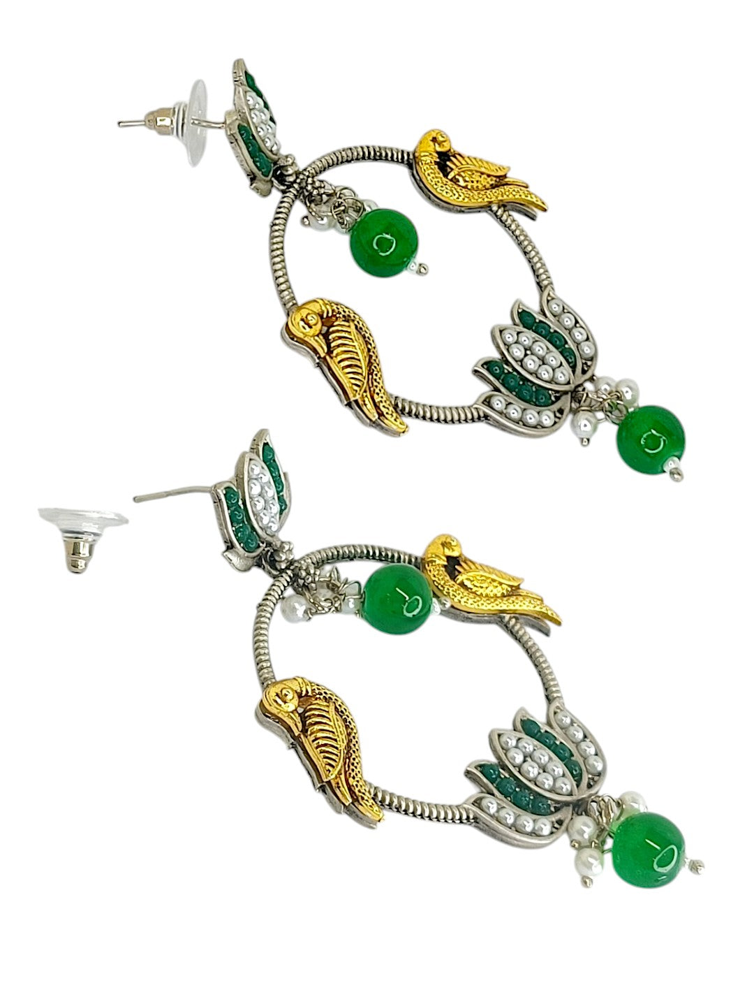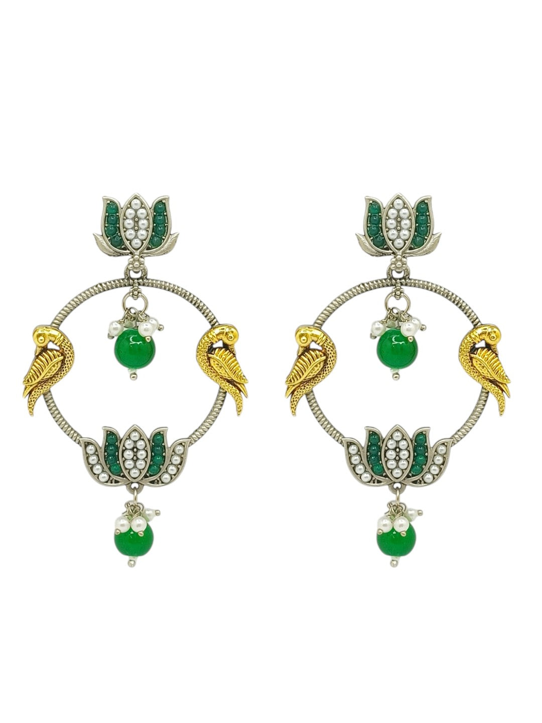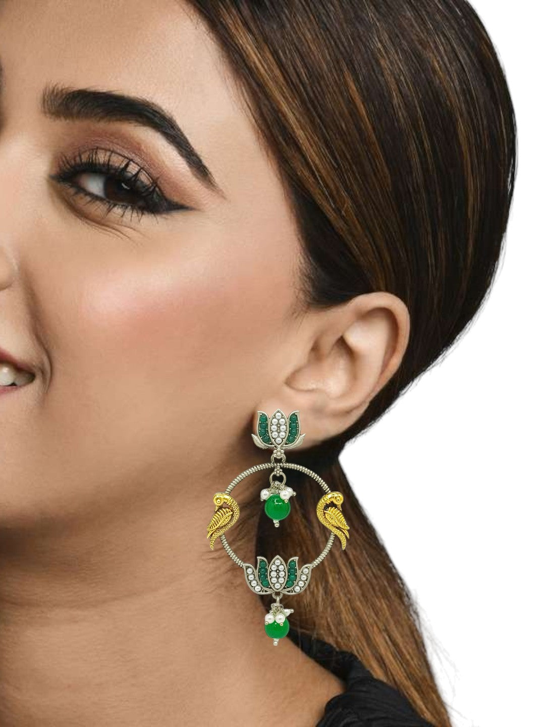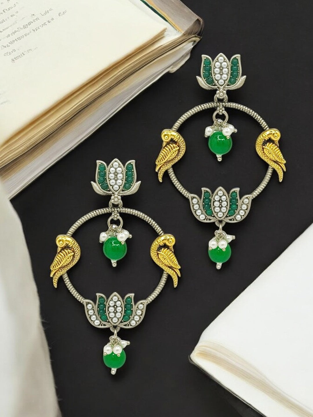 Silver-Toned Green Contemporary Lotus Drop Earrings, Has Kundan Studded. Secured With Post And Back Closure