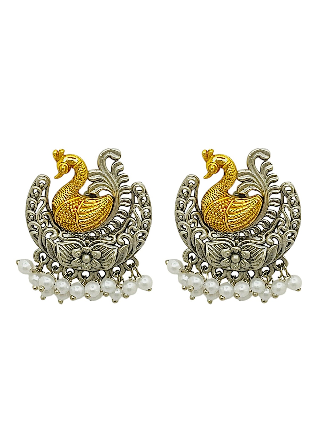 Silver-Toned Gold Peacock Shape Pearls Drop Earrings. Secured With Post And Back Closure
