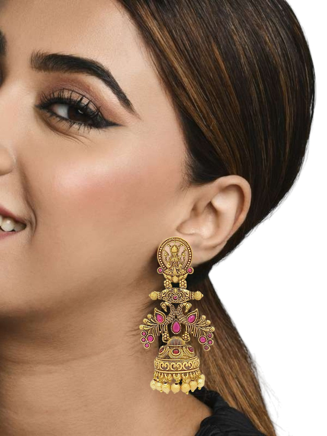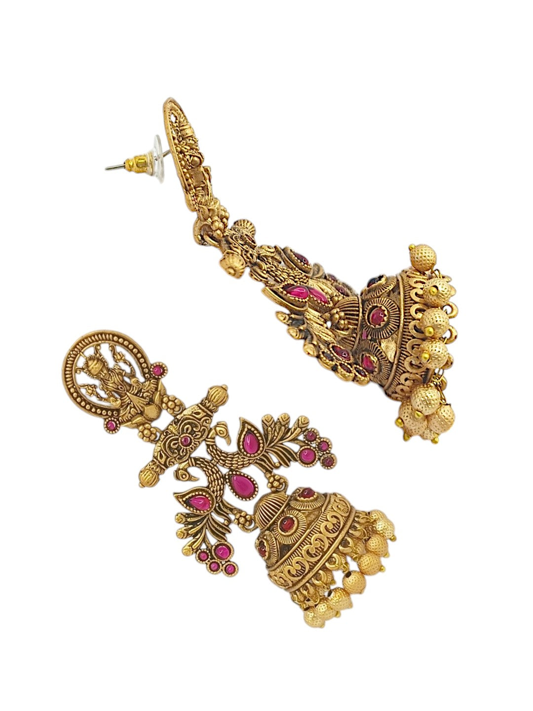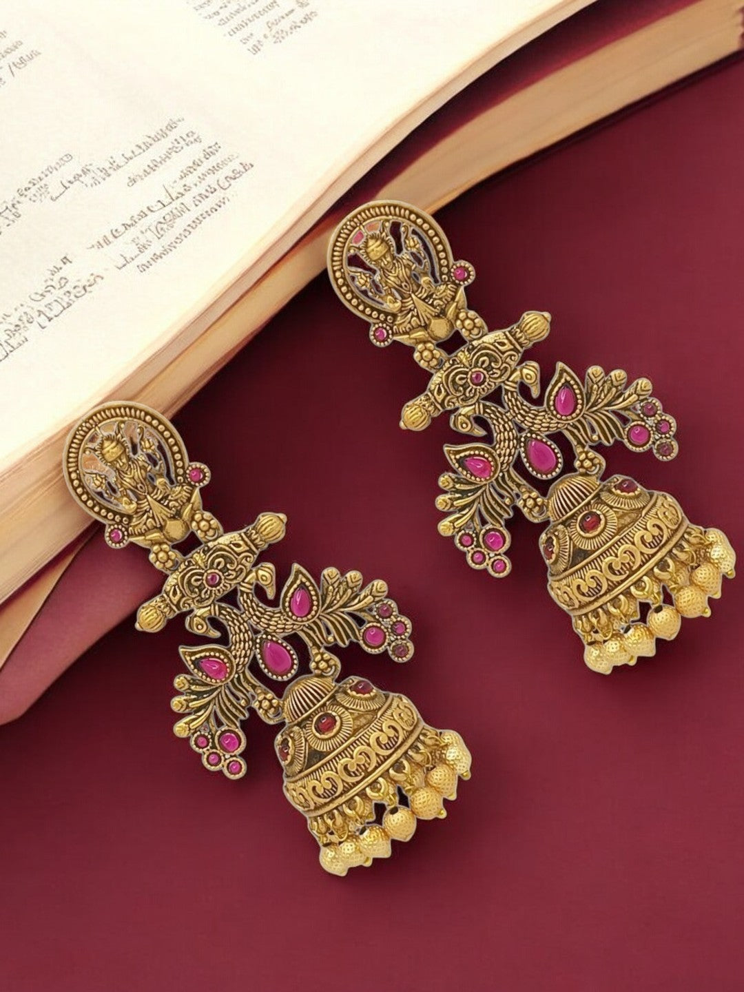 Gold-Toned Temple Peacock Design Artificial Stone & Beaded Jhumkas Earrings.Secured With Post And Back Closure