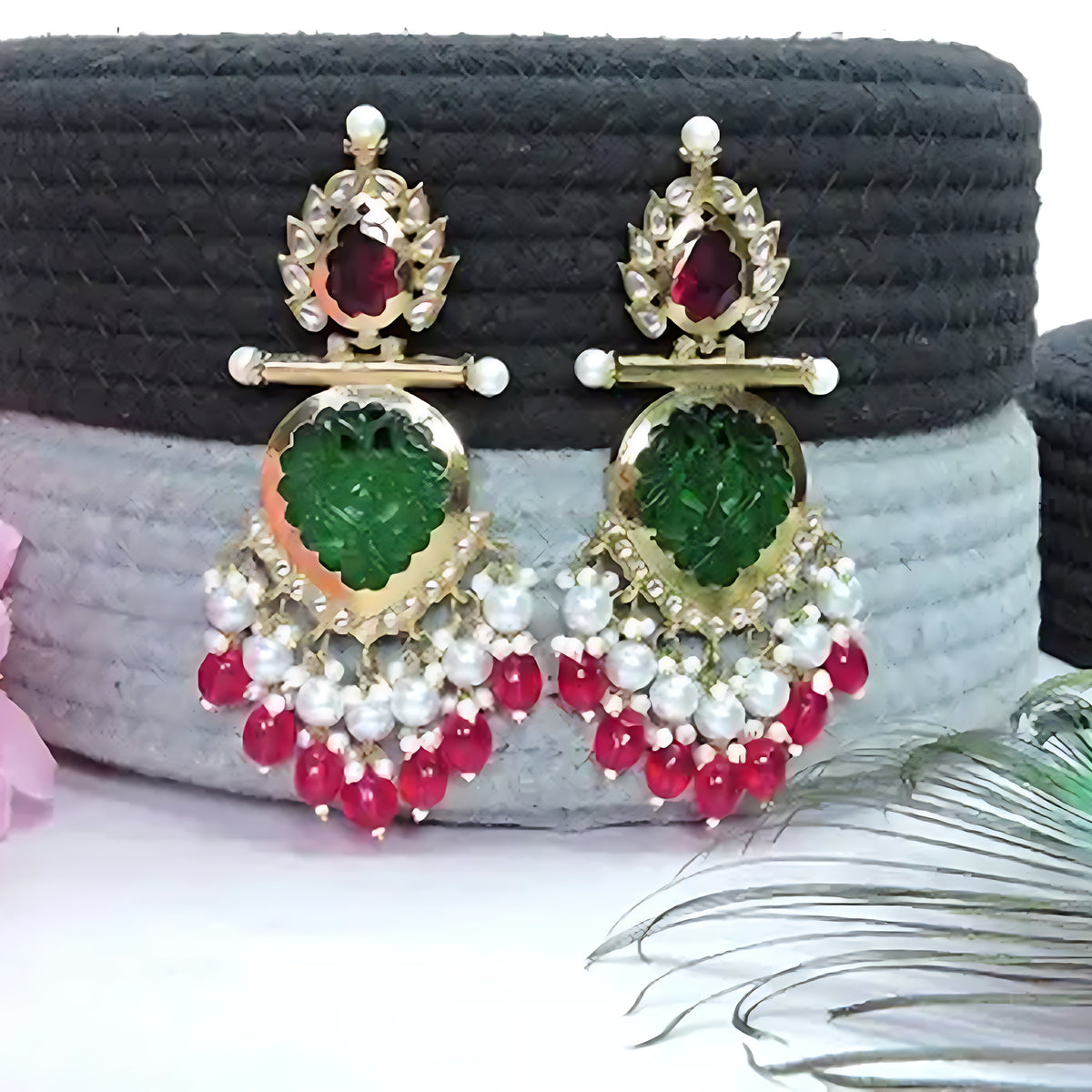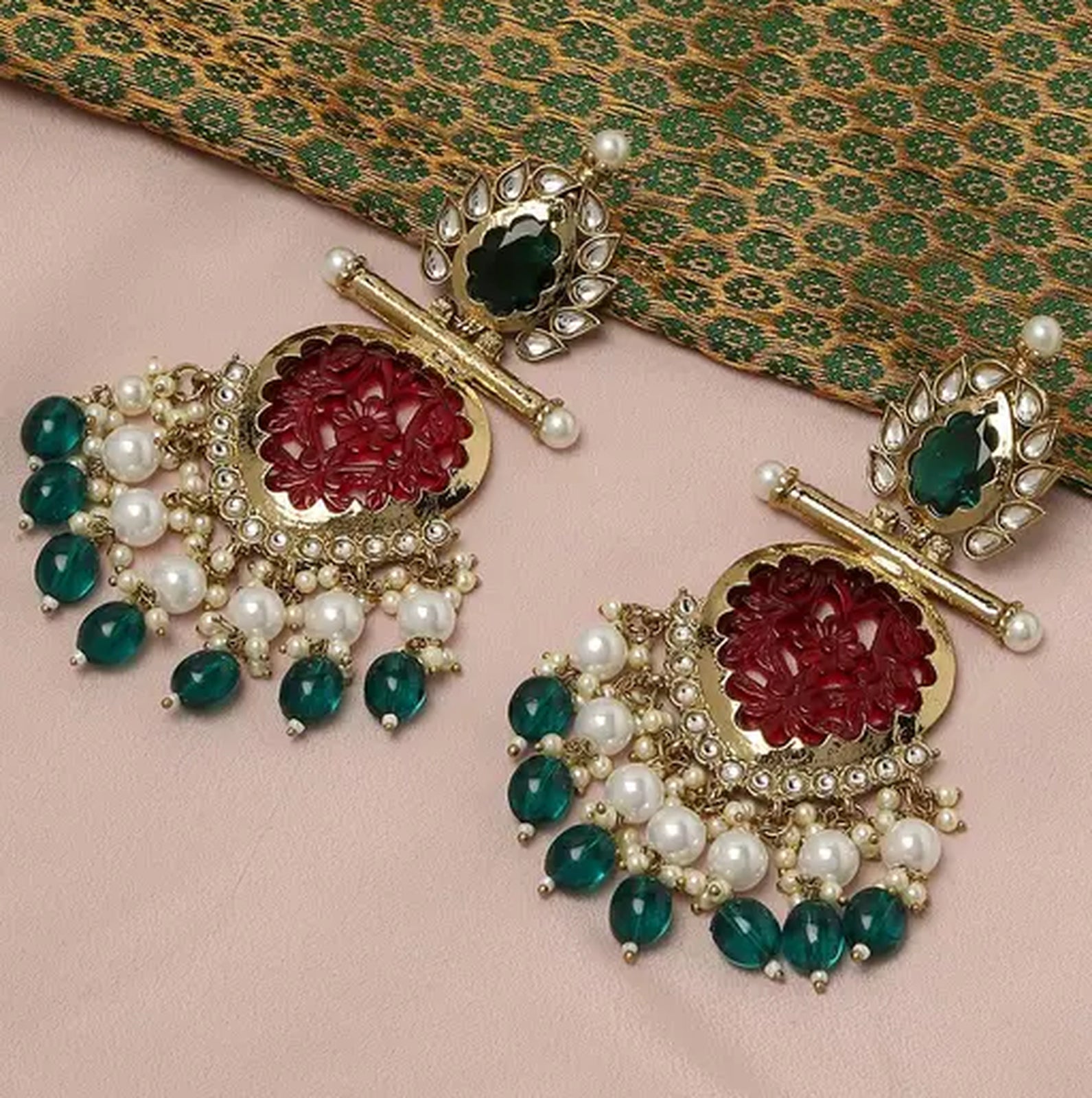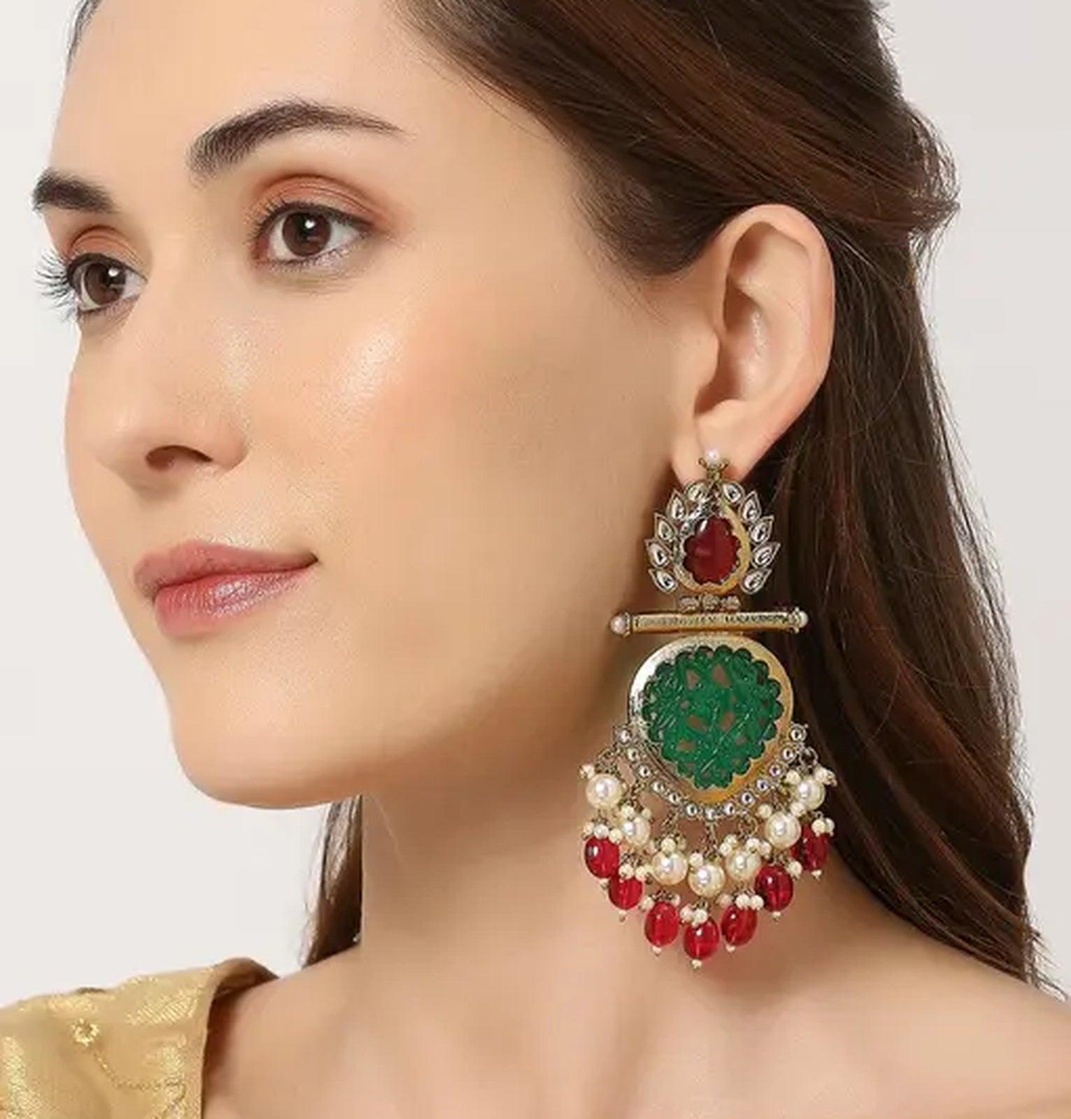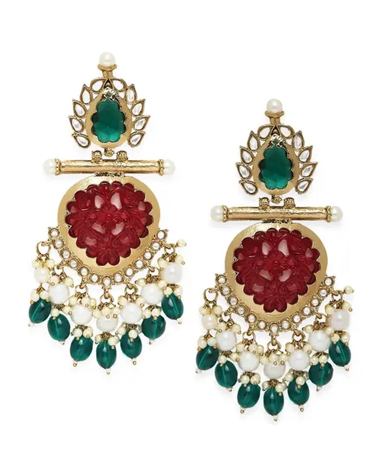 Elegant Kundan-Inspired Chandelier Earrings With Red And Green Gemstones