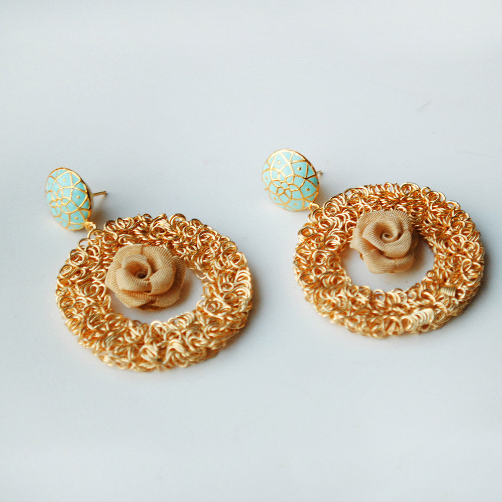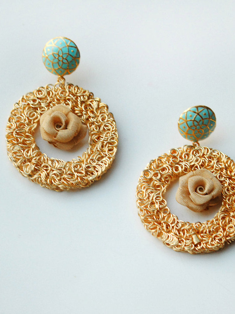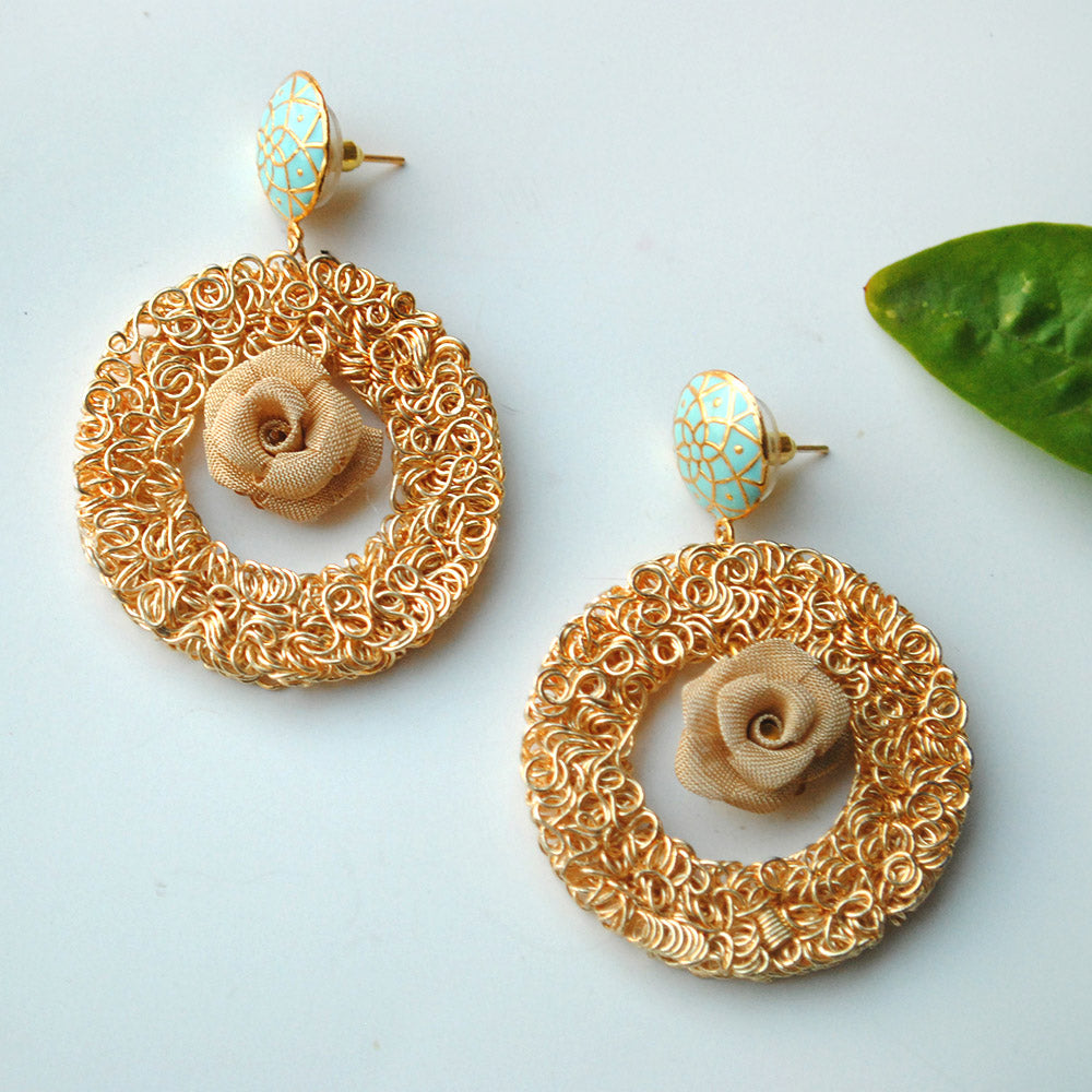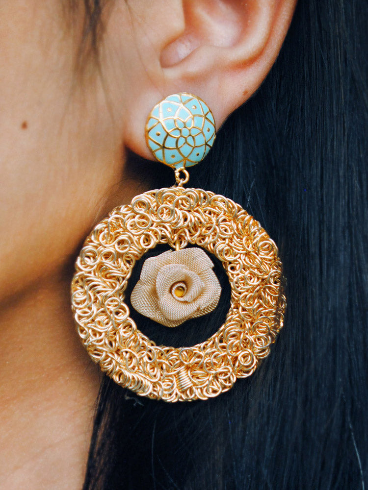 Ace15: This Rose And Mesh Earrings Is All You Need To Shine Above The Crowd. A Big Round Flat Alloy Mesh Ensemble With A 3D Mesh Rose Dangling At The Center , Is Held And Secured With A Beautiful Turquoise Enamel Stud.