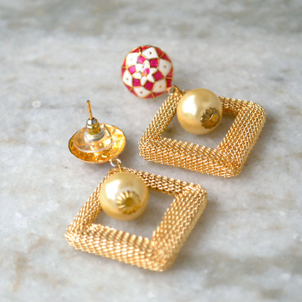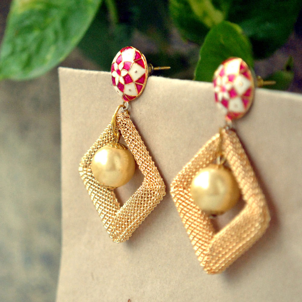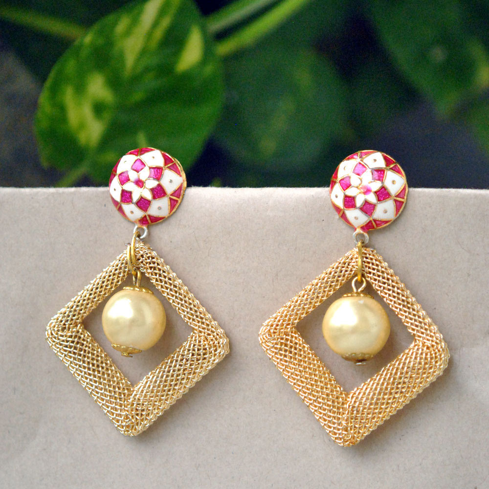 Multicolored Enameling Studs Fashioned With A Kite Shaped Alloy Mesh Which Is Beautifies With A White Pearl In The Centre. This Surreal Combination Will Give You Perfect Indo Western Look