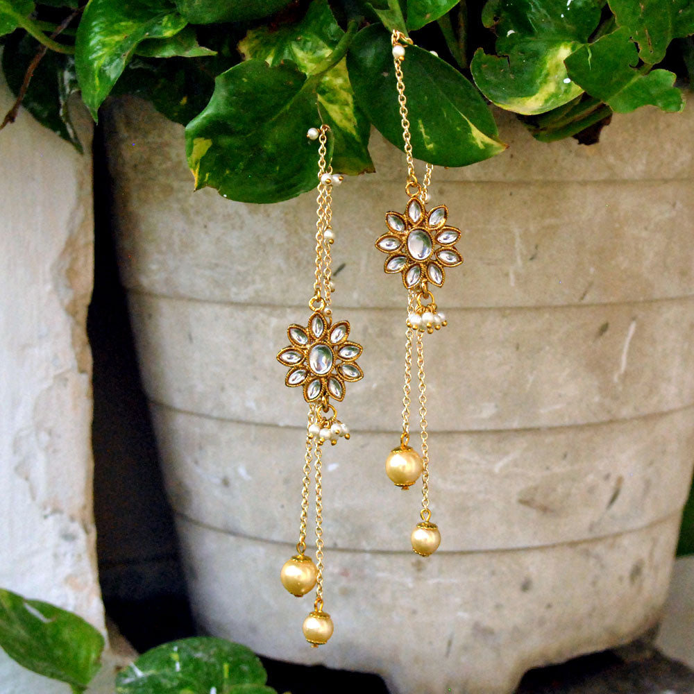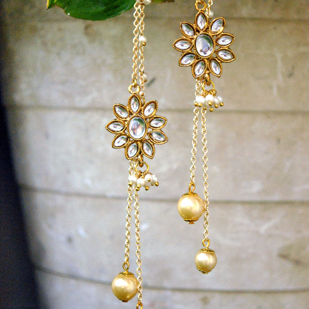 These Kanauti Earrings Are Back In Trend.A Kundan Motif Is Stylized With Pearl Beaded Chain Around The Ear , Along With Two Golden Dangling Pearls.