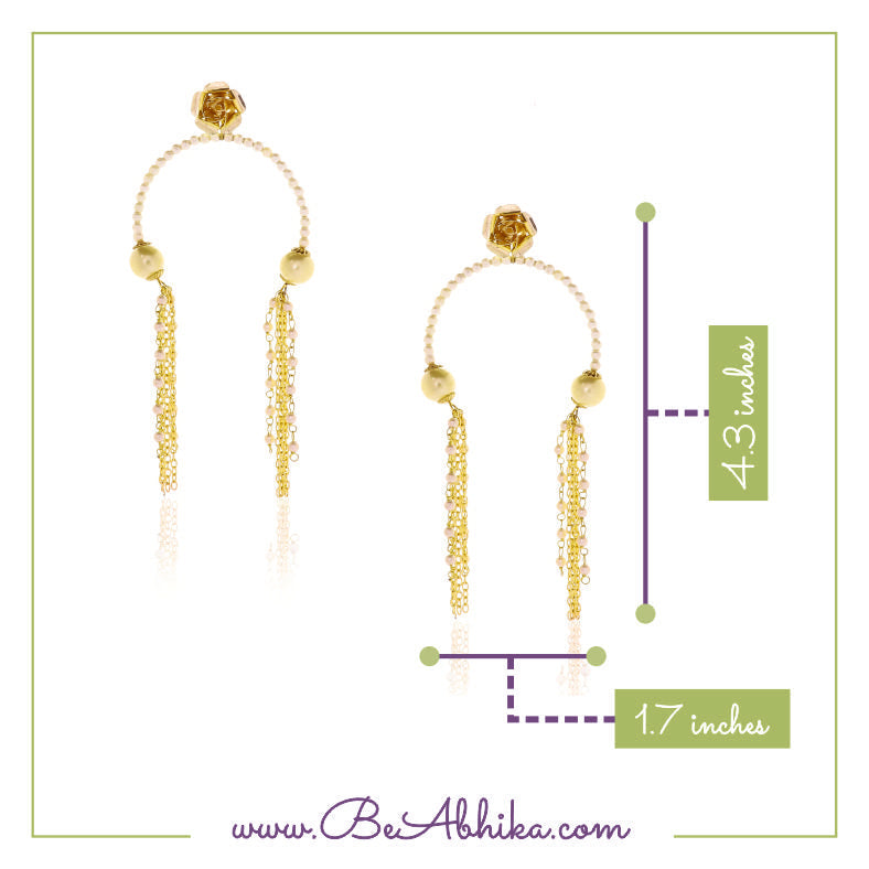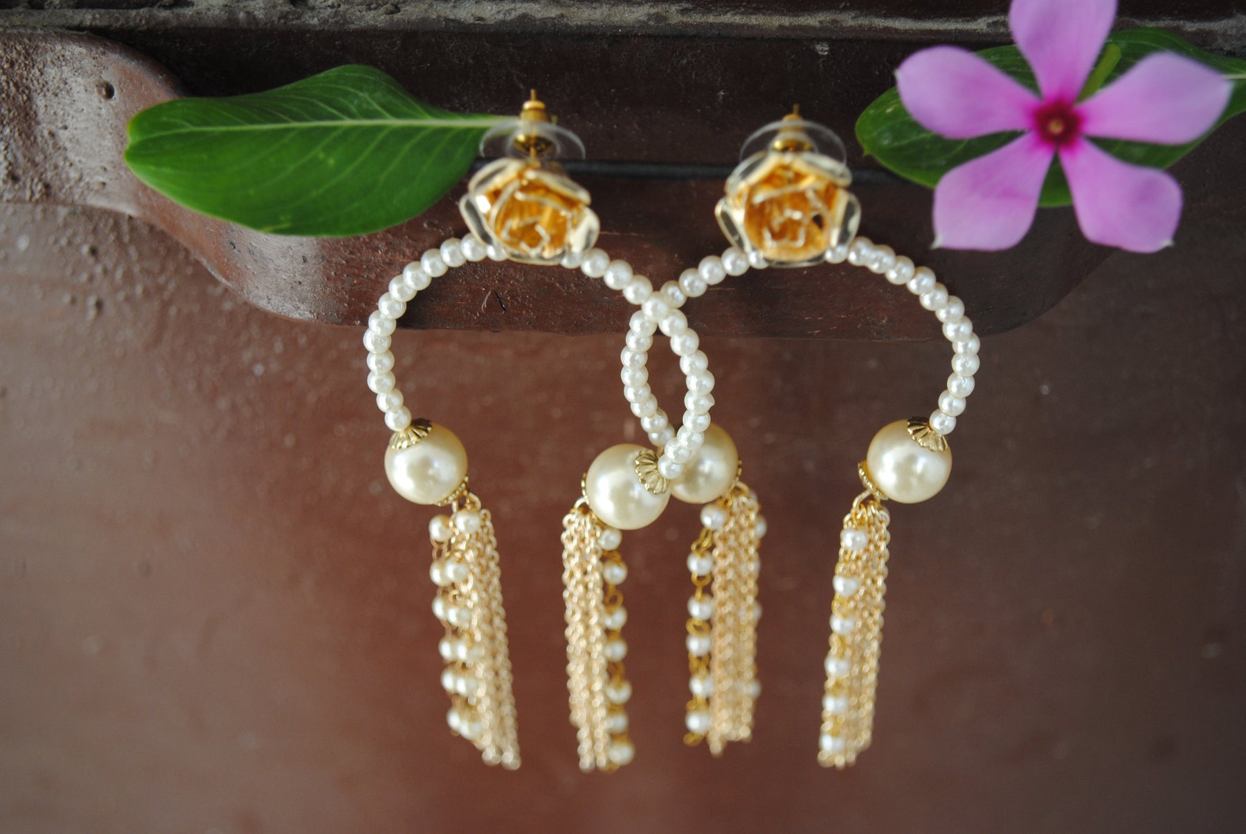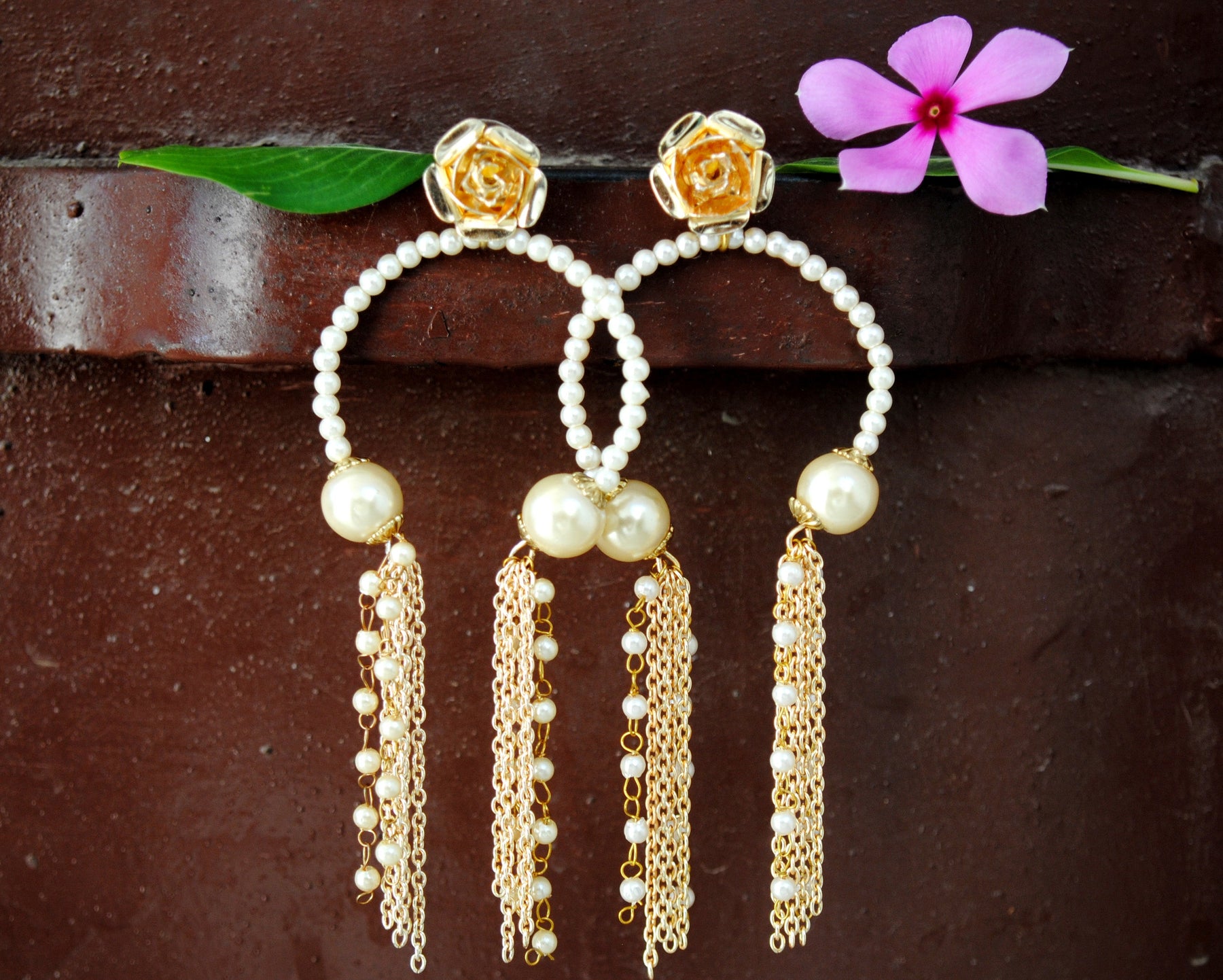 Bohemian Style Long Pearly Inverted Hoops Are The Perfect Accent To Any Outfit. Long Dangling Chains Are Swaying From The Ends Of A Beaded Hoop Tied Up In The Centre Is A Gleaming Metal Rose. This Piece Is Surprisingly Lightweight.