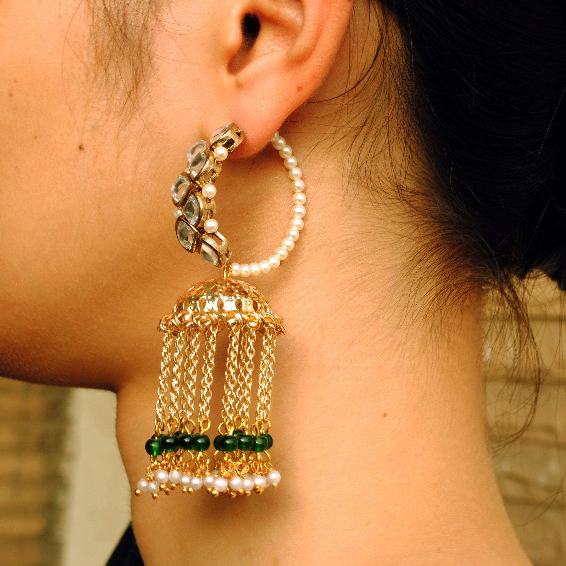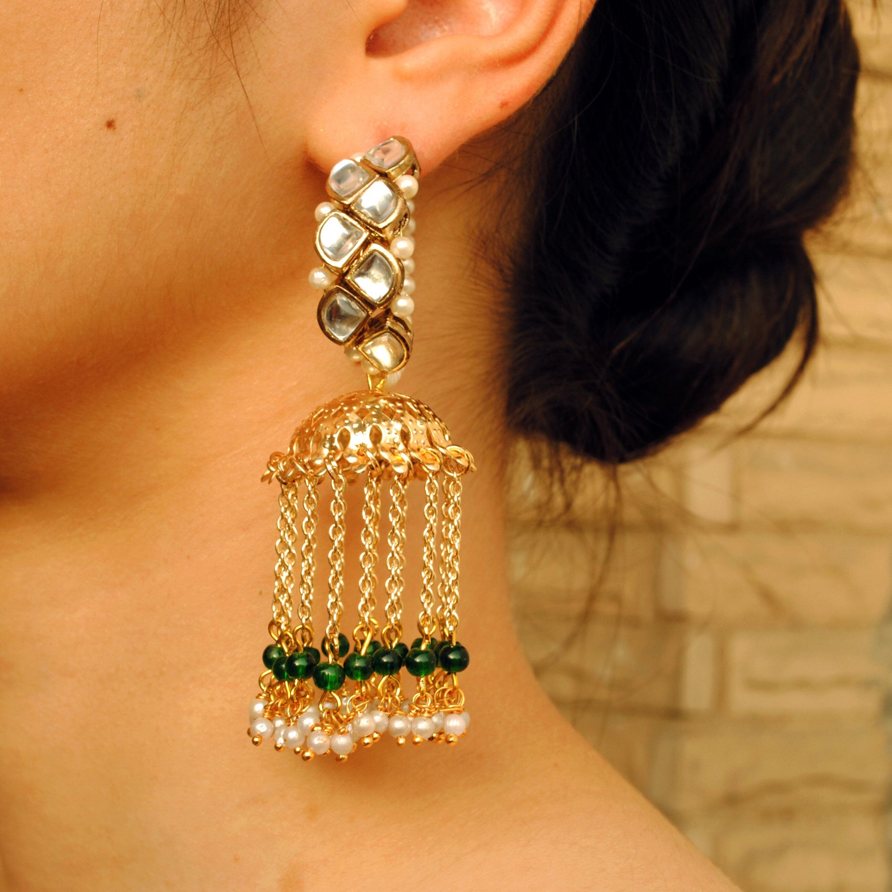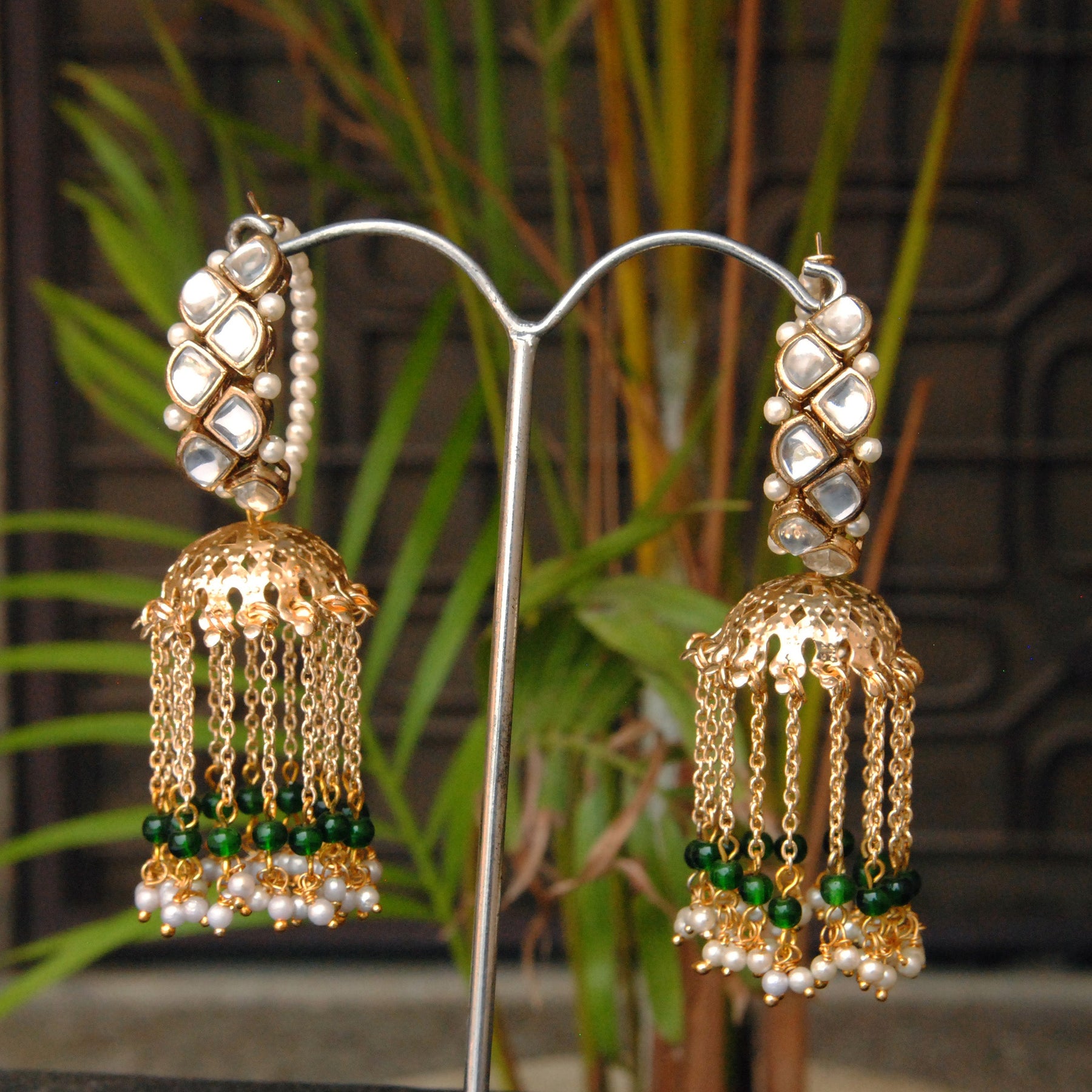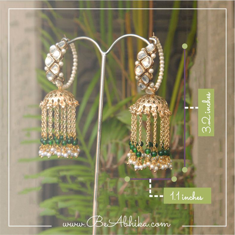 Traditional Gets Infused With Modernity When It Gets A New Form, Same Goes For This Pretty Jhumki Ornated With Dangling Chains And Emerald Colored Beads Connected To A Decorated Kundan Hoop.