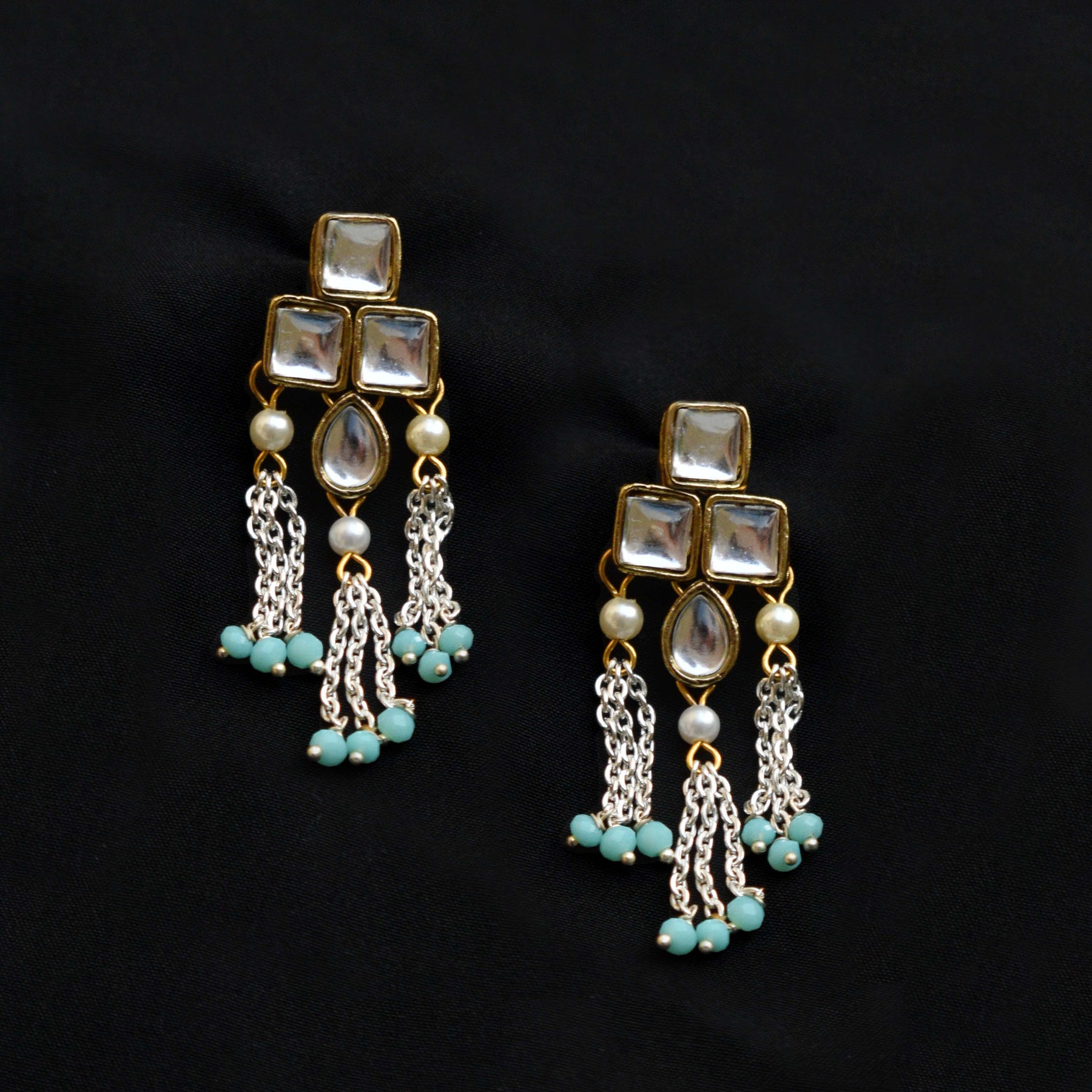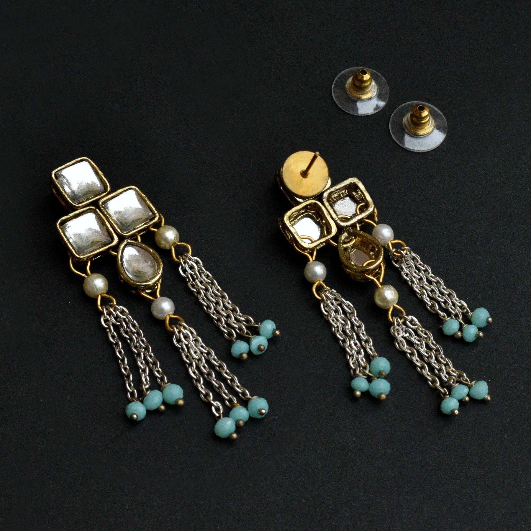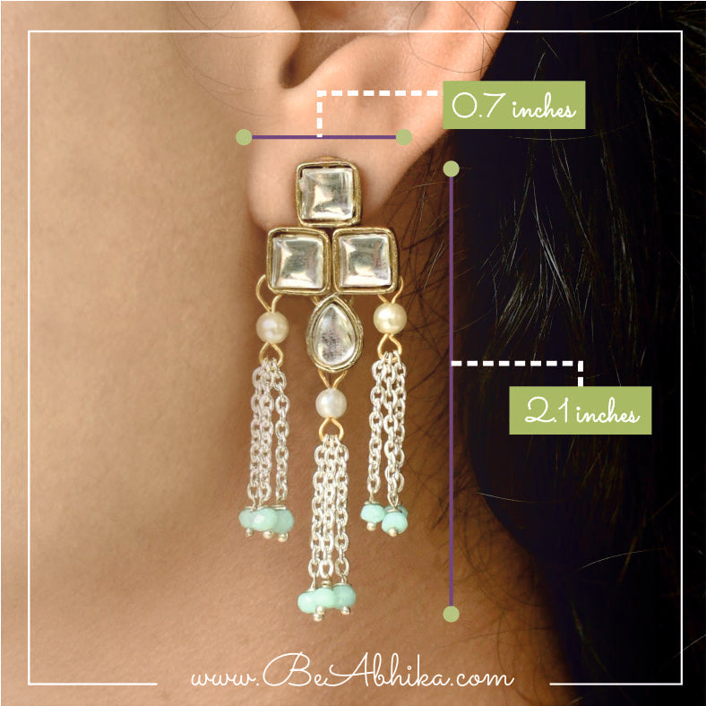 These Elegant Earrings Feature A Stunning Combination Of Traditional And Contemporary Design Elements. The Main Part Of The Earring Consists Of A Trio Of Square Kundan , Arranged In A Cross-Like Formation. Beneath Them, A Teardrop-Shaped Gemstone Adds A Touch Of Elegance. Dangling From These Stones Are Three Delicate Chains, Each Adorned With Tiny Pearls And Mint Green Beads, Adding A Subtle Pop Of Color And Movement. These Earrings Are Perfect For Special Occasions, Offering A Blend Of Sophistication And Charm.