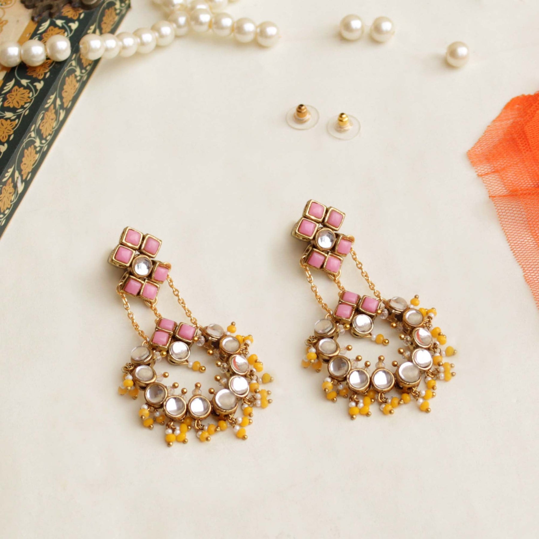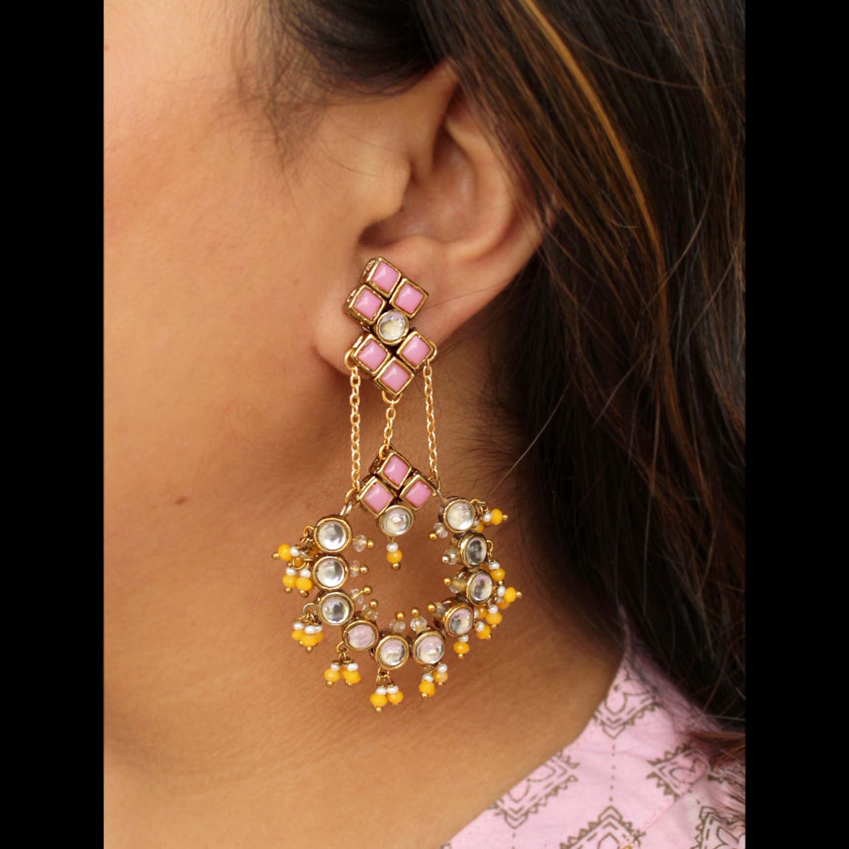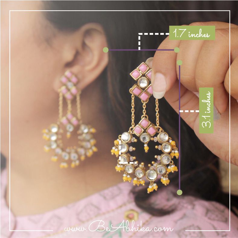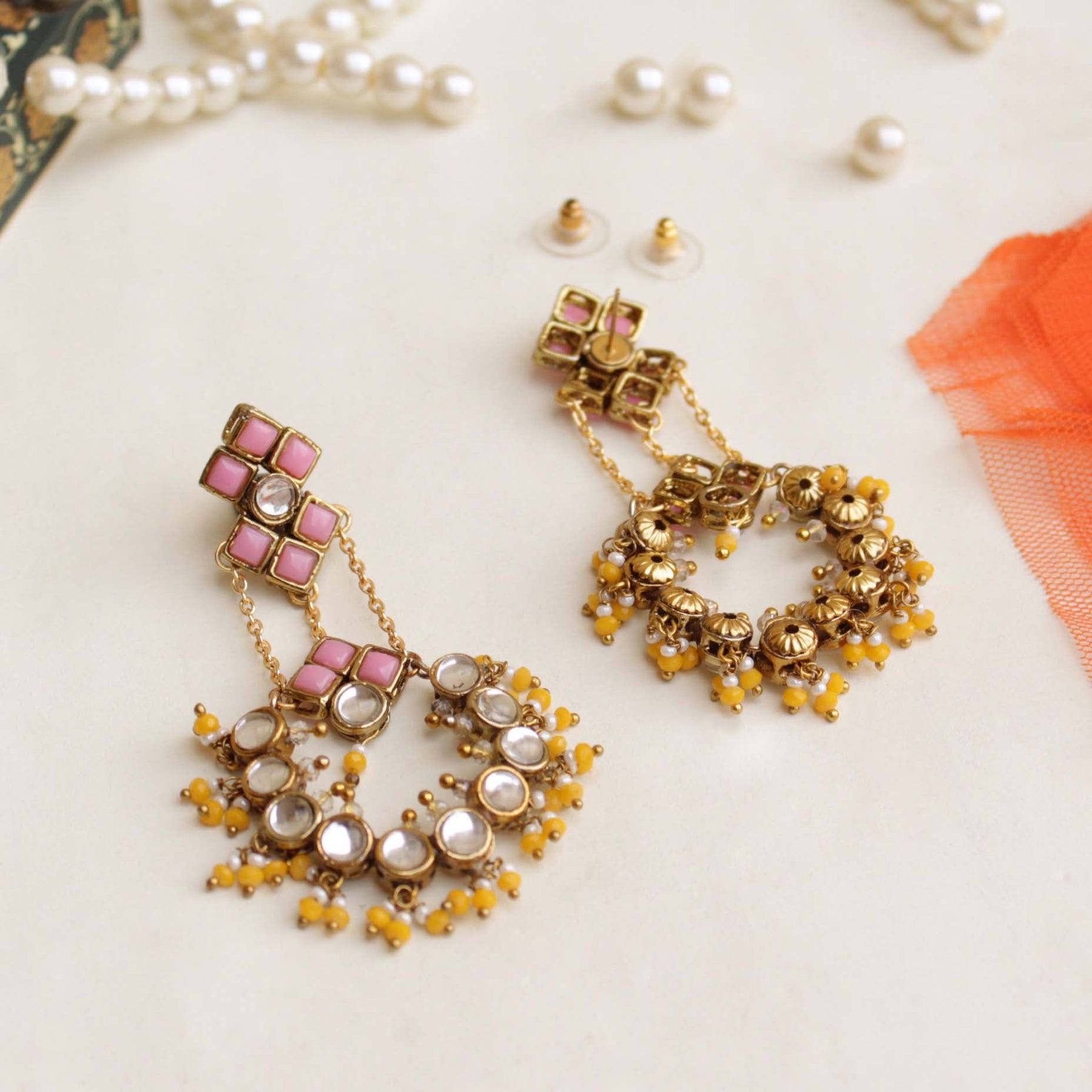 Dramatic Chandbalis With A Unique Design Which Sets It Apart From The Usual Earrings. These Chandbalis Are Exquisite And Intricately Carved. They Have Lovely Hangings Of Yellow Beads To Complete The Look. This Must-Have Design Can Be Worn On Any Occasion To Boost Up Your Style Factor And Enhance The Festive And Wedding Season.