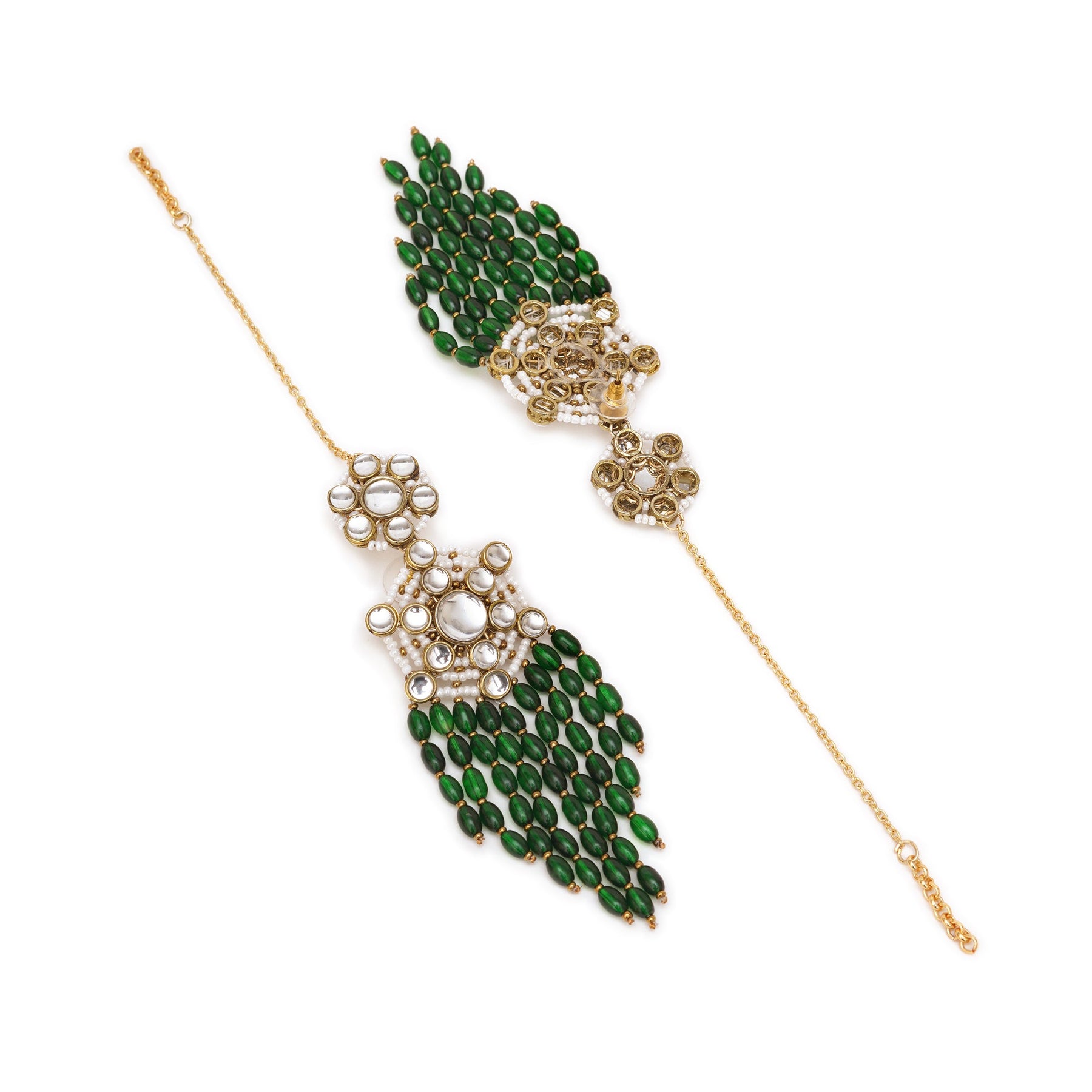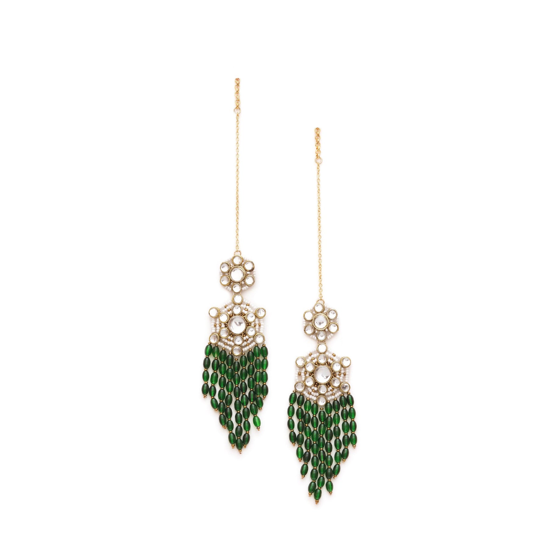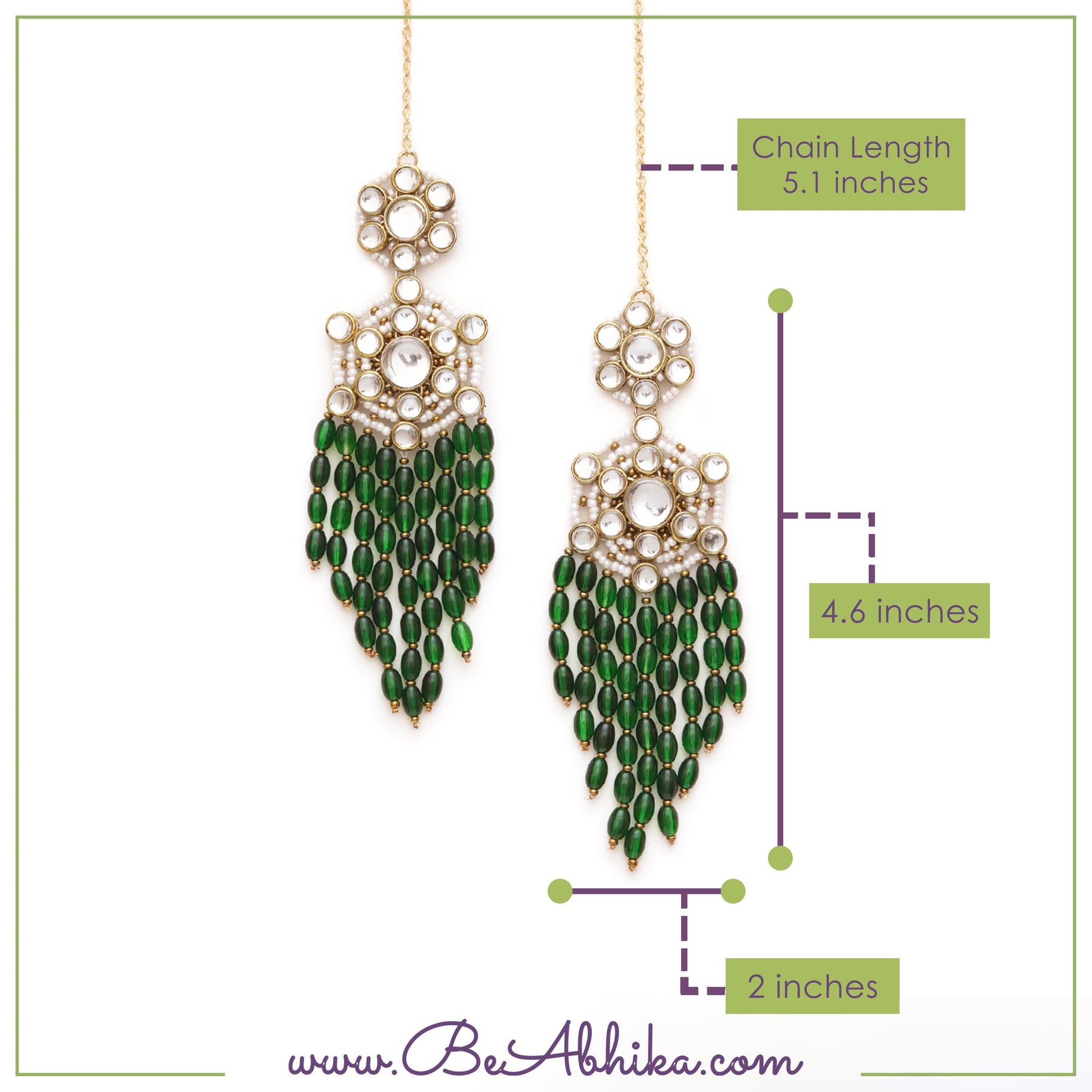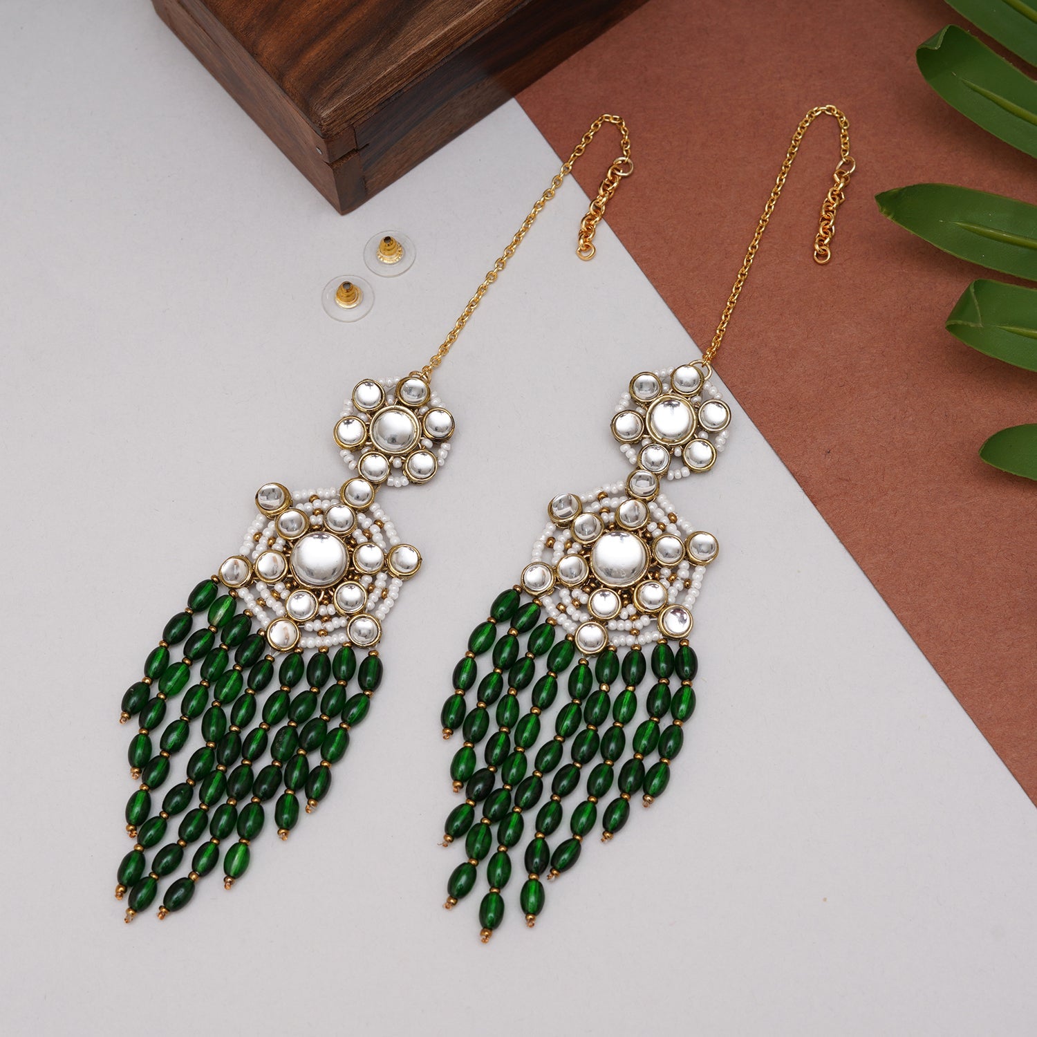 Crafted By Hand In India, Our Long Kundan Chandbali Earrings Embody Timeless Beauty. Dazzling Green Stones Cascade Down From A Decorative Over-The-Ear Chain, Creating A Captivating Display That Moves With You. The Traditional Chandbali Silhouette Features A Curved Hook For Secure Support, While Layers Of Delicate Chains And Beads Dangle Gracefully. These Earrings Culminate In Stunning Green Stones That Add A Vibrant Pop Of Color, Making Them The Perfect Finishing Touch For Any Special Occasion. Embrace Your Inner Majesty And Elevate Your Ethnic Attire Or Everyday Look With A Touch Of Regal Elegance And Cultural Flair.