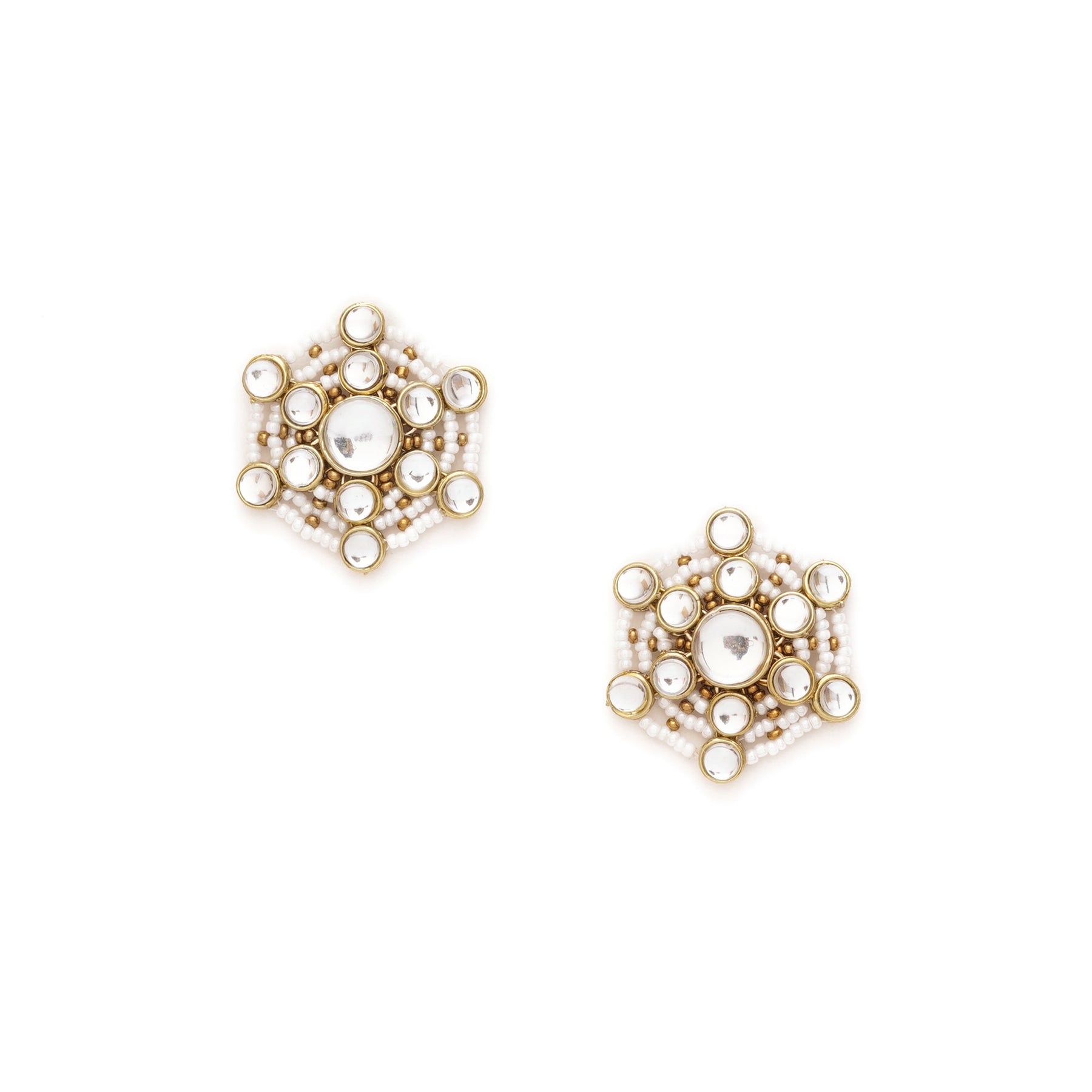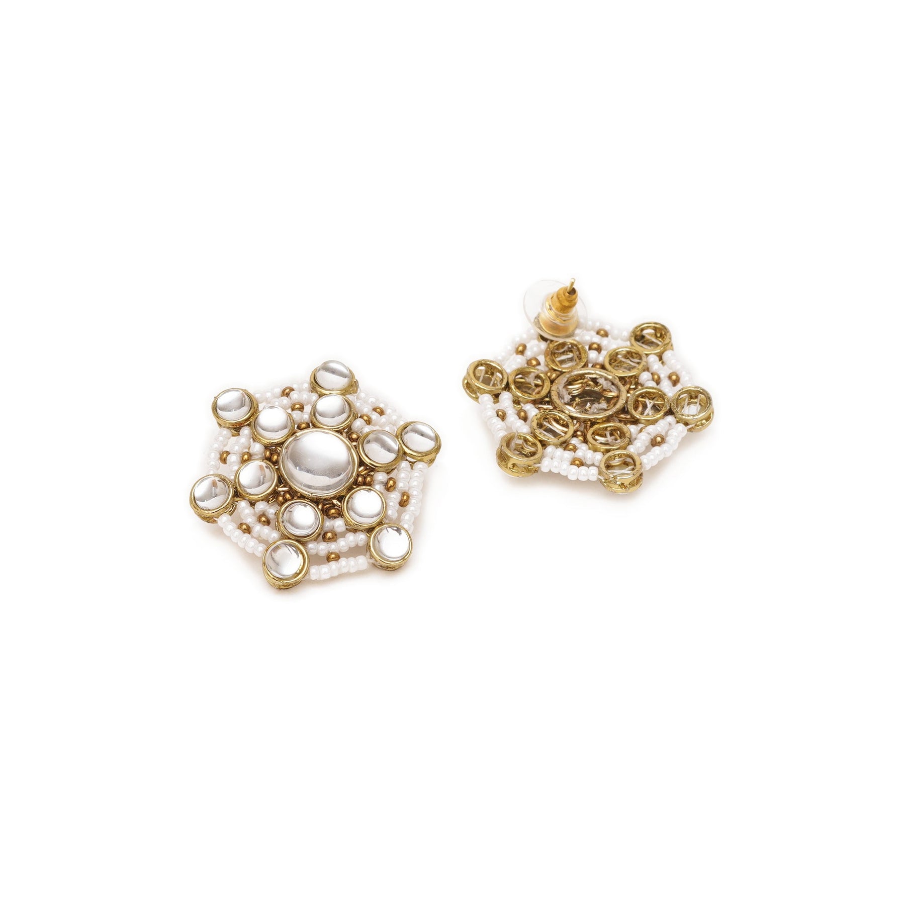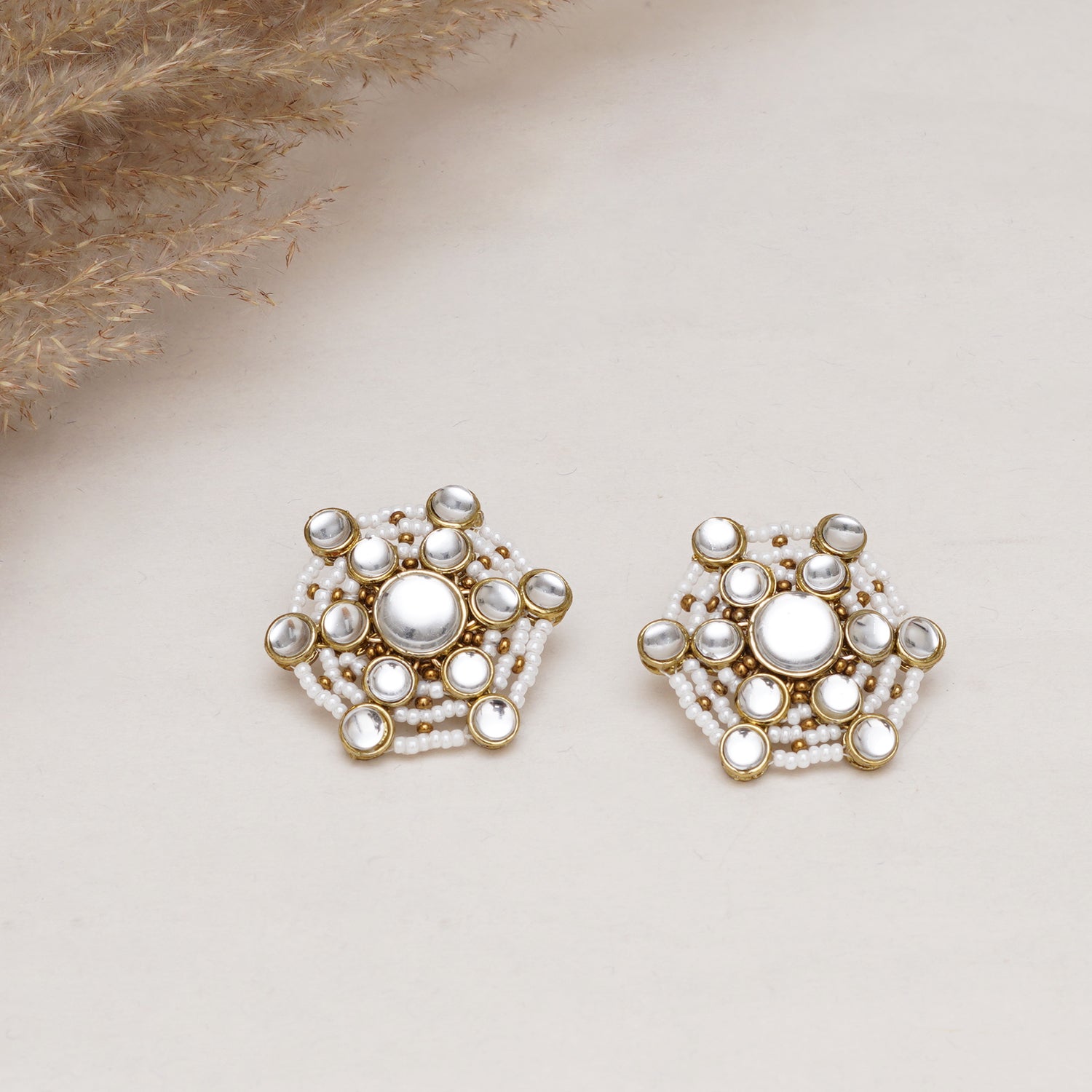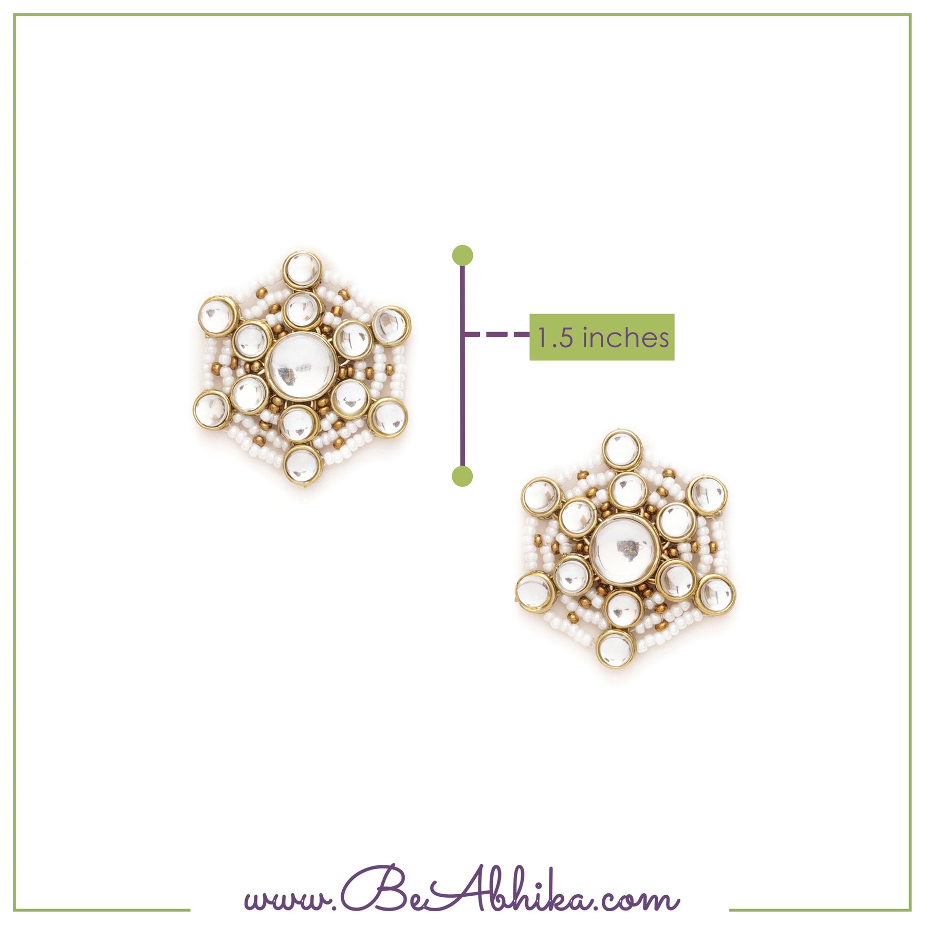 Discover The Epitome Of Traditional Elegance With Our Handcrafted Kundan Stud Earrings. Each Piece Is A Work Of Art, Showcasing The Luminous Splendor Of High-Quality Kundan Stones, Masterfully Set In A Rich Gold Finish. The Central Stone, Larger And More Striking, Is Surrounded By A Halo Of Delicate Pearls, Adding To The Design’S Regal And Sophisticated Charm. These Earrings Are Not Just An Accessory But A Statement Of Luxury, Perfect For Weddings, Festivals, And Formal Gatherings. They Are A Testament To The Beauty Of Handmade Jewelry, Ensuring That Each Pair Is Unique. Presented In Thoughtful Packaging, These Kundan Studs Make A Splendid Gift Or A Treasured Addition To Your Own Collection. Embrace The Allure Of These Exquisite Earrings And Let Them Add A Touch Of Glamour To Your Every Ensemble.