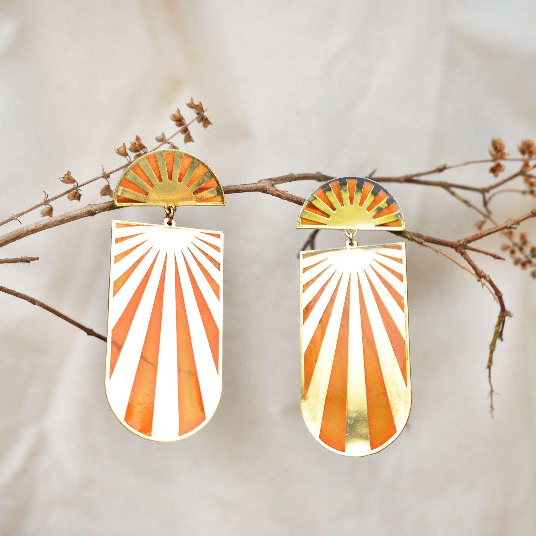 These Sun Shine Resin Earrings Exude The Warmth And Radiance Of A Summer Day. The Design Features A Semi-Circular Top With Segments In Gold And Orange, Evoking The Image Of A Rising Or Setting Sun. Below, The Elongated Teardrop Pendant With Vertical Orange And White Stripes Resembles Sun Rays Cascading Downwards. The Vibrant Colors And Sunburst Pattern Make These Earrings A Bright And Cheerful Accessory, Perfect For Adding A Touch Of Sunshine To Any Outfit. πβ¨