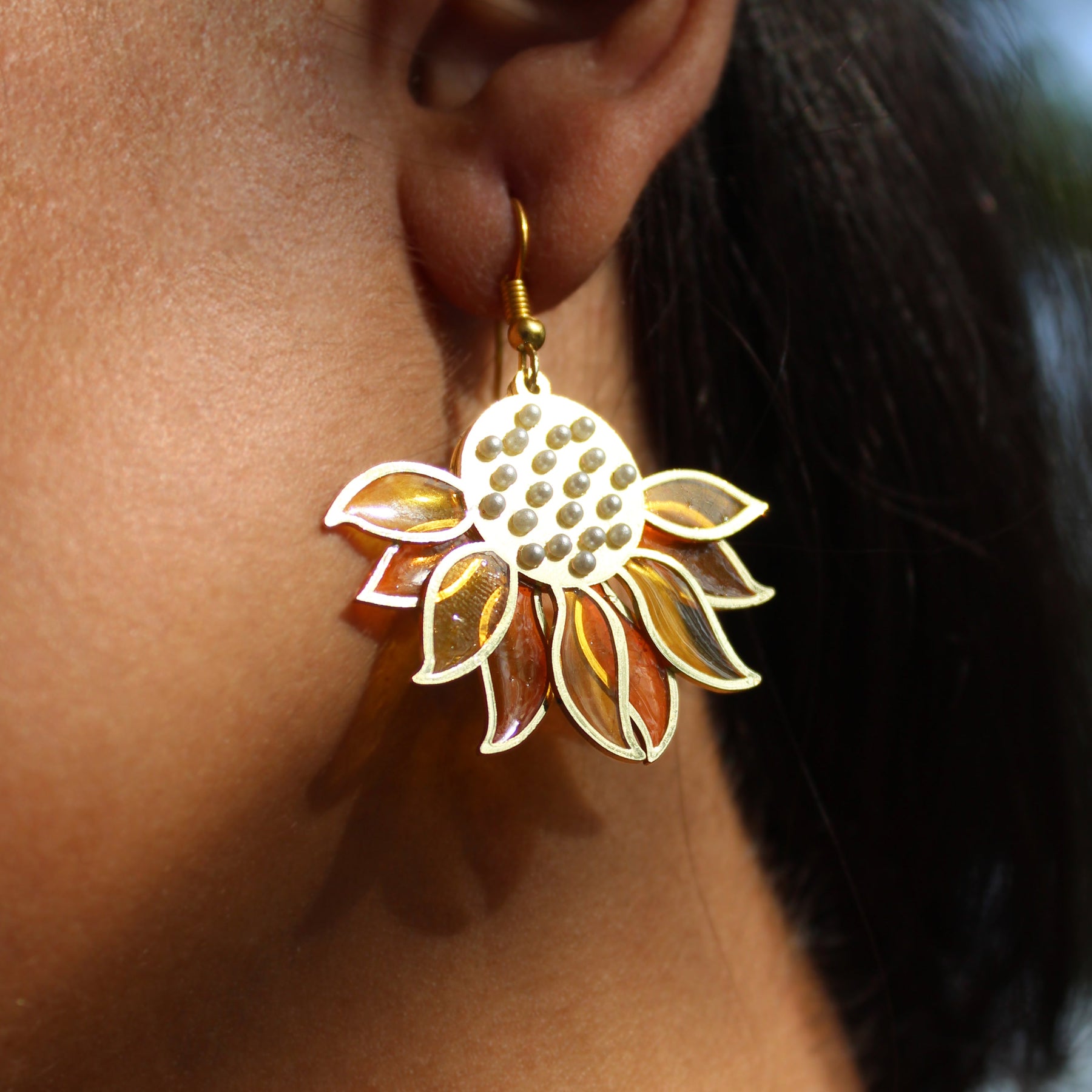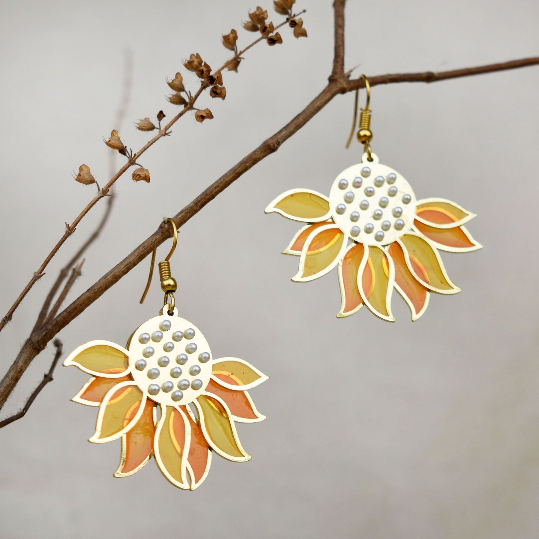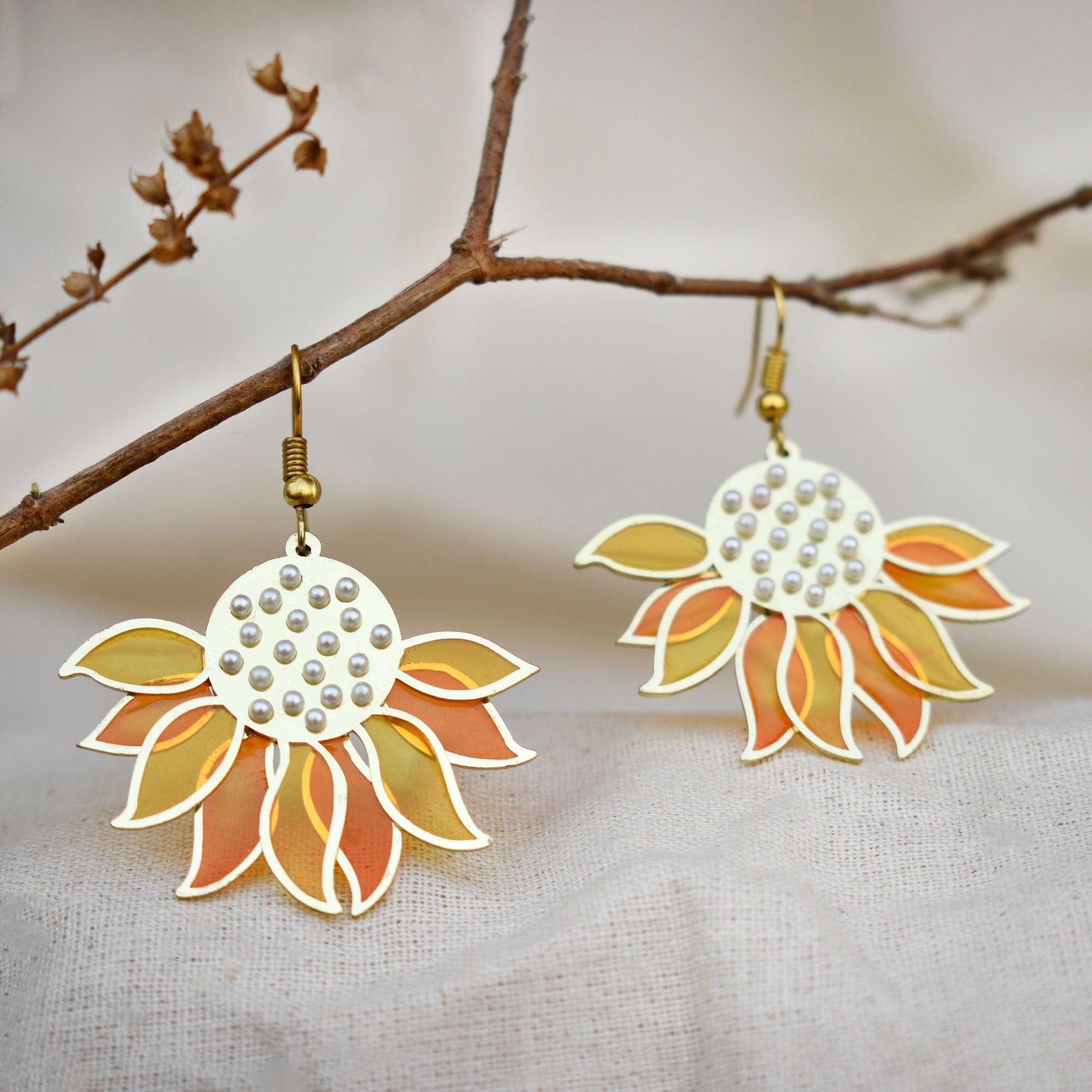 These Sunflower Resin Earrings Are A Charming Celebration Of Nature’S Beauty. Each Earring Is Designed To Resemble A Sunflower, Complete With A Circular Center Filled With Pearl-Like Embellishments That Evoke The Appearance Of Sunflower Seeds. The Petals, In Vibrant Shades Of Yellow And Orange, Radiate Outward, Capturing The Sunflower’S Iconic Look. The Golden Outline Enhances Their Elegance, And The Gold-Toned Hooks Add A Touch Of Luxury. These Earrings Are Perfect For Those Who Love Botanical Designs And Wish To Carry The Joy Of Sunflowers With Them. 🌻✨