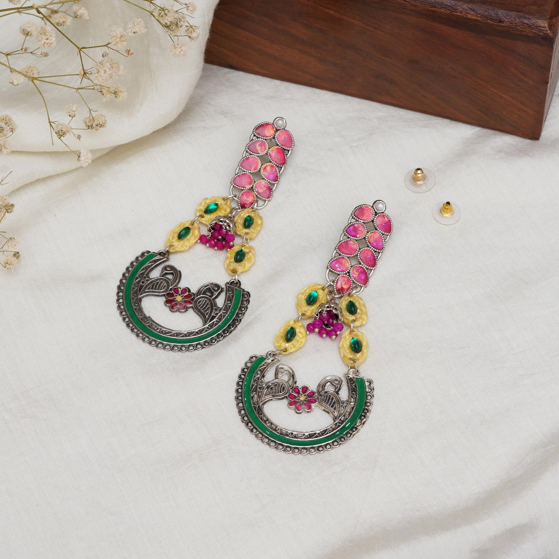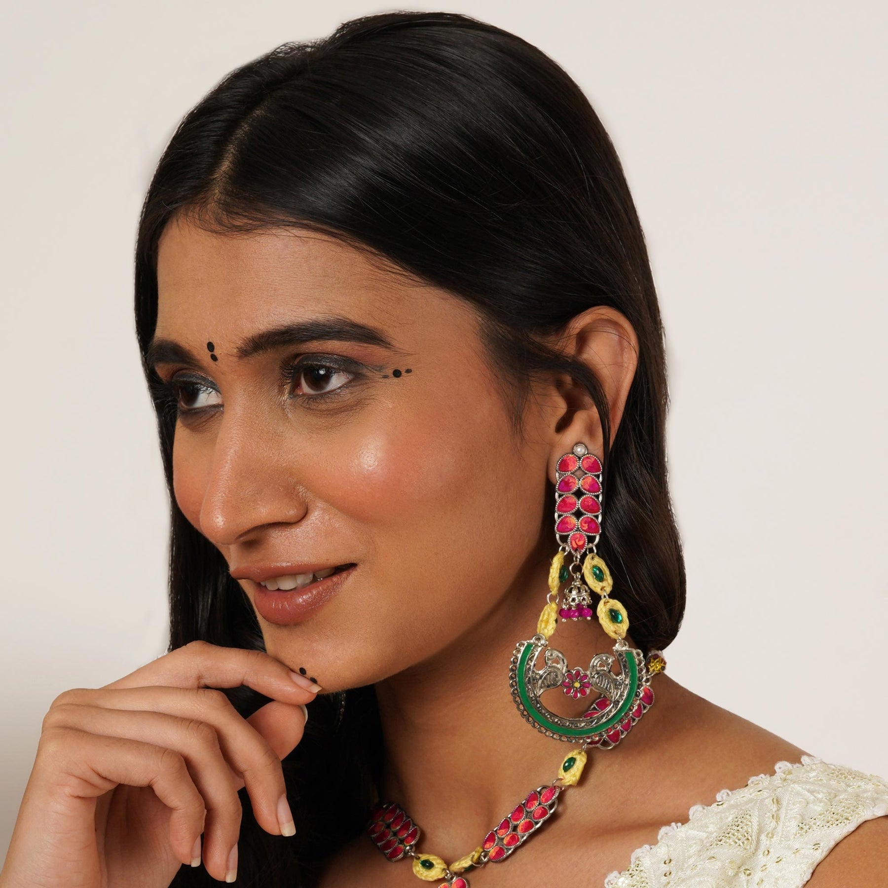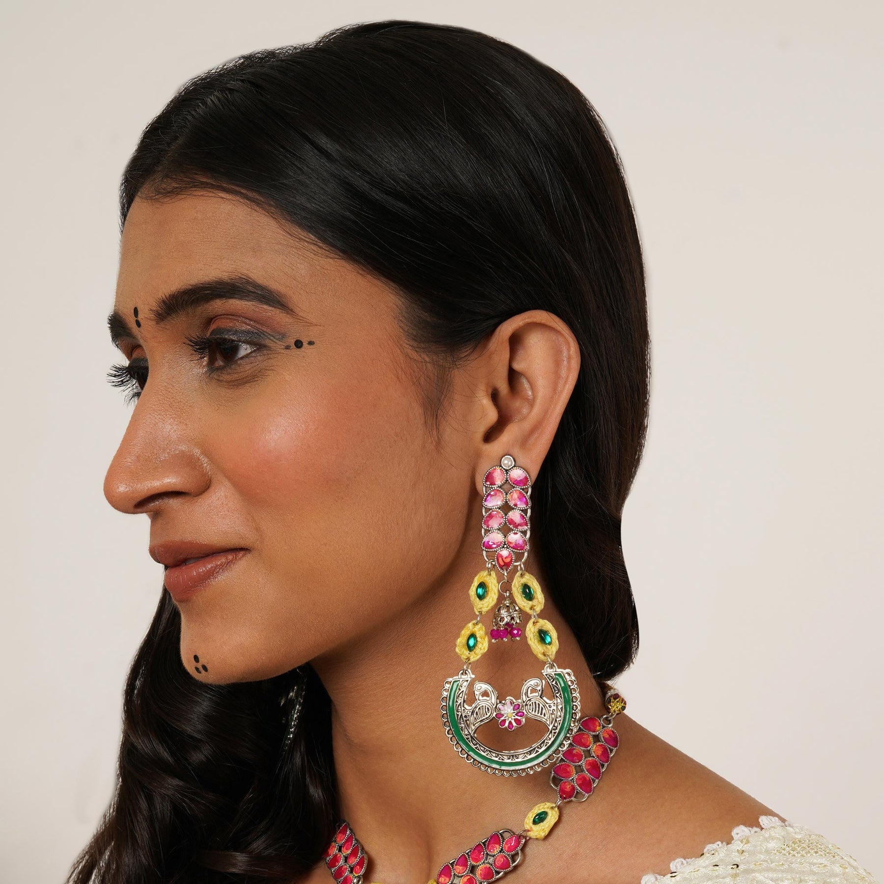 Make A Bold Statement With These Exquisite Peacock Charm Multicolor Statement Earrings, Featuring A Stunning Combination Of Multicolored Gemstones, Intricate Silver Detailing, And Delicate Enamel Work. These Earrings Are A Perfect Blend Of Traditional Indian Craftsmanship And Modern Bohemian Charm, Designed To Bring A Splash Of Color And Elegance To Any Outfit.