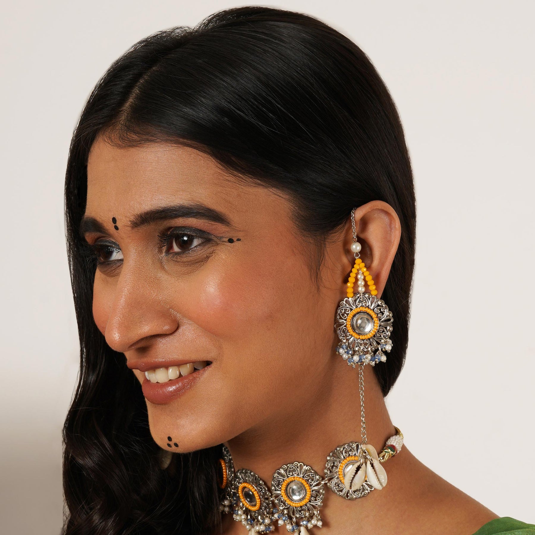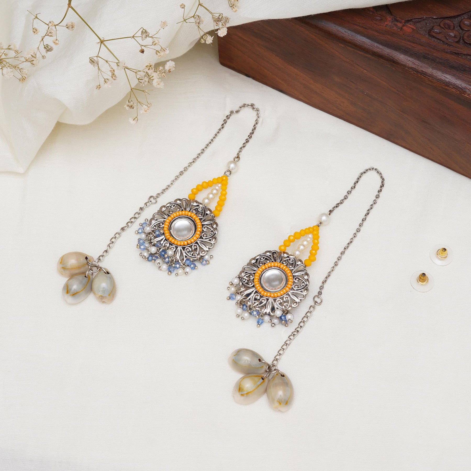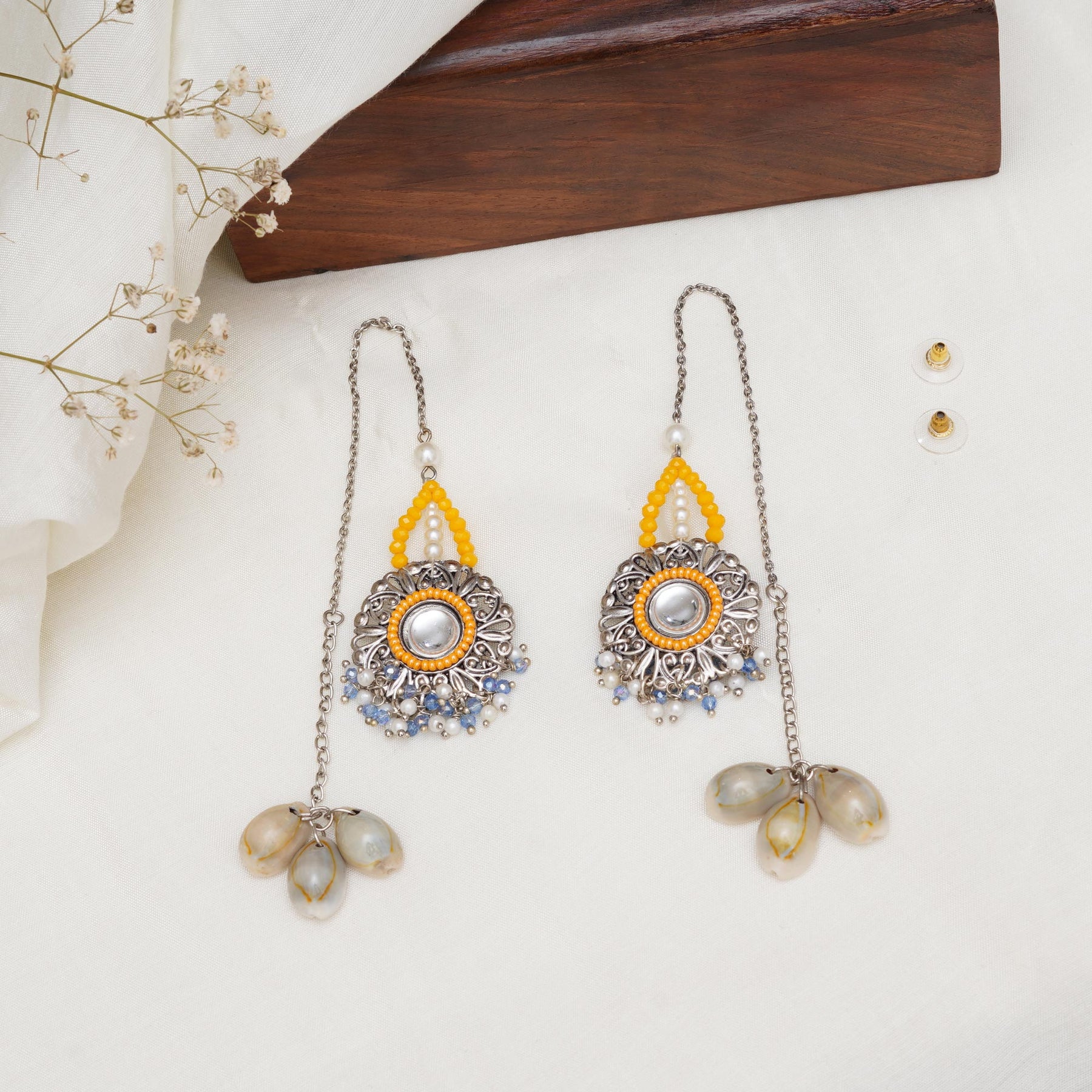 Elevate Your Style With These Stunning Handcrafted Kanuati Earrings, Featuring Intricate Silver Detailing And Vibrant Yellow Beads. Designed With A Unique Floral-Inspired Motif, These Earrings Add A Boho-Chic Touch To Any Outfit. The Delicate Drop Design, Embellished With Soft Blue Accents And Dangling Bead Clusters, Creates An Elegant Statement Look. Lightweight And Versatile, They Are Perfect For Everyday Wear Or Special Occasions. Pair Them With Ethnic Or Casual Outfits For A Perfect Blend Of Tradition And Contemporary Style."
