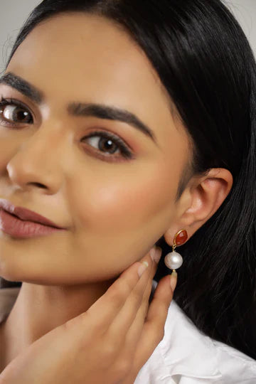 Carnelian and pearl earring made in 925 real sterling silver with 18k gold plated over and anti tarnish coat Stone :Carnelian, Pearl Closure Type :Button Composition :925 Silver with Stones and Gold Polish Color :Gold Weight :70 GM