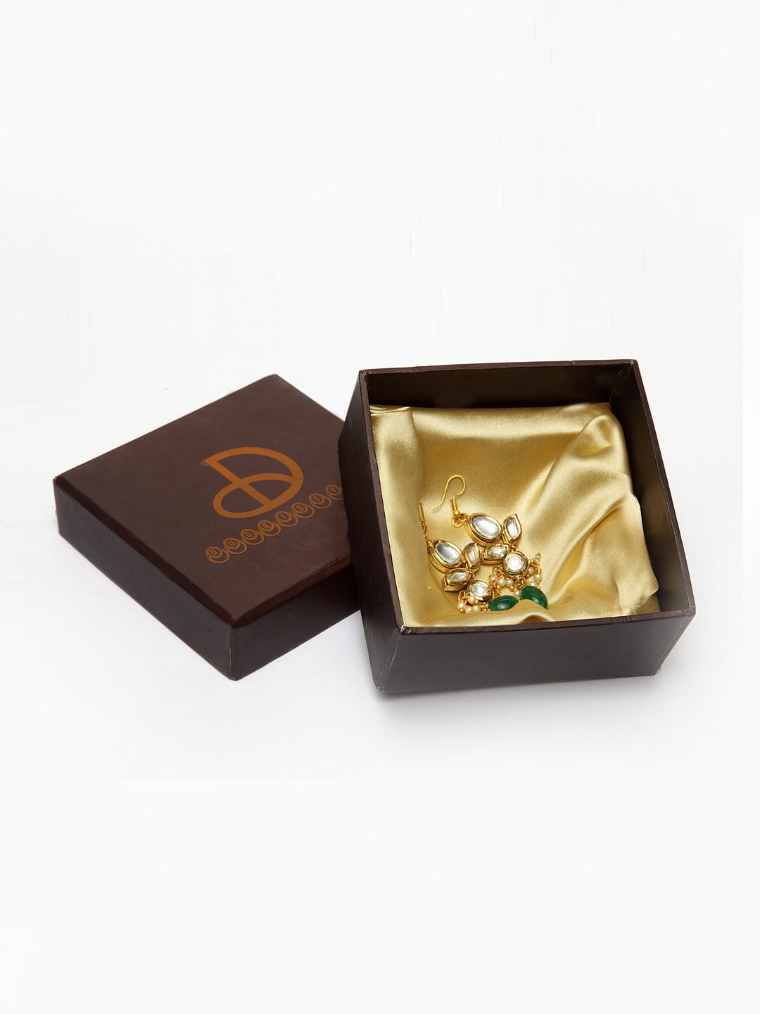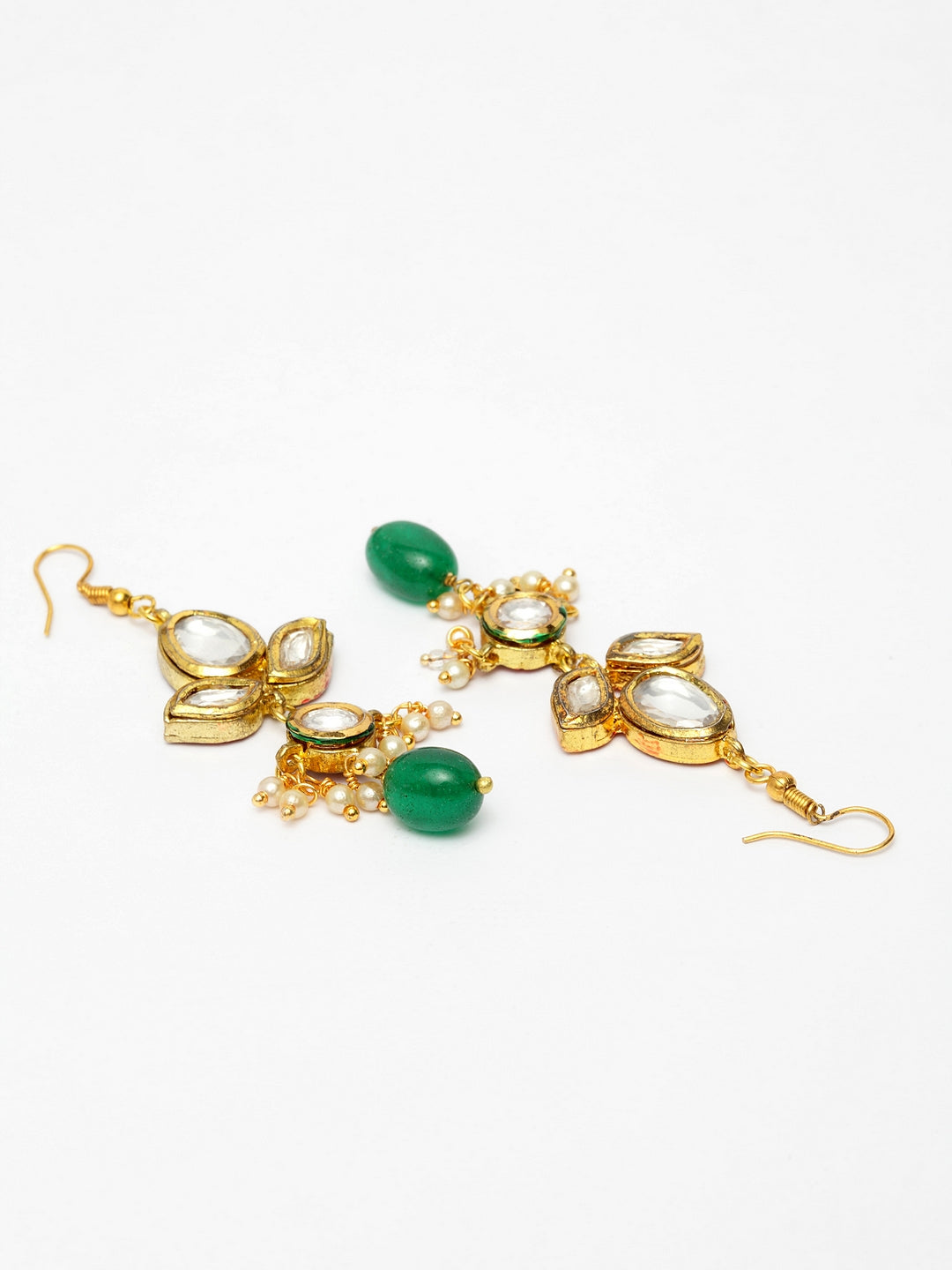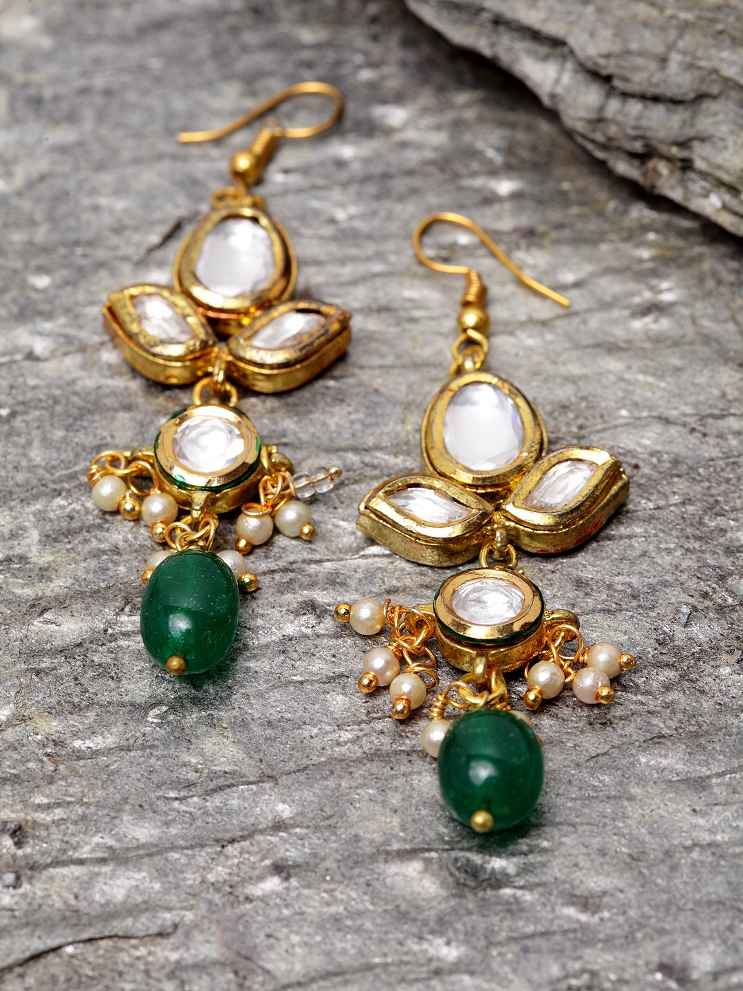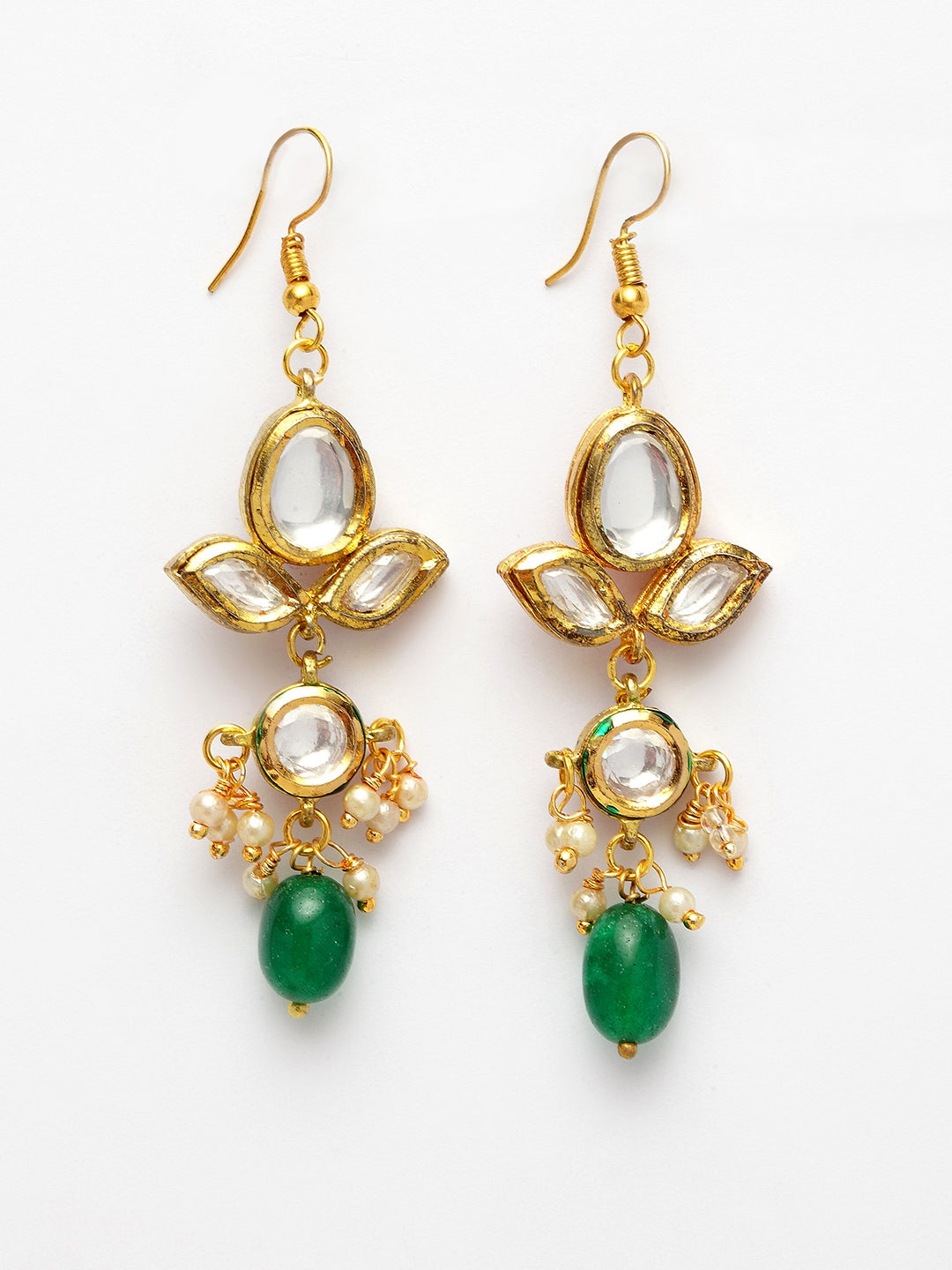 Green & Dangler Earring With Kundan &; Category Of Jewellery Is Earring; Sub Category Is Drop; Ideal For Women; Base Color Is Green; Gemstones Used - Kundan; Plating Is Gold-Plated; Base Metal Is Alloy; Other Material Used - ; Size Is Freesize; Adjustable - No; Weight Is 17 Gms; Mesaurements - Length Of Earring= 5.5 Cm; Width Of Earring =2.5 Cm ; Content