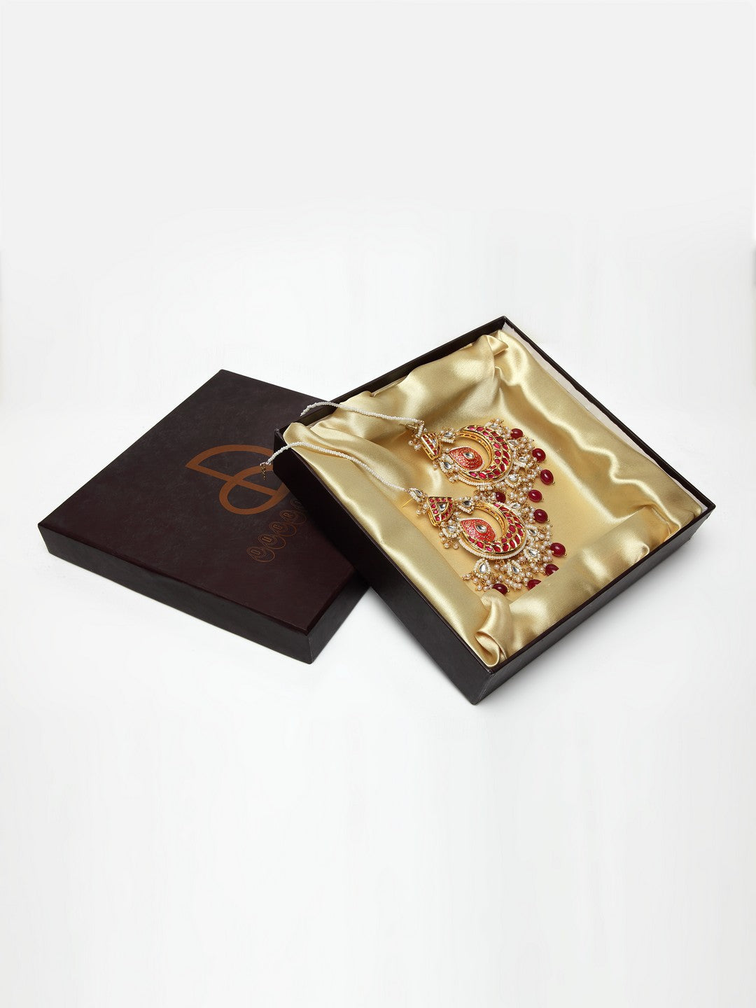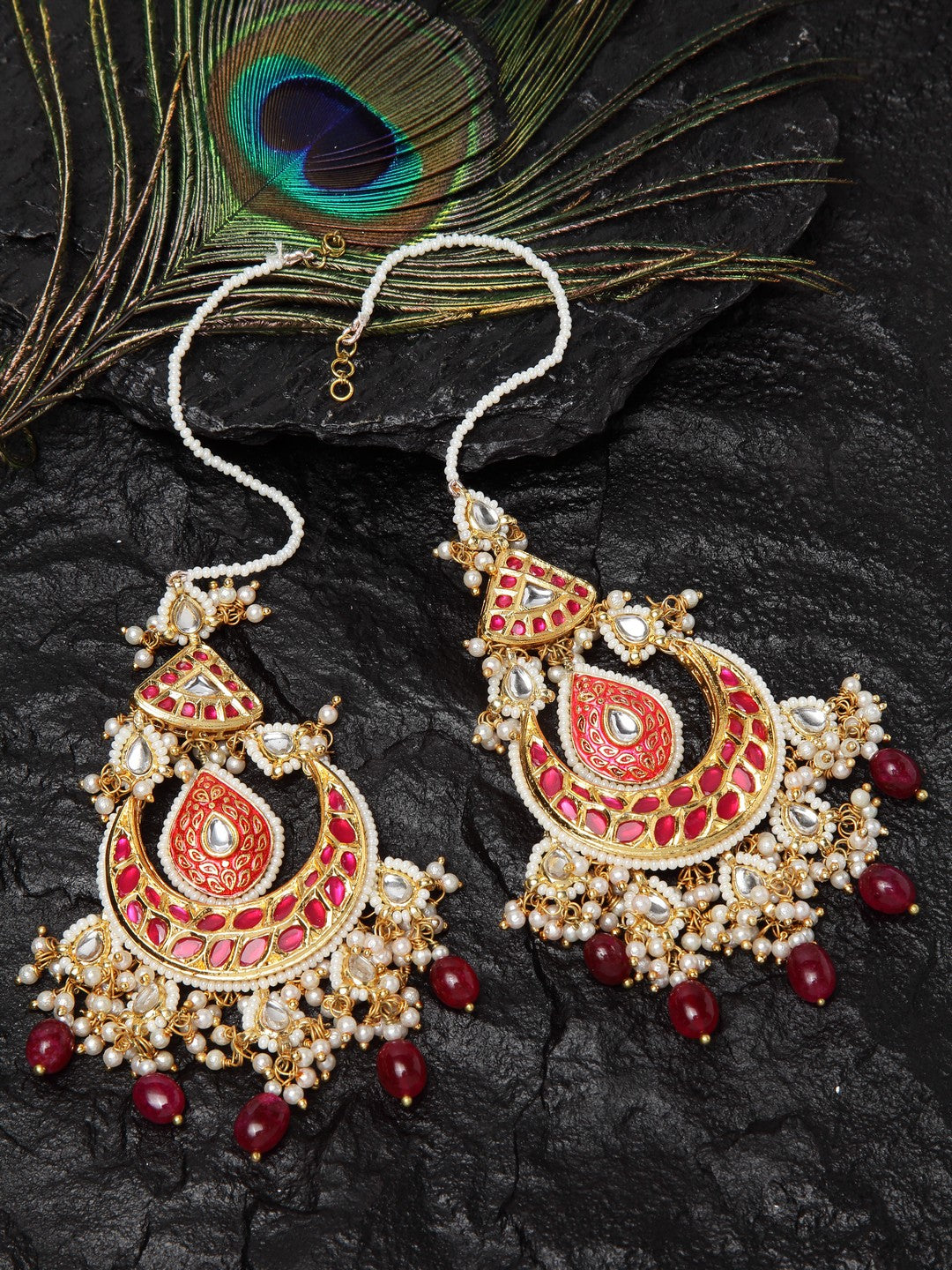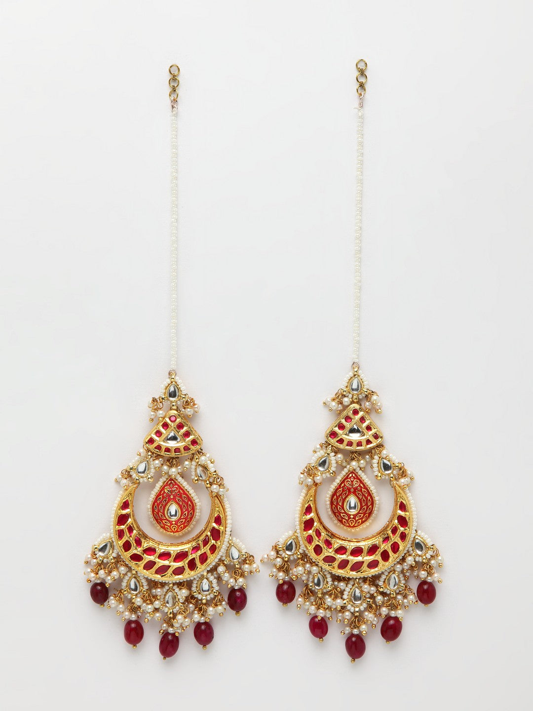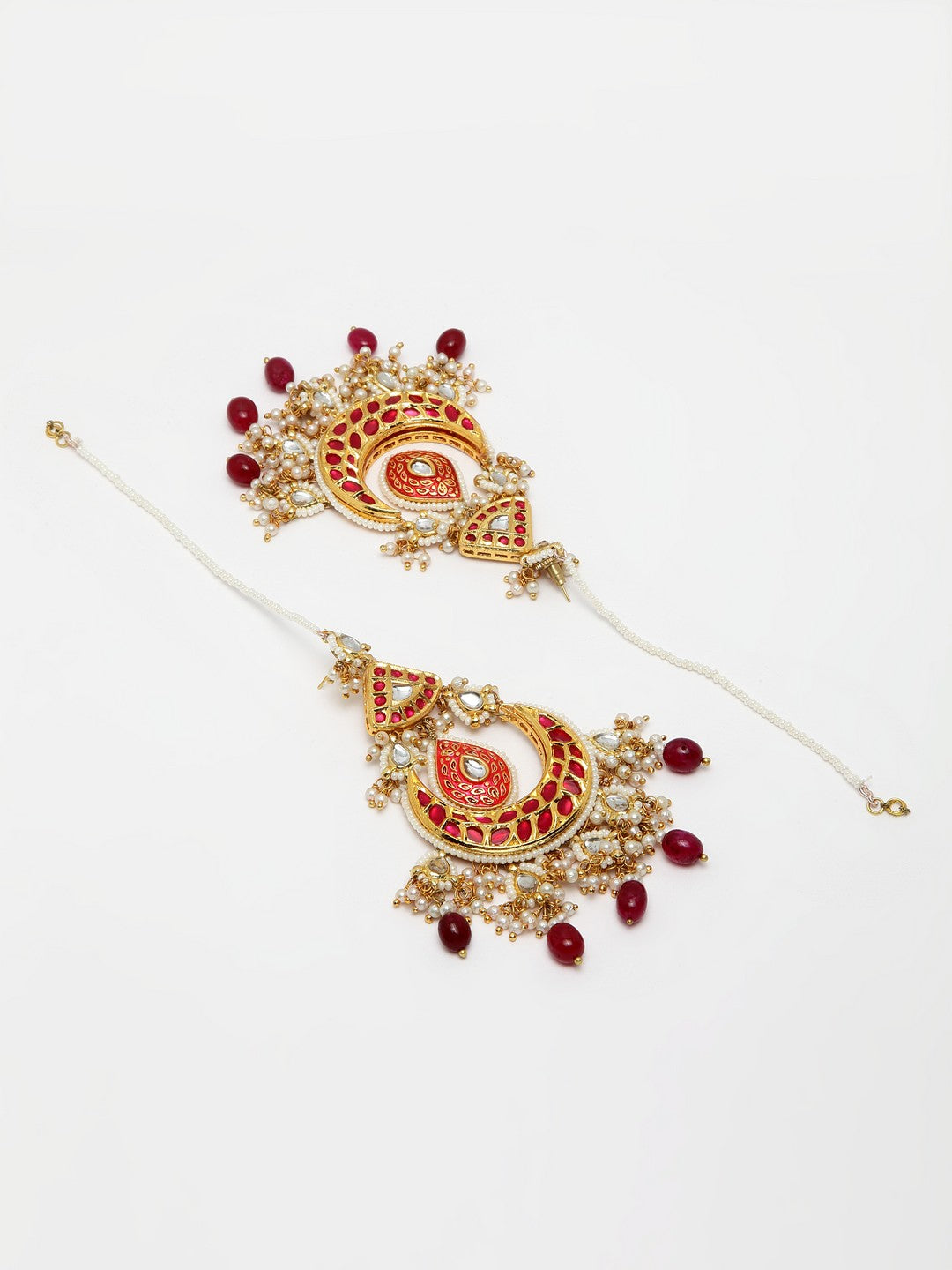 Red Earring With Kundan & Pearls; Category Of Jewellery Is Earring; Sub Category Is Drop; Ideal For Women; Base Color Is Red; Gemstones Used - Kundan, Pearls, Faux Ruby; Plating Is Gold-Plated; Base Metal Is Alloy; Other Material Used - Latch Back Earring Closure; Size Is Freesize; Adjustable - No; Weight Is 35 Gms; Mesaurements - Length Of Earring= 7 Cm; Width Of Earring =3 Cm; Content 1 Pair Earring And 1 Kanchain