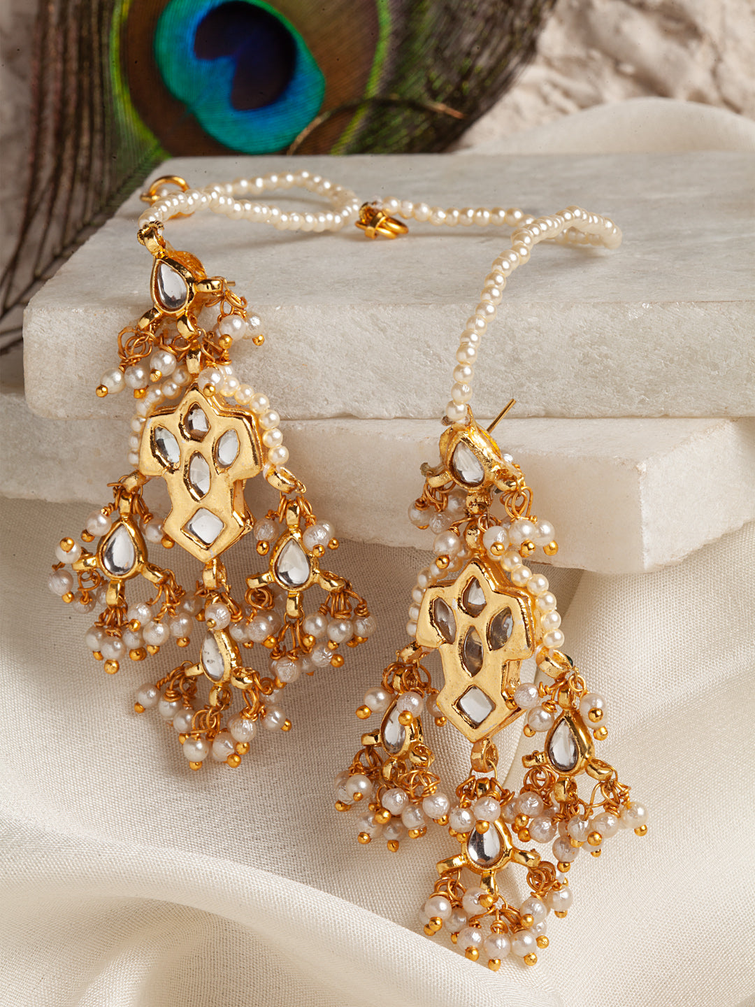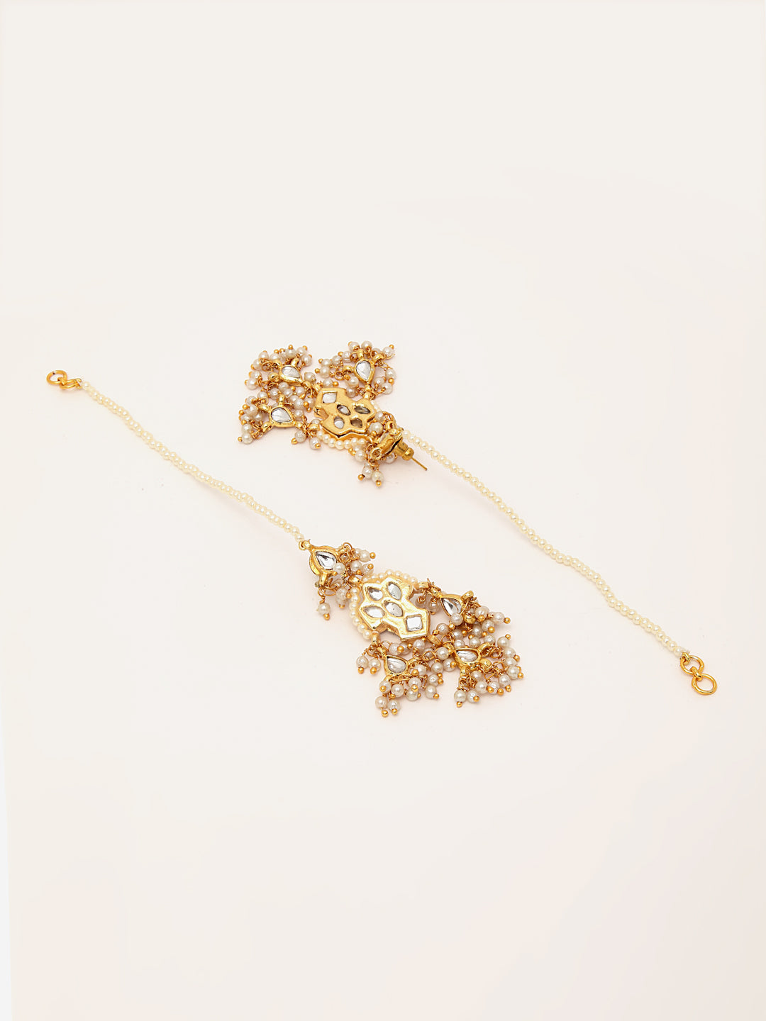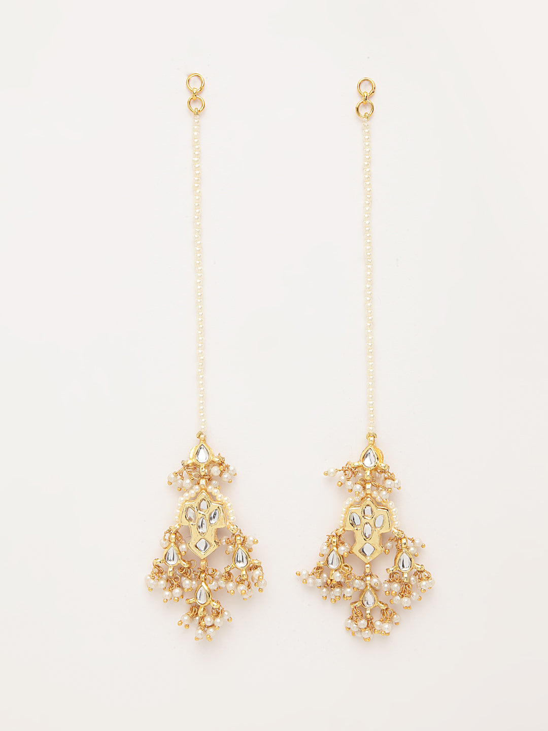 Gold Dangler Earring With Kundan & Pearls; Category Of Jewellery Is Earring; Sub Category Is Drop; Ideal For Women; Base Color Is Gold; Gemstones Used - Kundan, Pearls; Plating Is Gold-Plated; Base Metal Is Alloy; Other Material Used - Kanchain; Size Is Freesize; Adjustable - No; Weight Is 15 Gms; Mesaurements - Length Of Earring= 7.5 Cm; Width Of Earring =3 Cm; Content 1 Pair Earring