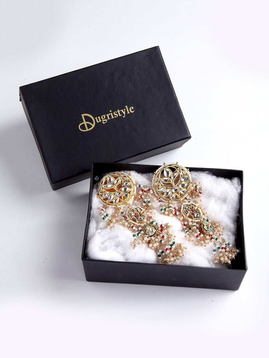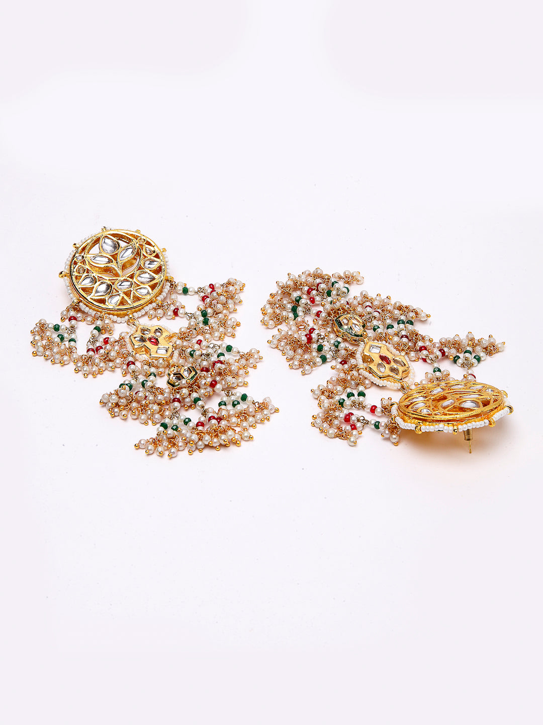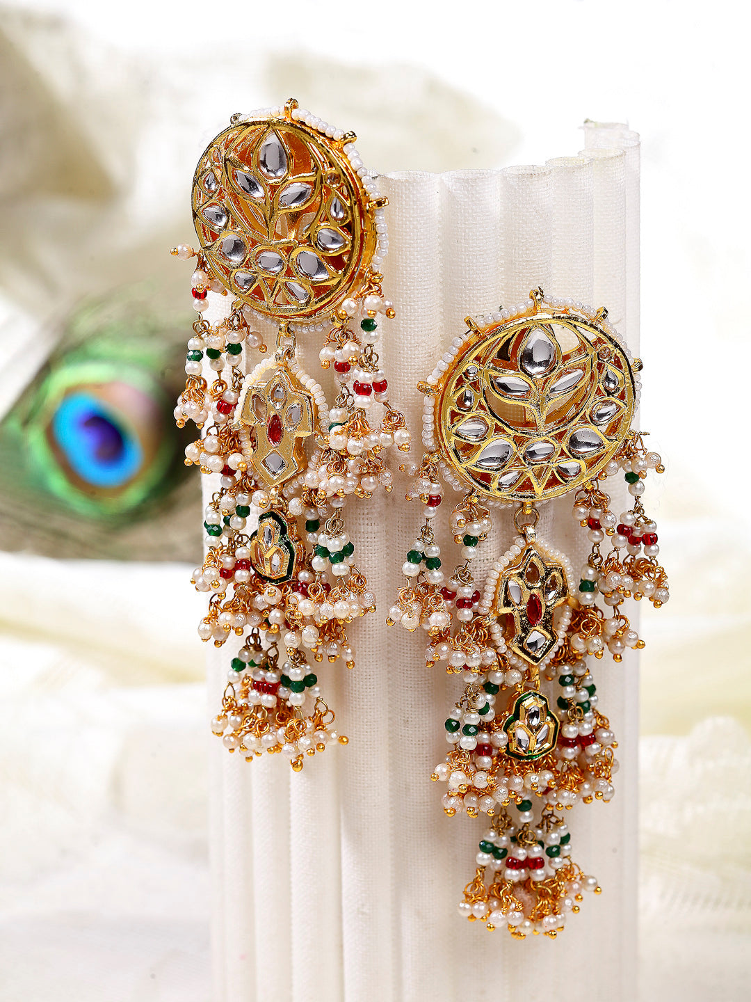 Gold & Red Dangler Earring With Kundan & Pearls; Category Of Jewellery Is Earring; Sub Category Is Drop; Ideal For Women; Color Is Gold,Red, White, Green; Gemstones Used - Kundan, Pearls, Natural Stones, Faux Ruby, Faux Emerald; Plating Is Gold-Plated; Base Metal Is Alloy; Other Material Used - Closure Stopper; Size Is Freesize; Adjustable - No; Weight Is 70 Gms; Mesaurements - Length Of Earring= 12 Cm; Width Of Earring =6 Cm; Adjustable - No; Content 1 Pair Earring