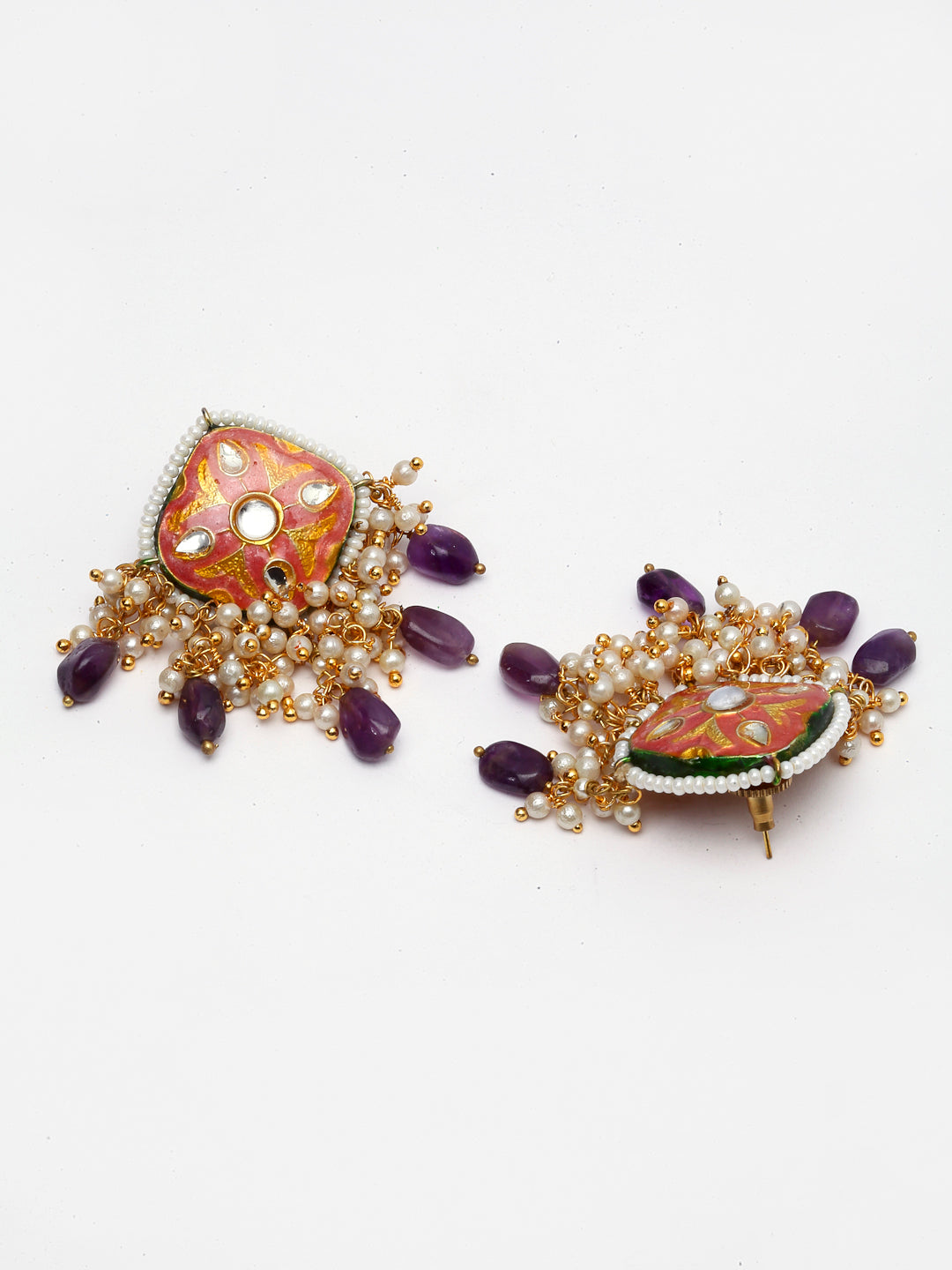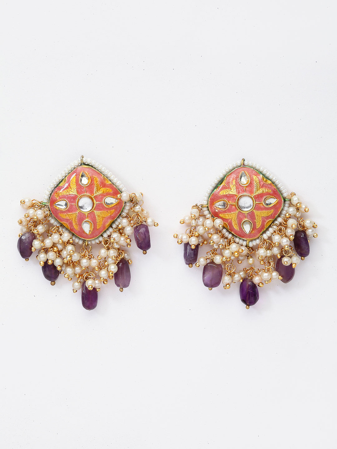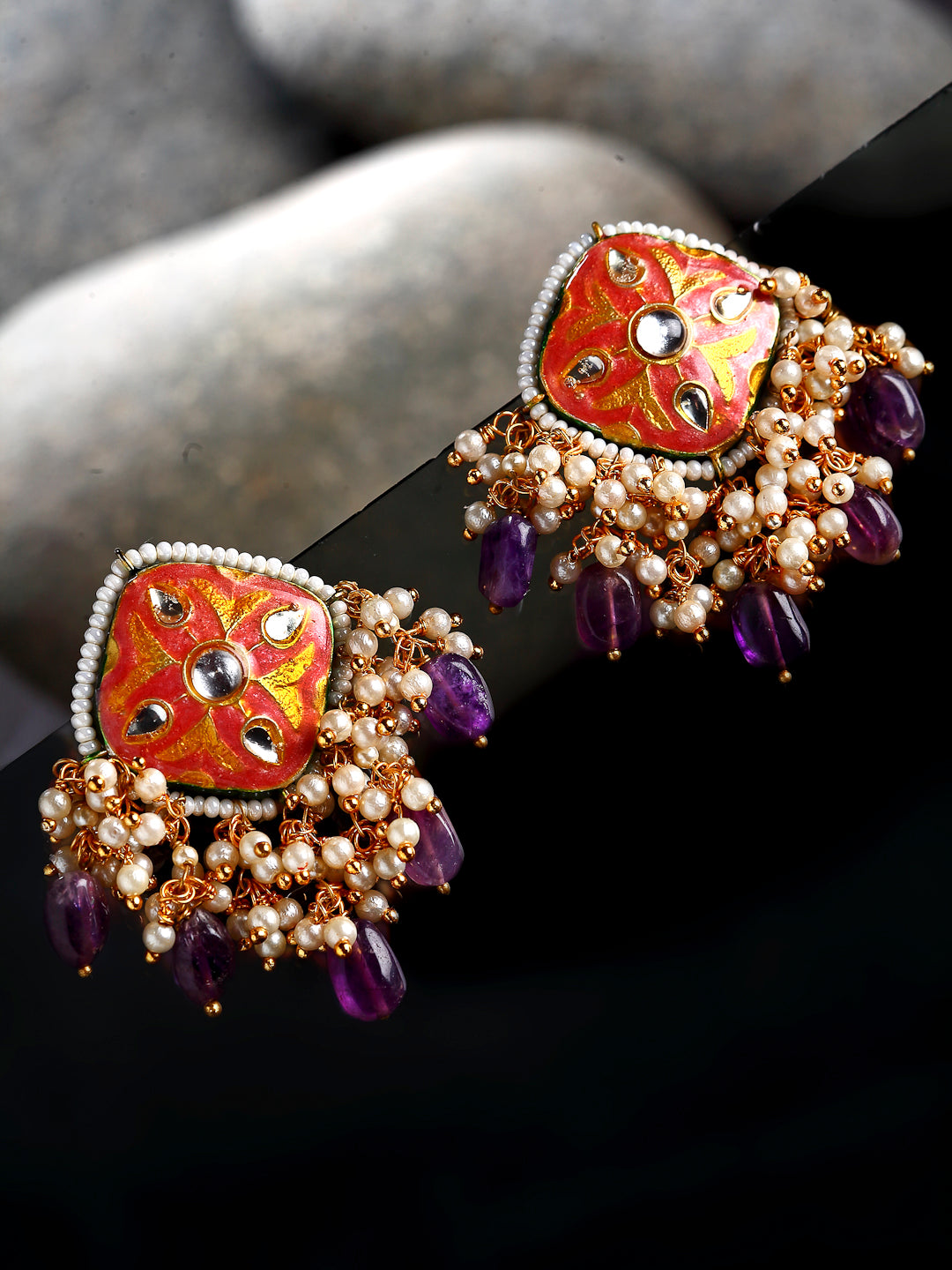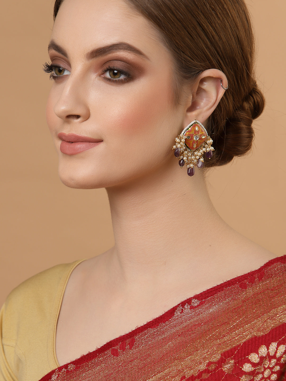 Red And White Handmade Meenakari Earrings To Style And Uplift U For Any Event. All You Need Is To Style It With Ur Sunshine Smile.; Category Of Jewellery Is Earring; Sub Category Is Drop; Ideal For Women; Color Is Red, White, Gold; Gemstones Used - Kundan, Pearls, Natural Stones, Faux Ruby; Plating Is Gold-Plated; Base Metal Is Alloy; Other Material Used - Closure Stopper; Size Is Freesize; Adjustable - No; Weight Is 22 Gms; Mesaurements - Length Of Earring= 5.5 Cm; Width Of Earring =4 Cm; Adjustable - No; Content 1 Pair Earring