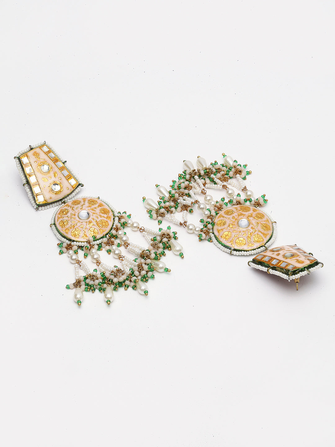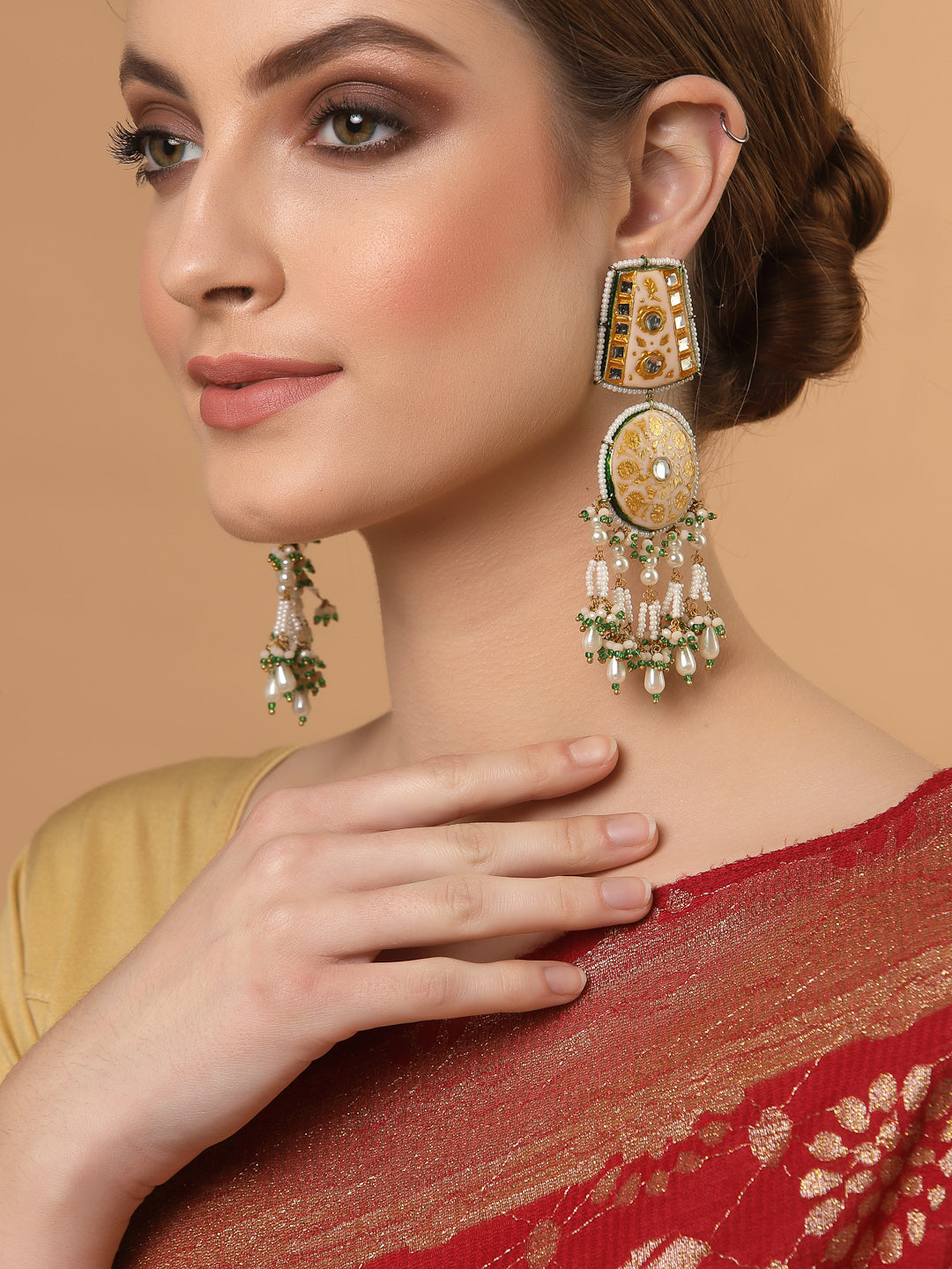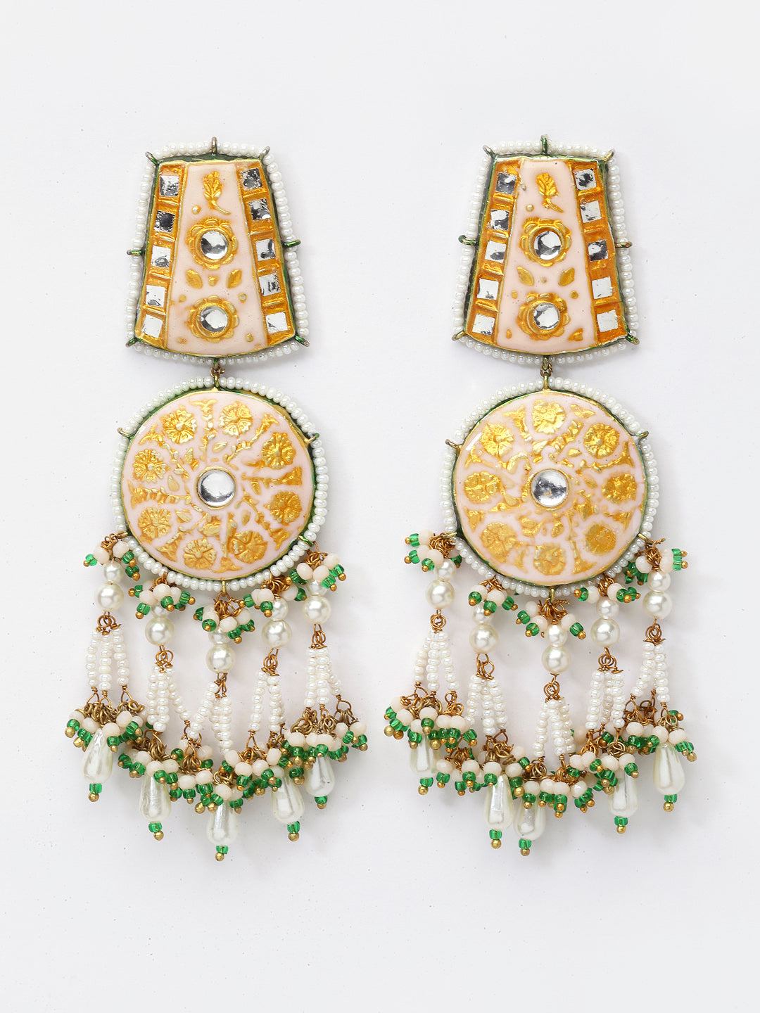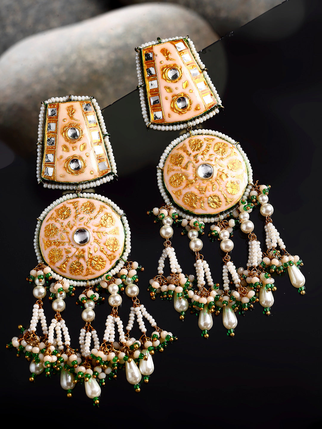 Earrings That Make U Shine Today And Always With Handmade Meenakari Earrings With This Pink And Green Effect, We Wish All U Do Is Shine Throughout.; Category Of Jewellery Is Earring; Sub Category Is Drop; Ideal For Women; Color Is Pink, Green, White, Gold; Gemstones Used - Kundan, Pearls, Natural Stones, Faux Emerald; Plating Is Gold-Plated; Base Metal Is Alloy; Other Material Used - Closure Stopper; Size Is Freesize; Adjustable - No; Weight Is 50 Gms; Mesaurements - Length Of Earring= 13 Cm; Width Of Earring =5.5 Cm; Adjustable - No; Content 1 Pair Earring