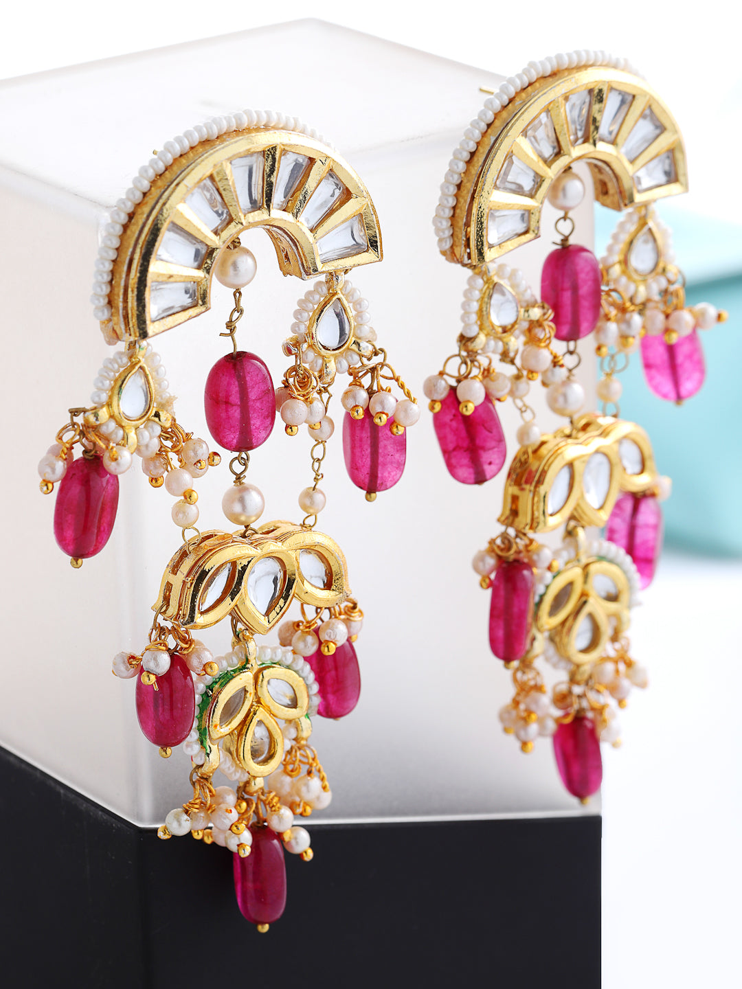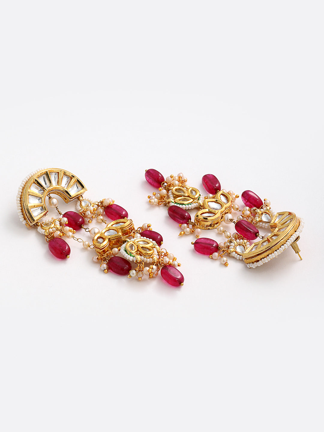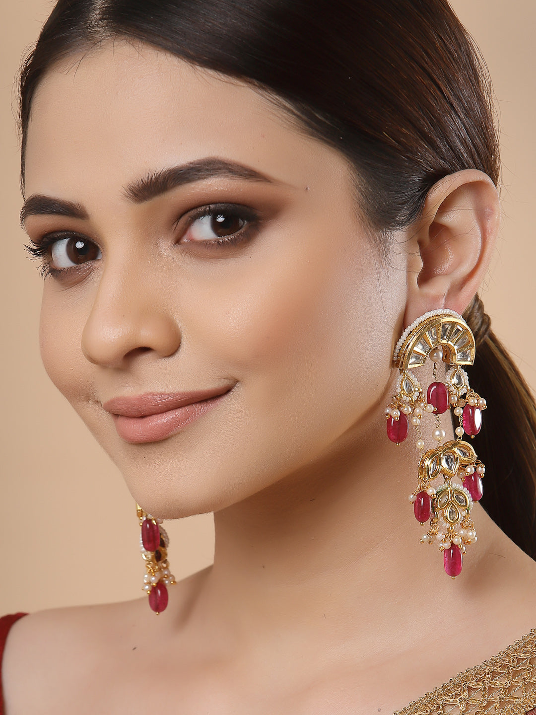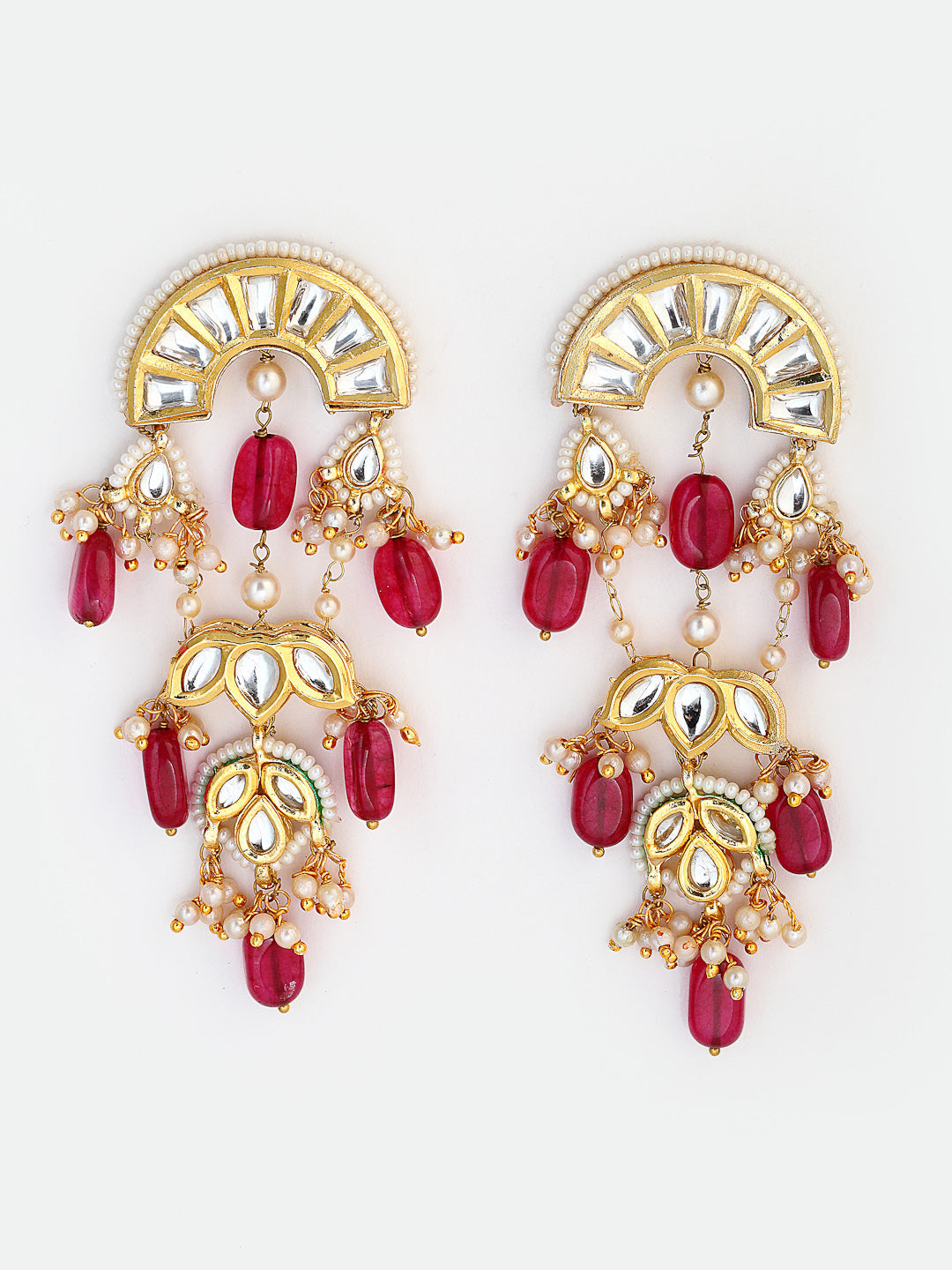 Red And Gold Is All Time Fab Color Of The Season This Festivity Shine Along With Exclusive Handmade Jewellery And Make Yourself Part Of Dugran (One Who Shines Inside Out ) Community.; Category Of Jewellery Is Earring; Sub Category Is Drop; Ideal For Women; Color Is Red, Gold, White; Gemstones Used - Kundan, Pearls, Natural Stones, Faux Ruby; Plating Is Gold-Plated; Base Metal Is Alloy; Other Material Used - Closure Stopper; Size Is Freesize; Adjustable - No; Weight Is 51 Gms; Mesaurements - Length Of Earring= 10.2 Cm; Width Of Earring =6 Cm; Adjustable - Yes; Content 1 Pair Earring