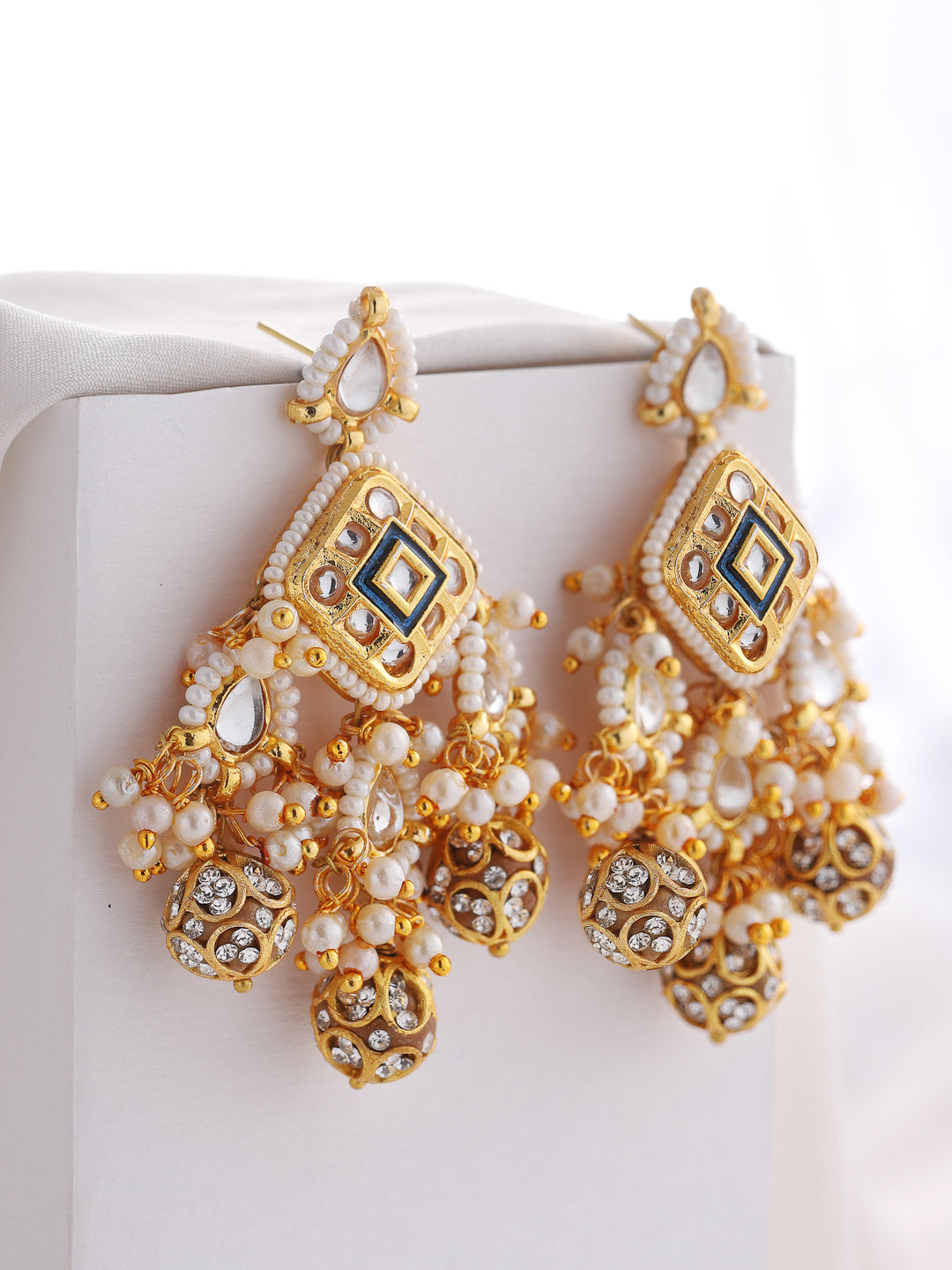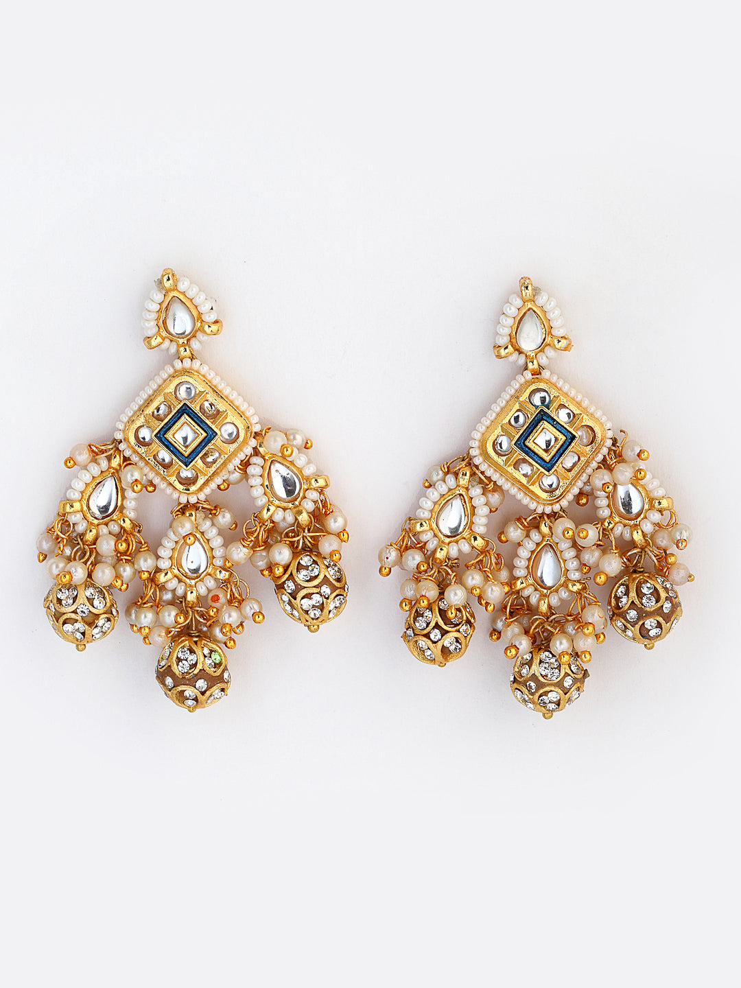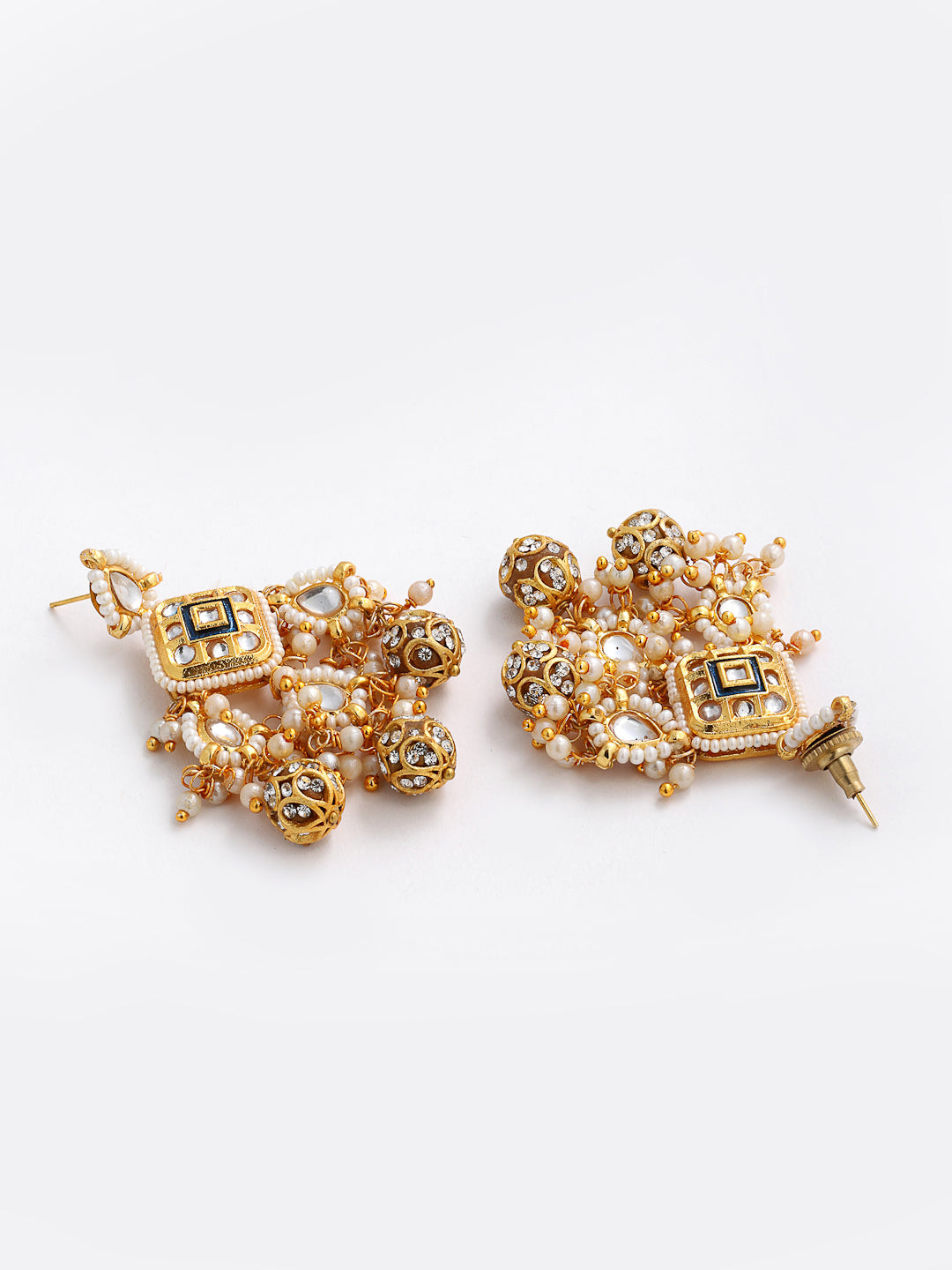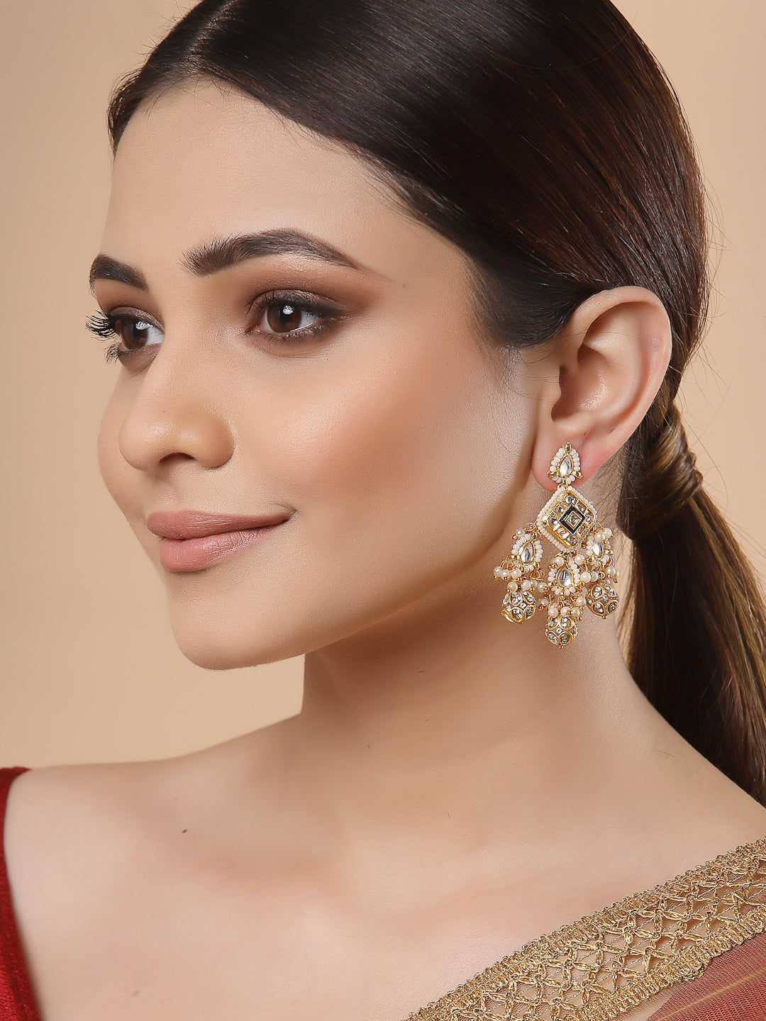 Gold And White All Time Favorite Color, The Earring Must For Any Occasion To Make U Beautiful Smart And Sunshine All Along With These Earrings.; Category Of Jewellery Is Earring; Sub Category Is Drop; Ideal For Women; Color Is Gold, White; Gemstones Used - Kundan, Pearls, Natural Stones, American Diamond; Plating Is Gold-Plated; Base Metal Is Alloy; Other Material Used - Closure Stopper; Size Is Freesize; Adjustable - No; Weight Is 27 Gms; Mesaurements - Length Of Earring= 6.3 Cm; Width Of Earring =8 Cm; Adjustable - No; Content 1 Pair Earring