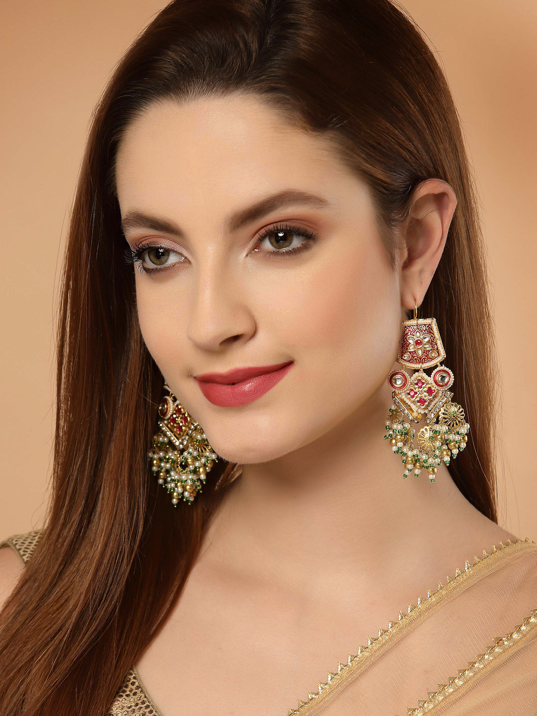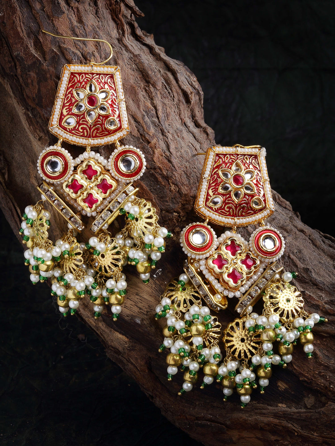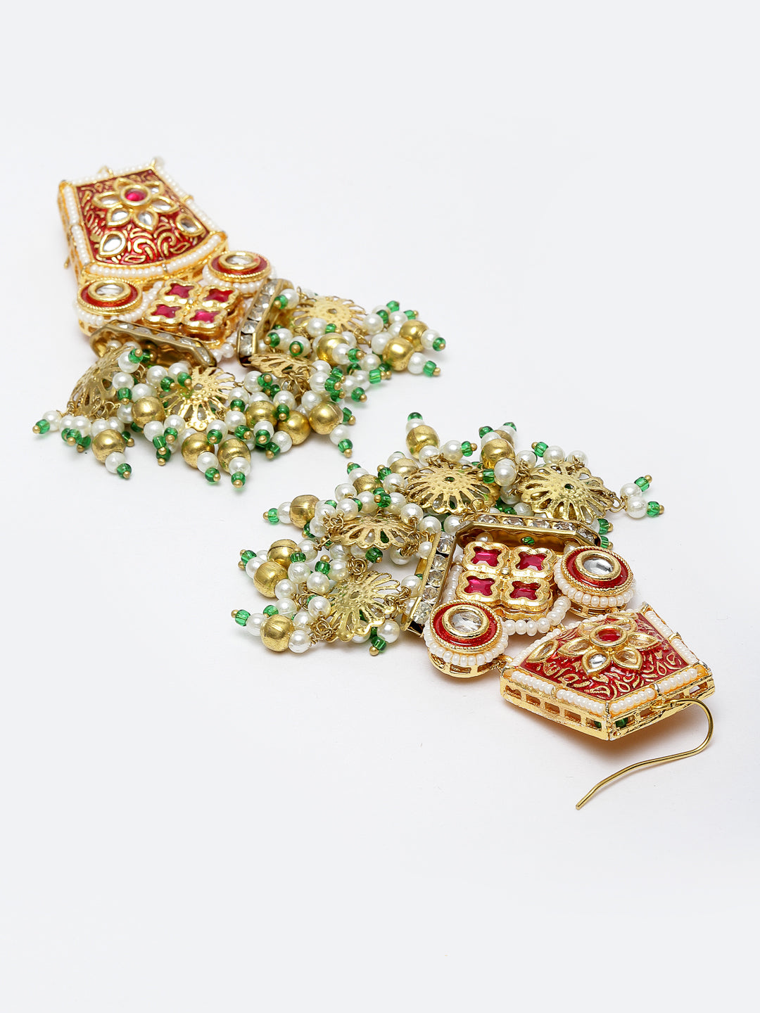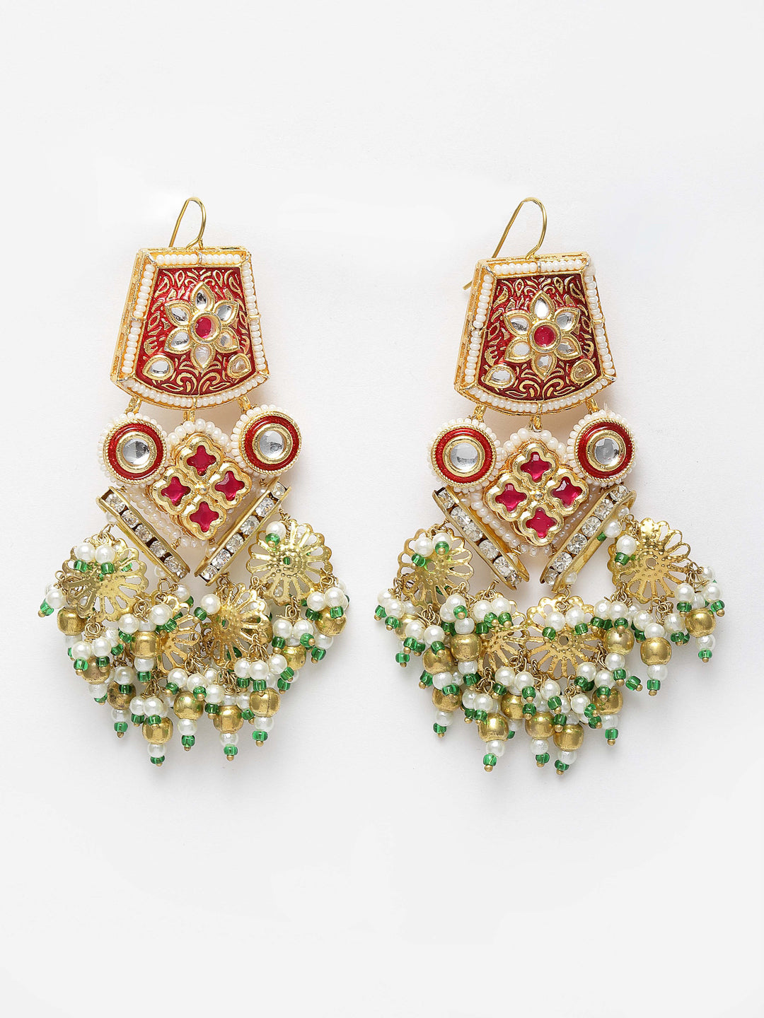 Handcrafted Kundan Earring With Semi Precious Drop Super Light And Elegant Earring Is The Classy Effect One Can Go For Anyday.; Category Of Jewellery Is Earring; Sub Category Is Drop; Ideal For Women; Color Is Red, Green, White, Gold; Gemstones Used - Kundan, Pearls, Natural Stones, Faux Ruby; Plating Is Gold-Plated; Base Metal Is Alloy; Other Material Used - None; Size Is Freesize; Adjustable - No; Weight Is 38 Gms; Mesaurements - Length Of Earring= 9.2 Cm; Width Of Earring =6.5 Cm; Adjustable - No; Content 1 Pair Earring