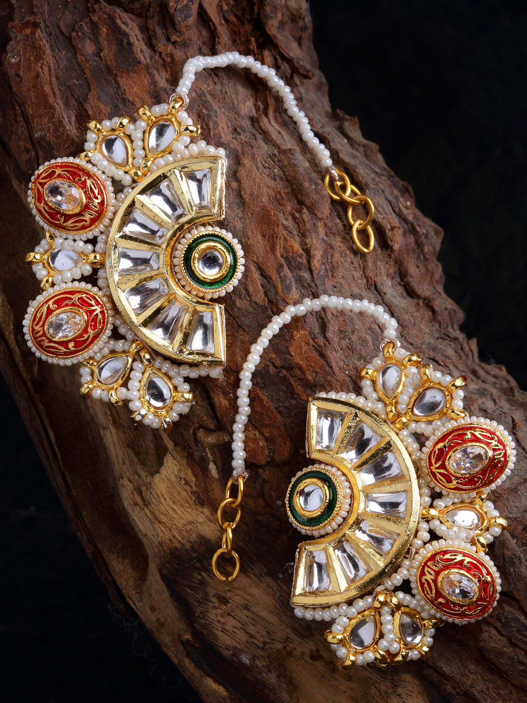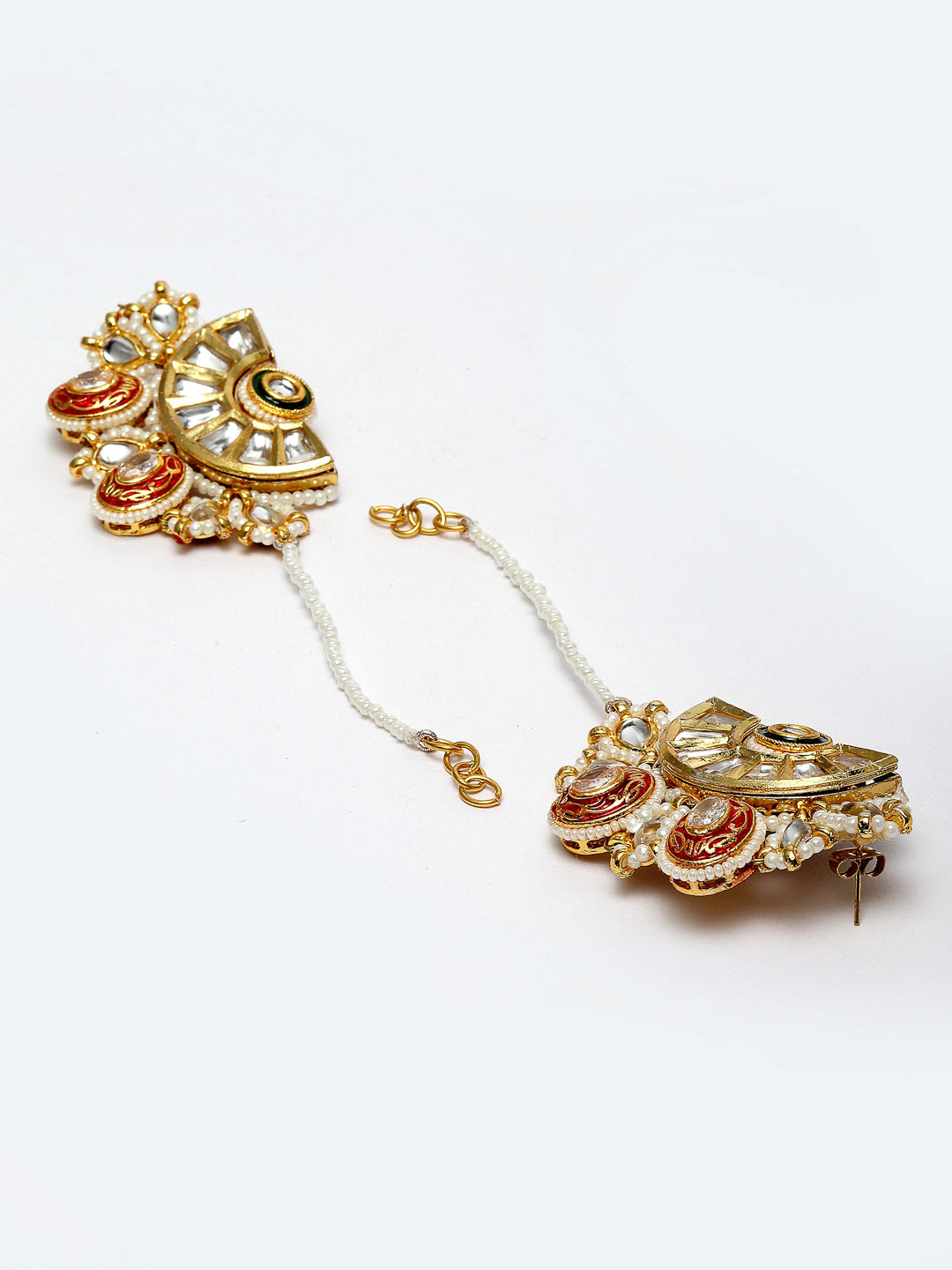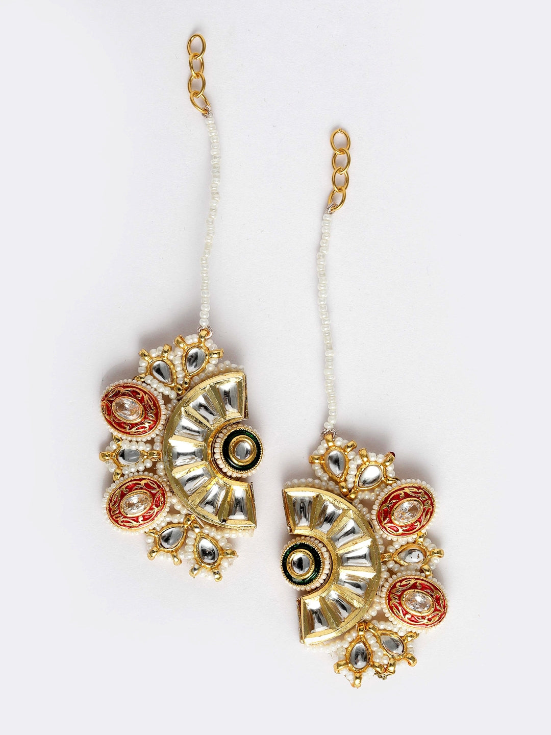 Handcrafted Surkh Samandar Drop Earring Kundan Earring Amalgamation Of Various Different Kundan Tikda To Give U Classy And Elegant Look; Category Of Jewellery Is Earring; Sub Category Is Drop; Ideal For Women; Color Is Red, Green, White, Gold; Gemstones Used - Kundan, Pearls, Natural Stones, Faux Ruby; Plating Is Gold-Plated; Base Metal Is Alloy; Other Material Used - Closure Stopper; Size Is Freesize; Adjustable - No; Weight Is 37 Gms; Mesaurements - Length Of Earring= 12.5 Cm; Width Of Earring =3.9 Cm; Adjustable - No; Content 1 Pair Earring And Kanchain