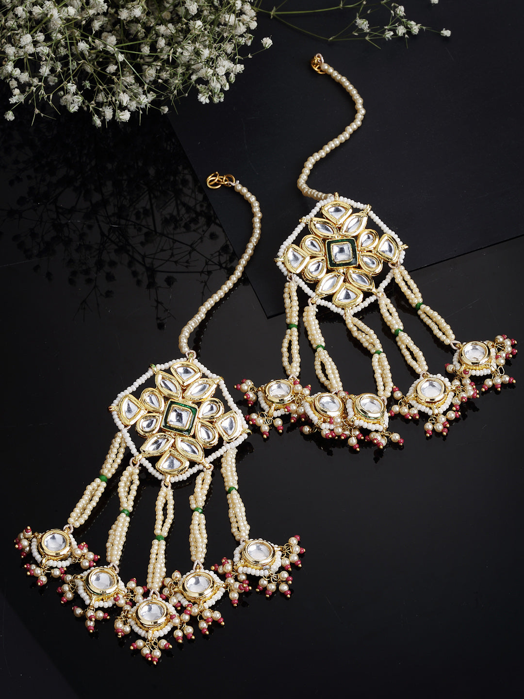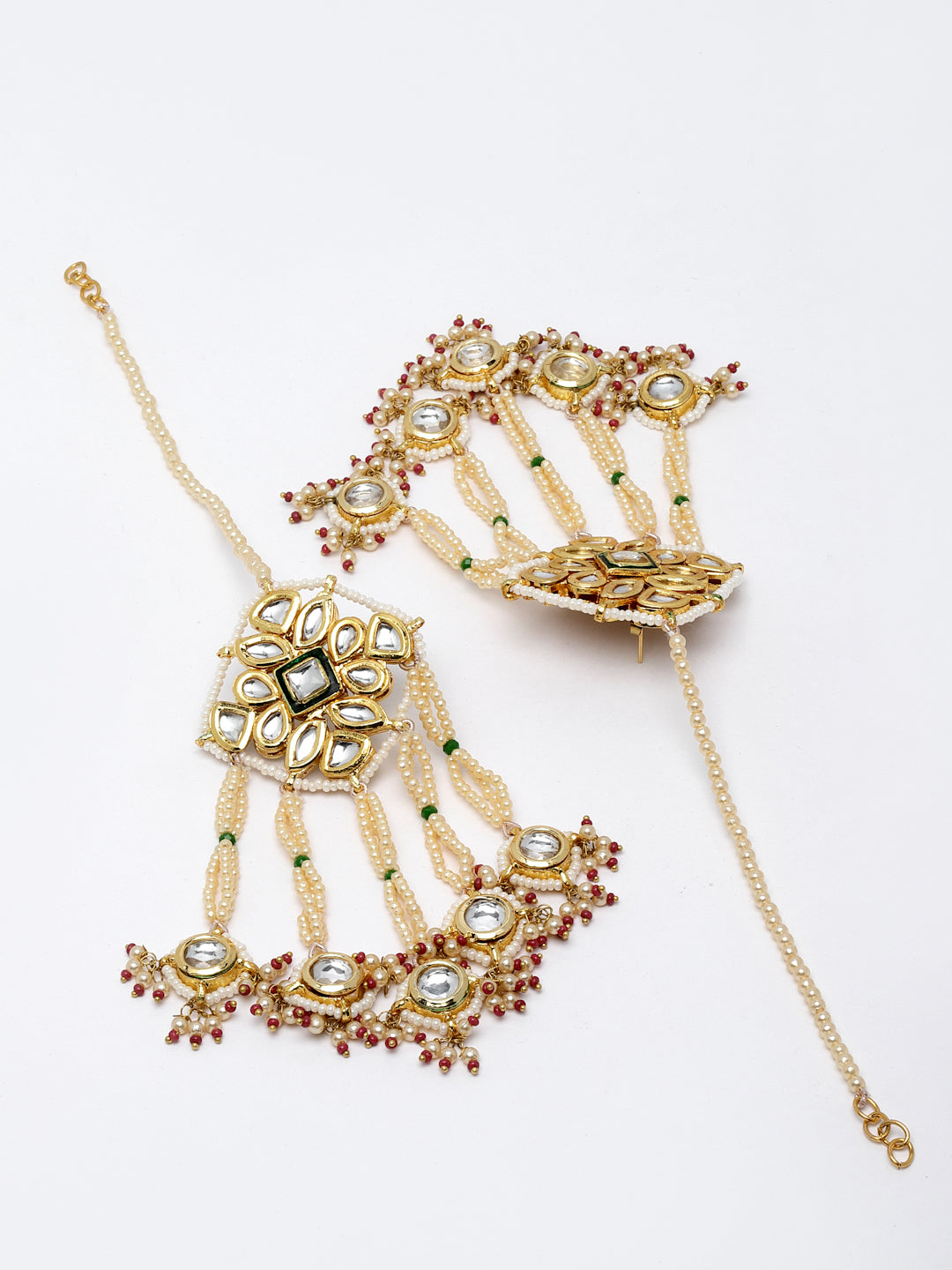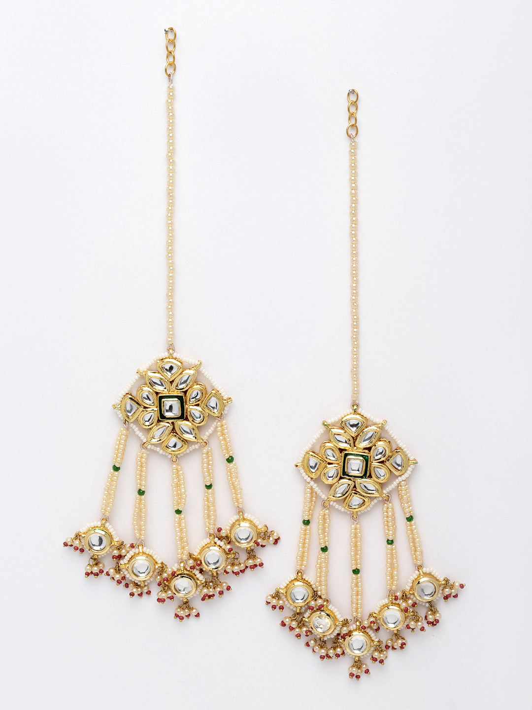Sea Shell Pearl Used Along With Kundan With Tinch Of Pink Latkans The Best Part Of This Is The Entire Earring Is Handmade Along With Kundan And Its Drop. The Style And Srtistic Effect Of All Makes It Different And Full Of Elegance.; Category Of Jewellery Is Earring; Sub Category Is Drop; Ideal For Women; Color Is Red, Gold, White; Gemstones Used - Kundan, Pearls, Natural Stones, Faux Ruby; Plating Is Gold-Plated; Base Metal Is Alloy; Other Material Used - Closure Stopper And Kanchain; Size Is Freesize; Adjustable - No; Weight Is 67 Gms; Mesaurements - Length Of Earring= 11 Cm; Width Of Earring =7.1 Cm; Length Of Kanchain =10 Cm; Width Of Kanchain = 1 Cm; Adjustable - No; Content 1 Pair Earring And Kanchain