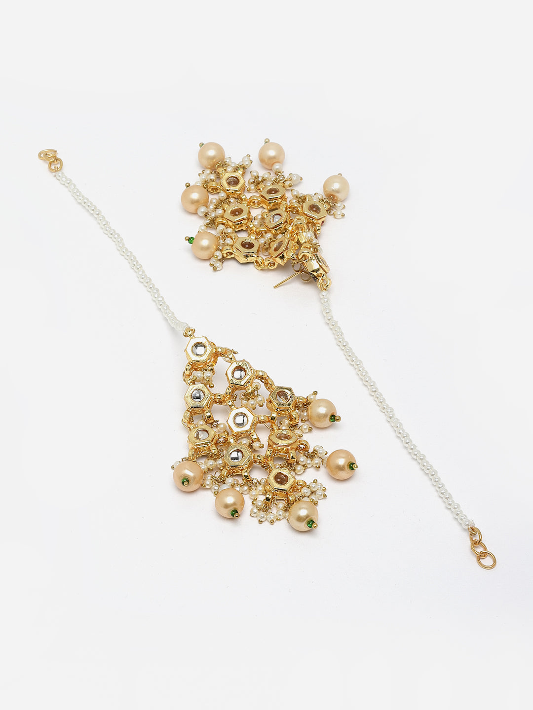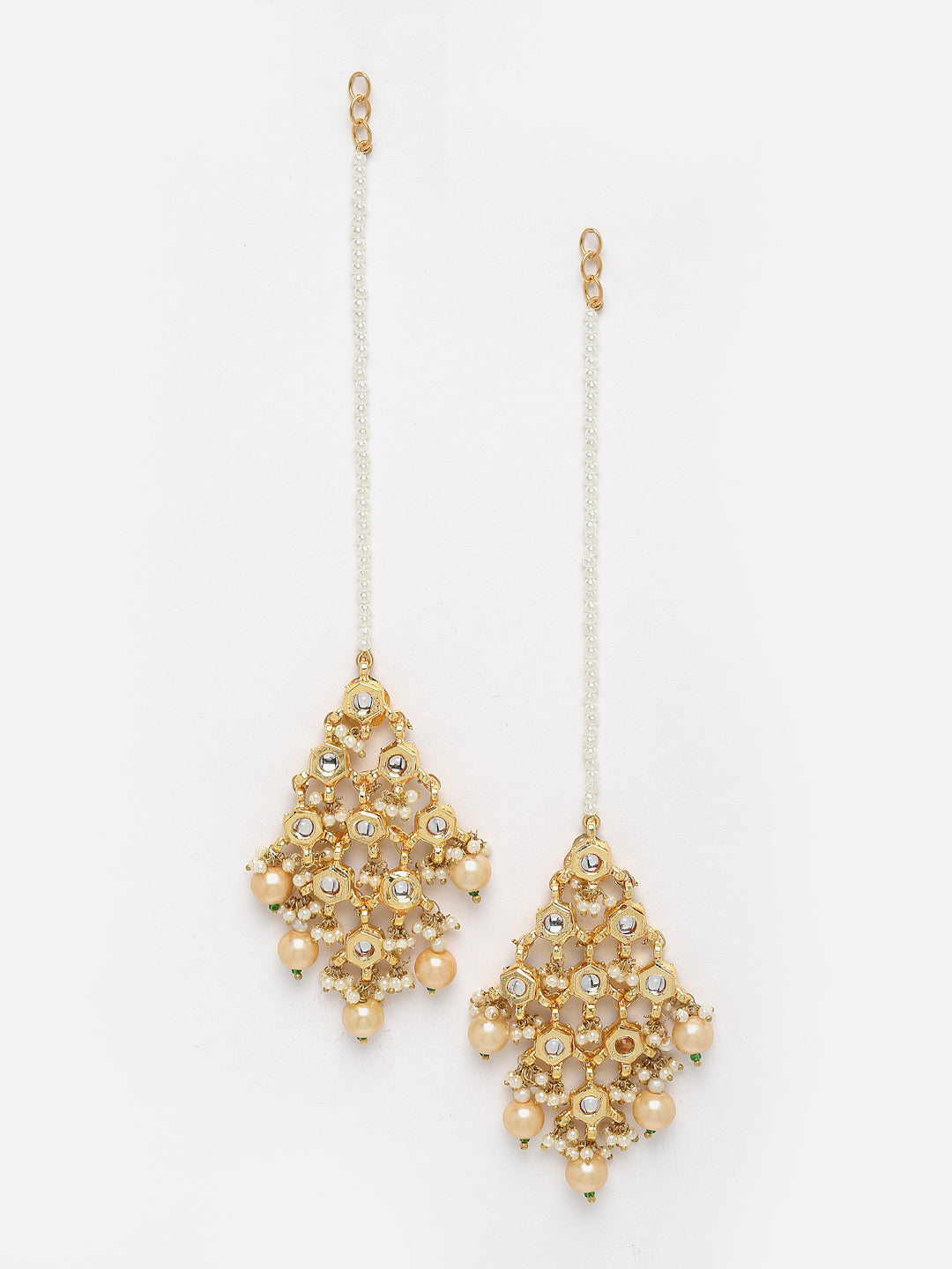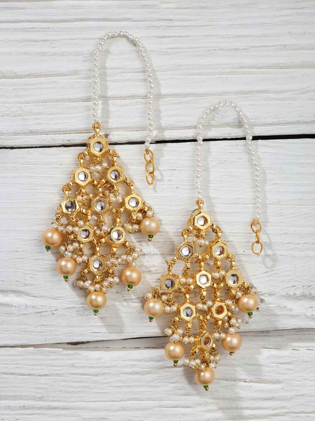 Part Of Modern Minds The Pcs Are Joined Together To Give U Elegance Of One Pc After Using Different Elements Is What Designer Wanted To Project.; Category Of Jewellery Is Earring; Sub Category Is Drop; Ideal For Women; Color Is Gold, White; Gemstones Used - Kundan, Pearls, Natural Stones; Plating Is Gold-Plated; Base Metal Is Alloy; Other Material Used - Closure Stopper And Kanchain; Size Is Freesize; Adjustable - No; Weight Is 38 Gms; Mesaurements - Length Of Earring= 8 Cm; Width Of Earring =5.3 Cm; Length Of Kanchain =10 Cm; Width Of Kanchain = 1 Cm; Adjustable - No; Content 1 Pair Earring And Kanchain